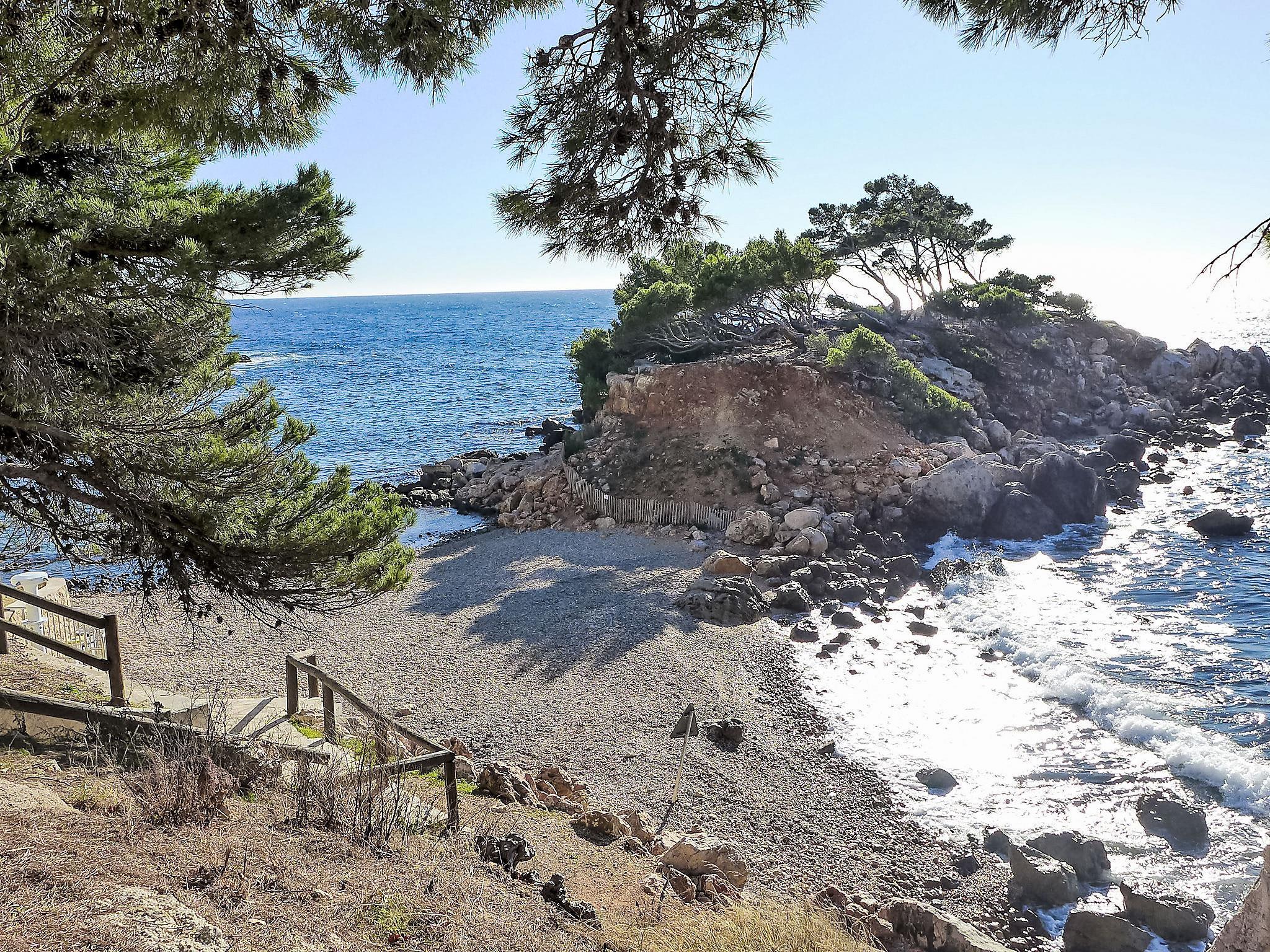 Residence "La Calanque d'Or", 4 storeys. In the district of Pierreplane, 1.5 km from the centre of Bandol, 50 m from the sea, in a cul-de-sac, in the countryside. Grocery 600 m, restaurant 20 m, bus stop "Arrêt Casino" 2.1 km, railway station "Gare de Bandol" 1.6 km, sandy beach "Renecros" 1 km, shingle beach "Capélan" 50 m. Sports harbour 2.5 km, golf course (18 hole) 5 km, tennis 400 m. Hiking paths: Sainte Baume, Sainte Victoire, Calanque, Port-Cros, Porquerolles. Ile verte, Embiez, Figuerolles, Cassis. Residence with electric gates. The keys‘ handover takes place by the agency Interhome in Saint Cyr Sur Mer, 9 km. The residence is situated in the middle of a pine forest overlooking the sea. Buildings accessible by stairs. Note: the beaches distances are made on foot.
