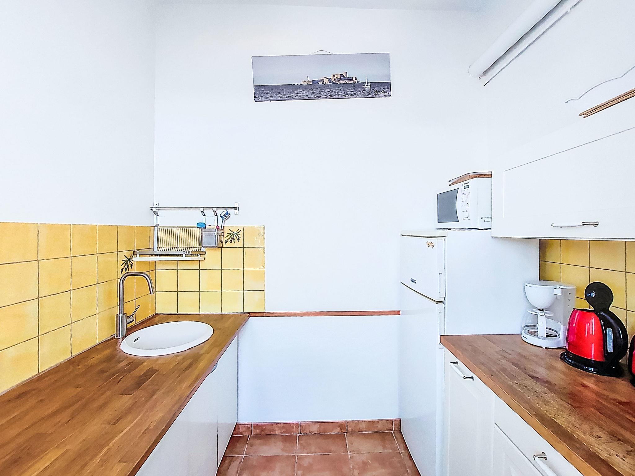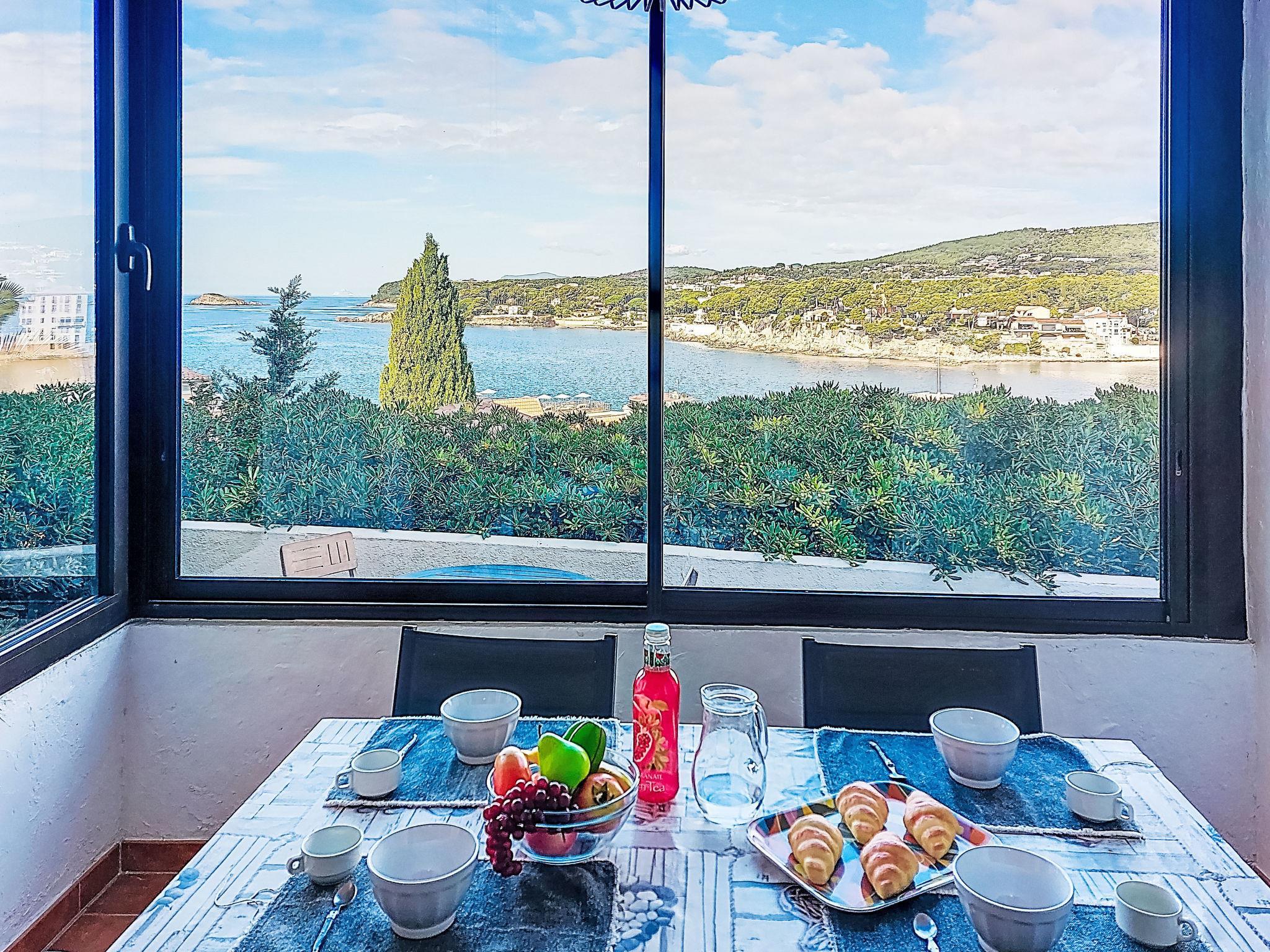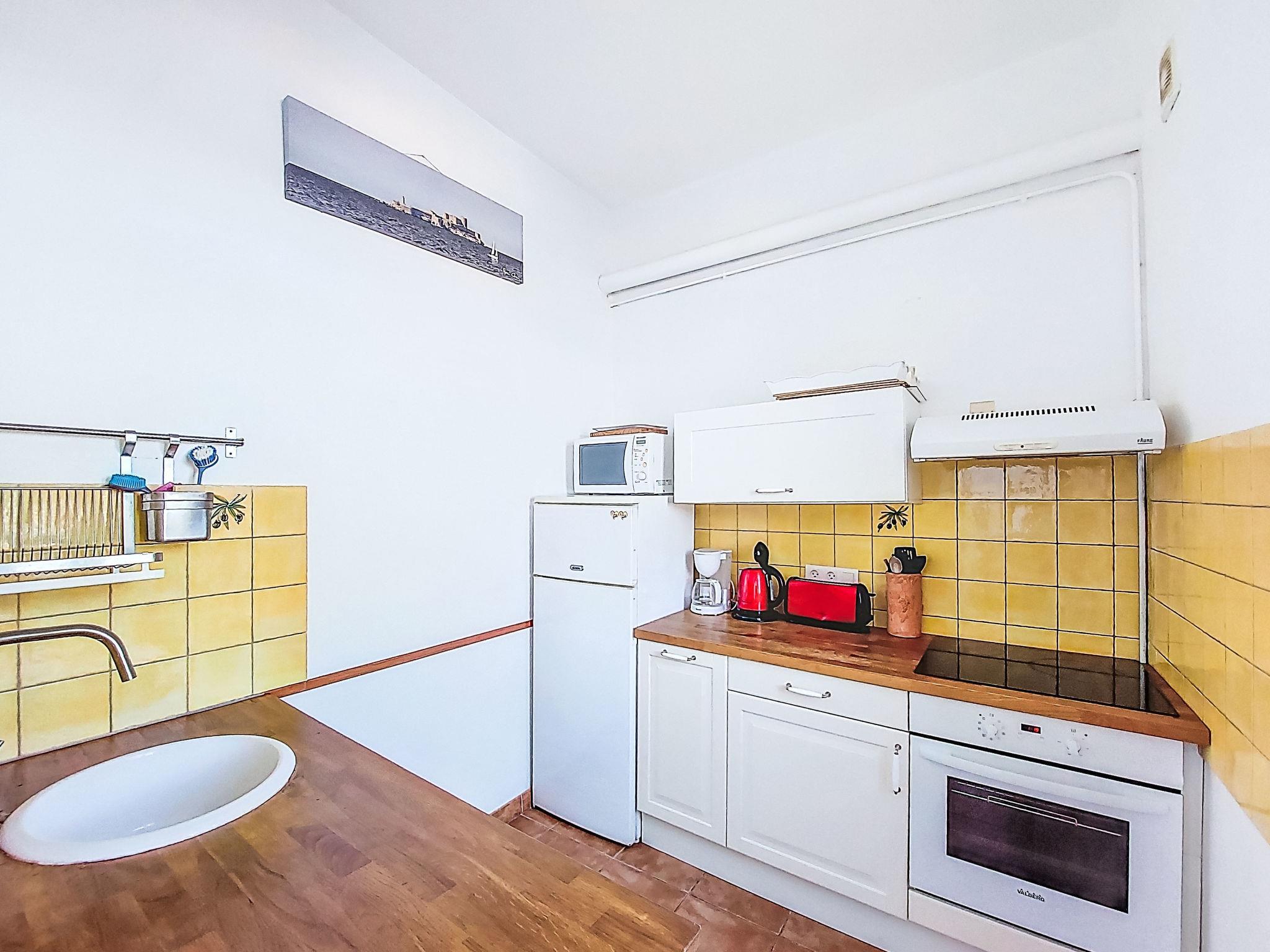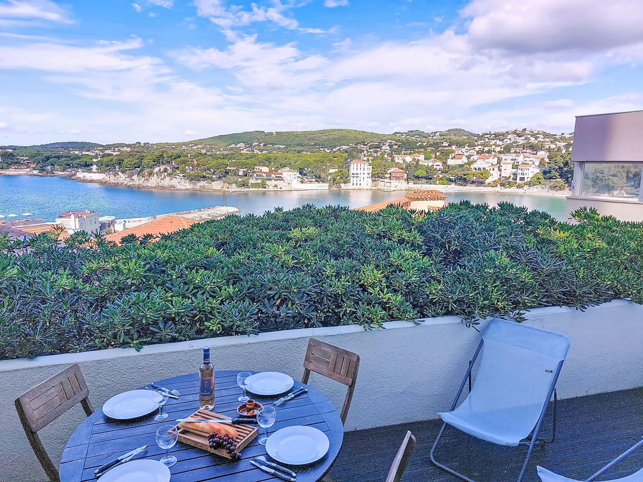 3-room apartment 48 m2, on the ground floor. Bright, partly renovated in 2023, comfortable furnishings: living/dining room with TV (flat screen), fan. 1 room with 1 french bed (1 x 160 cm, length 200 cm). 1 room with 1 x 2 bunk beds (80 cm, length 200 cm). Open kitchen (oven, dishwasher, 3 ceramic glass hob hotplates, toaster, kettle, freezer, electric coffee machine, combination microwave). Exit to the terrace. Shower, sep. WC. Electric heating. Terrace 18 m2, north-west facing position. Terrace furniture, electric barbecue. Marvellous panoramic view of the sea. Facilities: washing machine, iron, baby cot for up to 2 year olds. Internet (WiFi, free). Please note: maximum 1 small pet/ dog allowed. TV only FR. Smoke alarm. Parking spaces in the residence are limited. Access to the terrace is down 3 steps. Offer by a private individual according to Art. 155, IV of CGI.