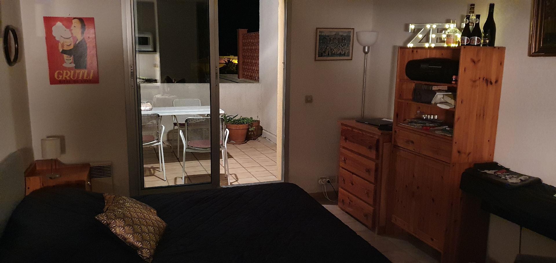 The studio with 31m² of living space is on a slope in a big and imaginatively-built apartment complex, Les Hauts du Fontaule, which was built in 1992, with stairs and archways throughout. The apartment is white, with brown tiled floors, and consists of a room with a cooking niche, a bathroom and a big terrace. The bathroom has a toilet, shower and washbasin. The kitchen is conveniently equipped with two cooking rings, a microwave, a coffee machine and a sink. There is ample crockery and some herbs, tea, pasta and rice are provided in the pantry. There is also a fridge with a freezer compartment.