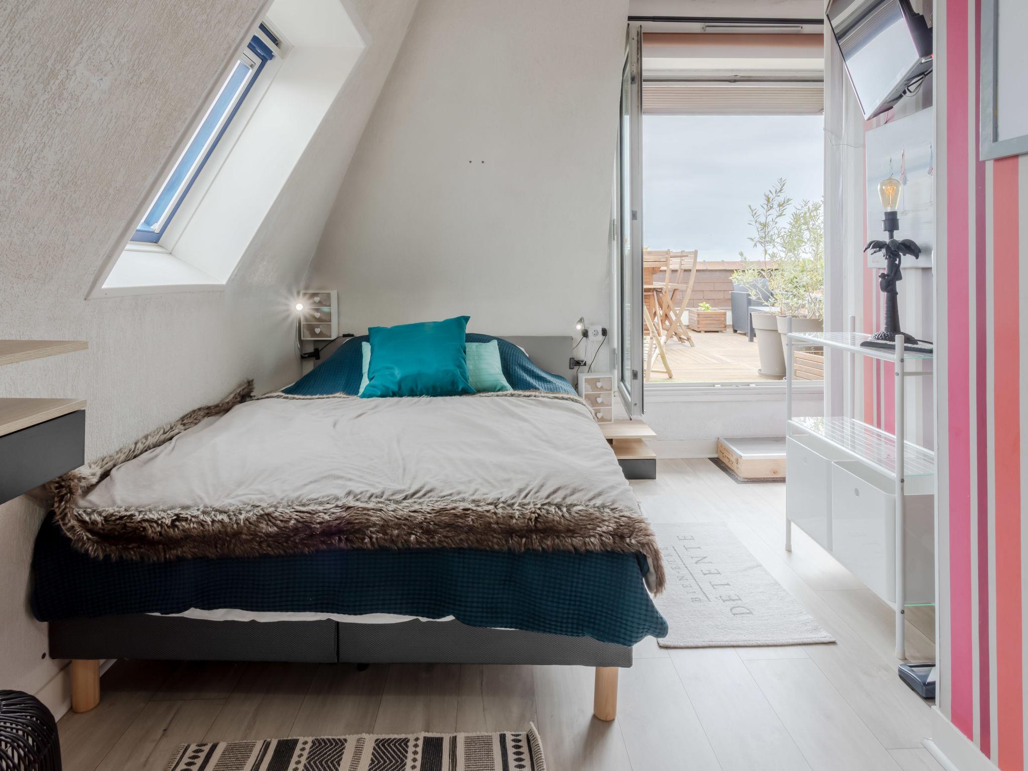 2-room apartment 34 m2 on 2 levels on 4th floor, south-west facing position. Living/dining room with 1 double sofabed (140 cm, length 190 cm), TV (flat screen), radio and CD-player. Open kitchen (dishwasher, 2 ceramic glass hob hotplates, freezer, electric coffee machine, Capsules for coffee machine (NESPRESSO) extra, combination microwave). Shower, sep. WC. Electric heating. Upper floor: (spiral staircase), 1 room with 1 french bed (140 cm, length 190 cm), TV (flat screen). Exit to the terrace, south-west facing position. Parquet floors. Terrace 16 m2, south-west facing position. Terrace furniture. Very beautiful view of the sea. Facilities: Internet (WiFi, free). Parking space n 25 (roofed). Please note: smoke alarm. Terrace accessible only from the upstairs bedroom. Residential construction work 50 meters away. Offer by a private individual according to Art. 155, IV of CGI.