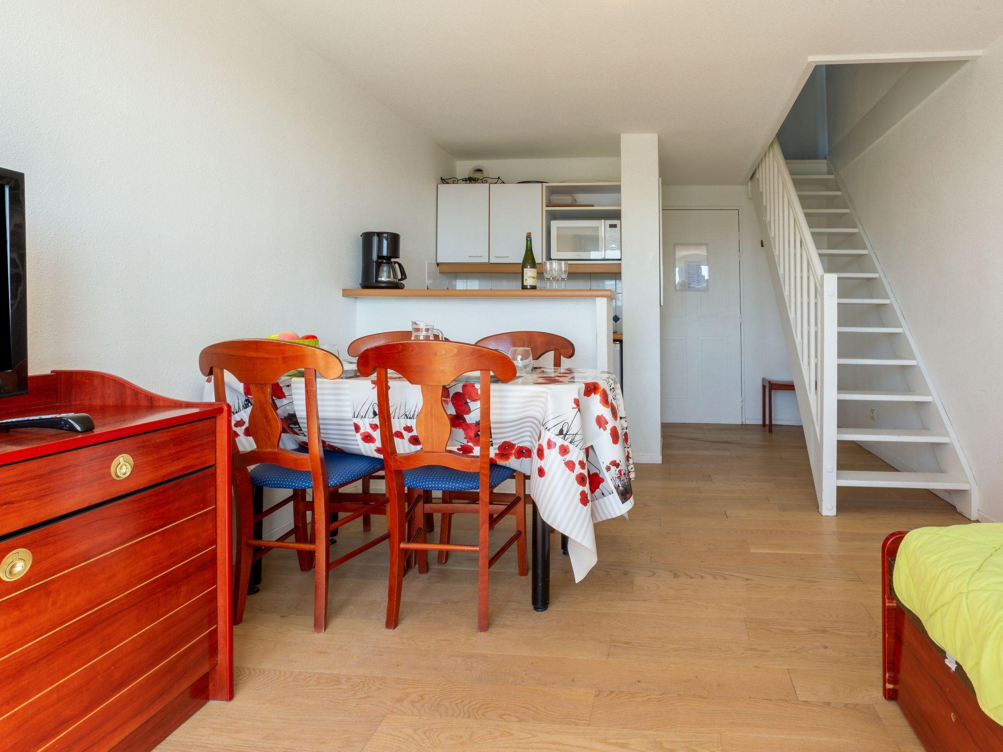 3-room apartment 42 m2 on 2 levels on 2nd floor, north-west facing position. Living/dining room with 1 pull-out bed (2 pers. 2 x 90 cm, length 190 cm), TV (flat screen). Exit to the balcony. Kitchenette (2 hot plates, dishwasher, toaster, microwave, electric coffee machine) with bar. Sep. WC. Electric heating. Upper floor: 1 room with 1 french bed (1 x 140 cm, length 190 cm). 1 room with 2 beds (90 cm, length 190 cm). Exit to the balcony. Bathroom, sep. WC. Balcony 3 m2, terrace 10 m2. Terrace furniture. Distant view of the sea and the river. Facilities: iron. Internet (WiFi, extra). Parking space n 02 (roofed). Please note: maximum 1 pet/ dog allowed. Smoke alarm.