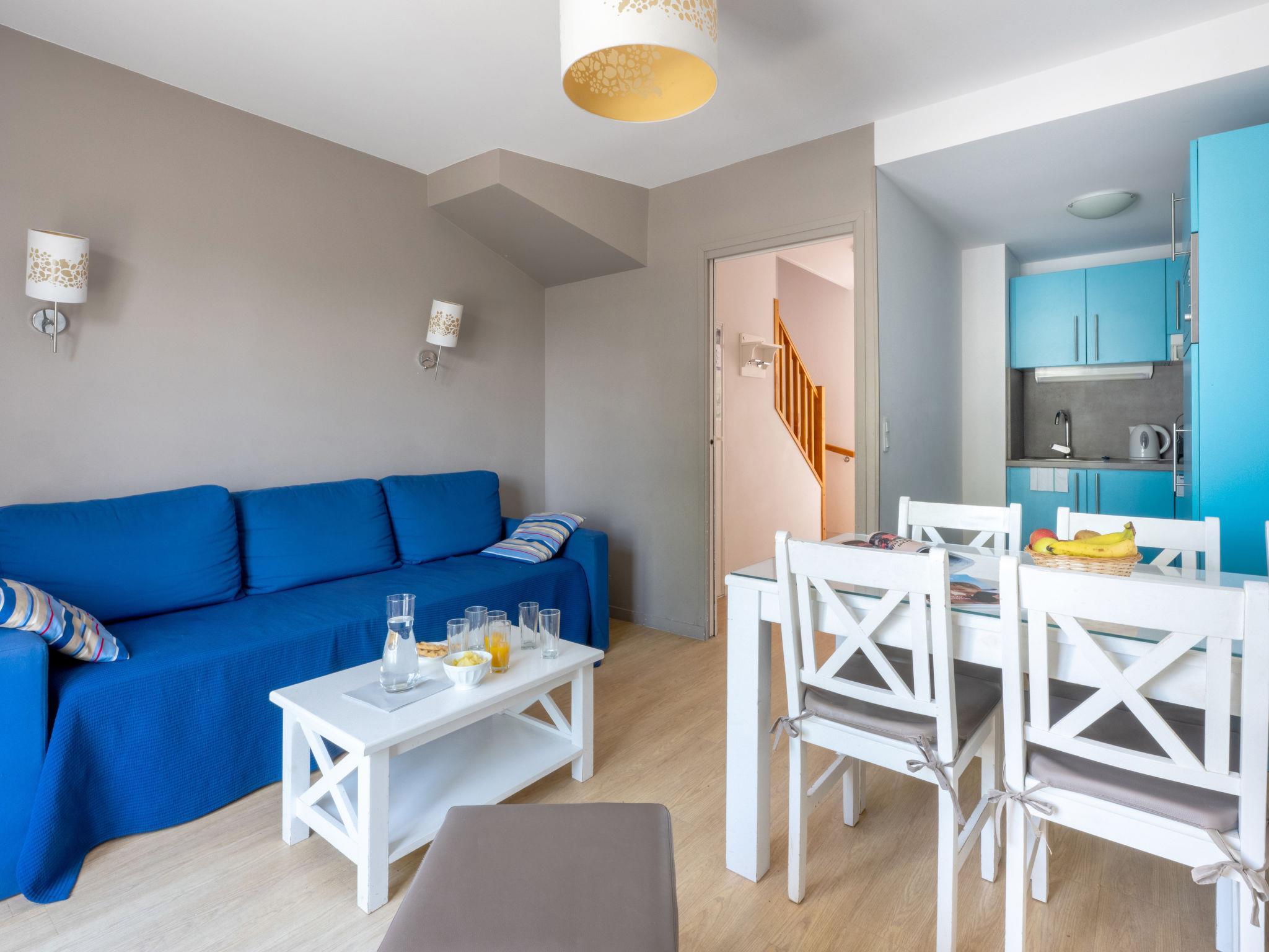 "Odalys Référence Le Domaine des Dunettes", 3-room apartment 42 to 44 m2. Practical furnishings: living/sleeping room with 2 beds (90 cm), dining table and TV. 1 room with 1 french bed. 1 room with 2 beds. Kitchenette (dishwasher, 2 ceramic glass hob hotplates, kettle, microwave, electric coffee machine). Shower/WC. Electric heating. Balcony or terrace. Terrace furniture, balcony furniture. Facilities: children's high chair, baby cot (extra). Internet (WiFi, free). Please note: non-smokers only. Maximum 2 pets/ dogs allowed. Fire extinguisher. The following constellation is also possible: From the living room stairs to the upper floor (sloping roof): bedroom with double bed. Double bedroom. Bath or shower with double washbasin and towel dryer. Sep.WC. In some cases also shower/WC possible.