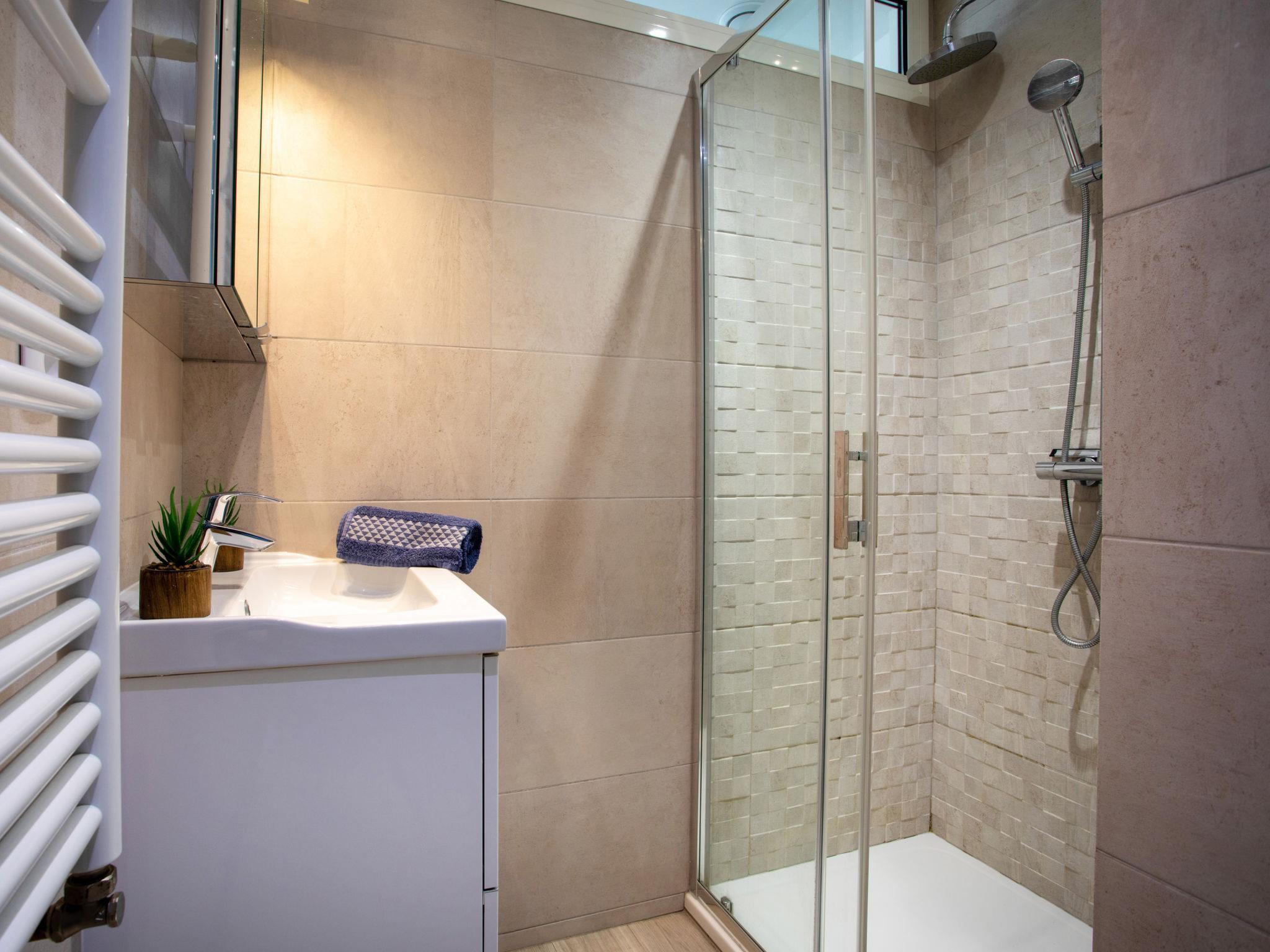 1-room studio 35 m2 on 5th floor, east facing position. Bright, beautiful and modern furnishings: living/dining room with panoramic window with 1 sofabed (140 cm, length 190 cm), TV (flat screen), air conditioning. Exit to the terrace. Alcove with 1 french bed (160 cm, length 200 cm). Open kitchen (oven, dishwasher, 4 ceramic glass hob hotplates, toaster, kettle, electric coffee machine, Capsules for coffee machine (NESPRESSO) extra). Exit to the terrace. Shower, sep. WC. Heating. Terrace 8 m2, east facing position. Side view of the sea and the mountains. Facilities: washing machine, iron, hair dryer. Internet (WiFi, free). Parking space n 5 (1 car). Please note: smoke alarm. Instead of an enclosed bedroom, some sleeping areas are located in an open-plan area (gallery, alcove, etc.). 06027003640SB