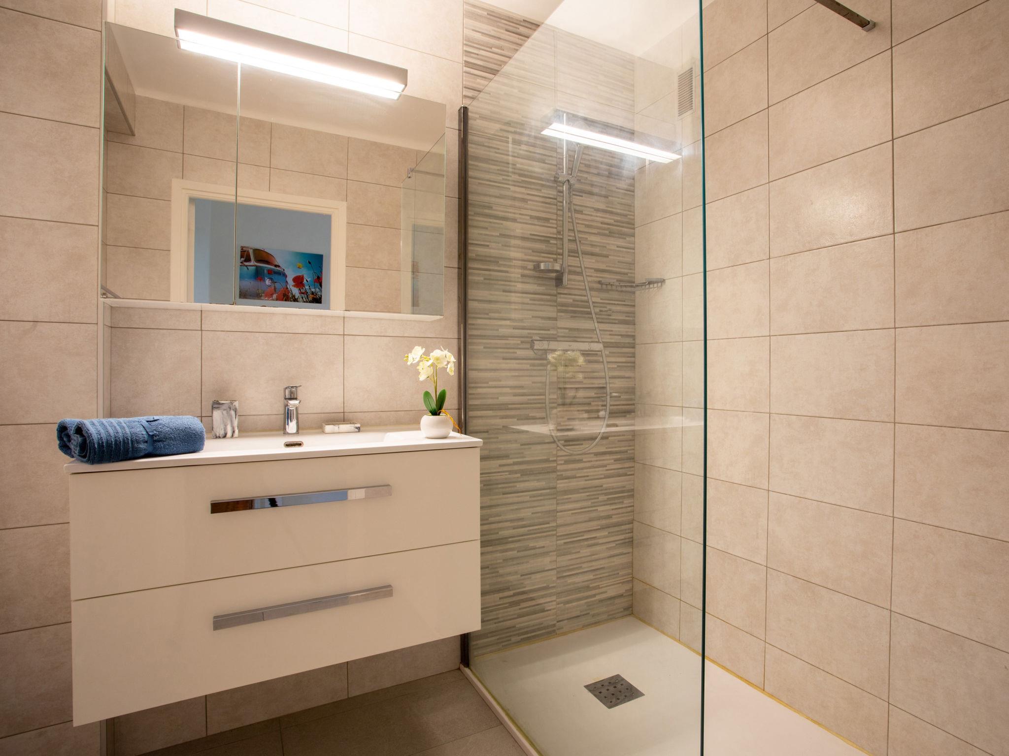 2-room apartment 50 m2 on 5th floor, east facing position. Comfortable furnishings: living/dining room with 1 double sofabed (1 x 140 cm, length 190 cm), TV (flat screen). Exit to the terrace. 1 room with 1 french bed (1 x 140 cm, length 190 cm). Exit to the terrace. Kitchen (3 hot plates, dishwasher, toaster, kettle, microwave, electric coffee machine). Exit to the terrace. Shower, sep. WC. Heating. 2 terraces 10 m2, east facing position and west facing position. Terrace furniture. Beautiful view of the sea, the mountains and the resort. Facilities: washing machine, iron, hair dryer. Internet (WiFi, free). Garage space n 77 (1 car). Please note: non-smokers only. Maximum 1 pet/ dog allowed. Smoke alarm. Offer by a private individual according to Art. 155, IV of CGI. 06027029322AK