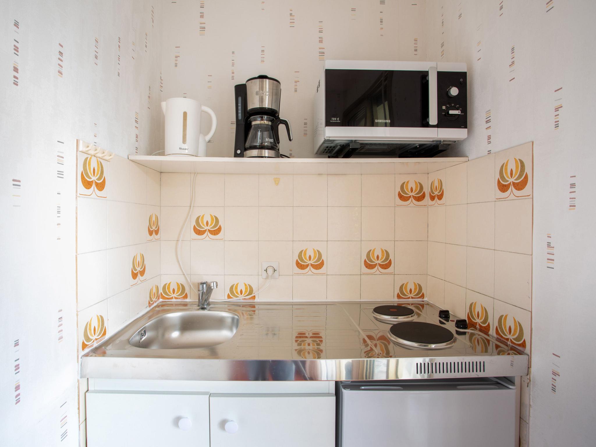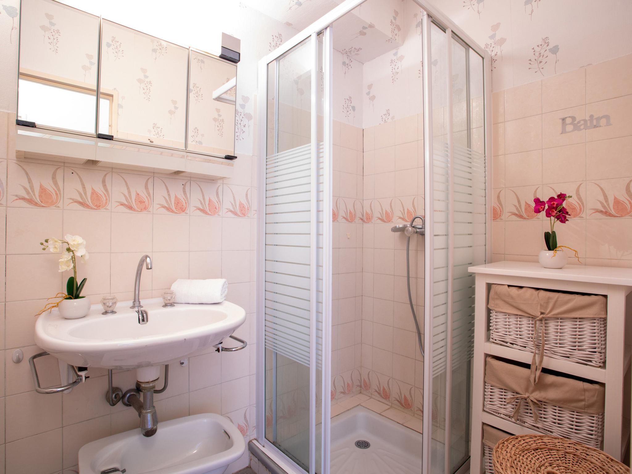 1-room apartment 25 m2 on 1st floor. Simple furnishings: living/dining room with 1 double sofabed (1 x 140 cm, length 190 cm), TV (flat screen). Exit to the terrace. Kitchenette (2 hot plates, kettle, microwave, electric coffee machine). Exit to the terrace. Shower/WC. Heating. Large terrace 11 m2, south facing position. Terrace furniture. Facilities: Internet (WiFi, extra). Garage (1 car). Please note: parking space for small car only. Smoke alarm. 06027028471DP