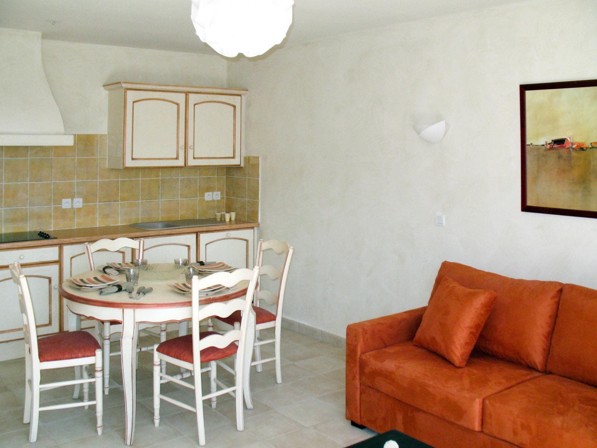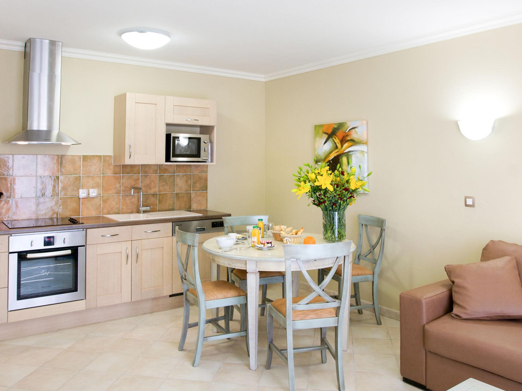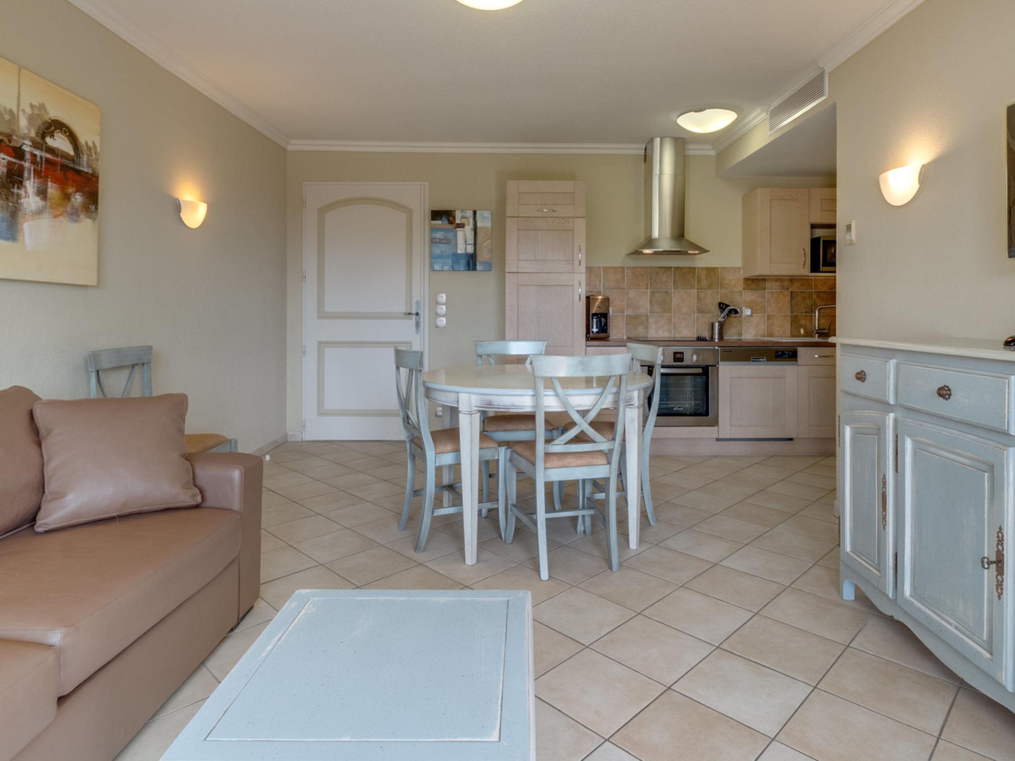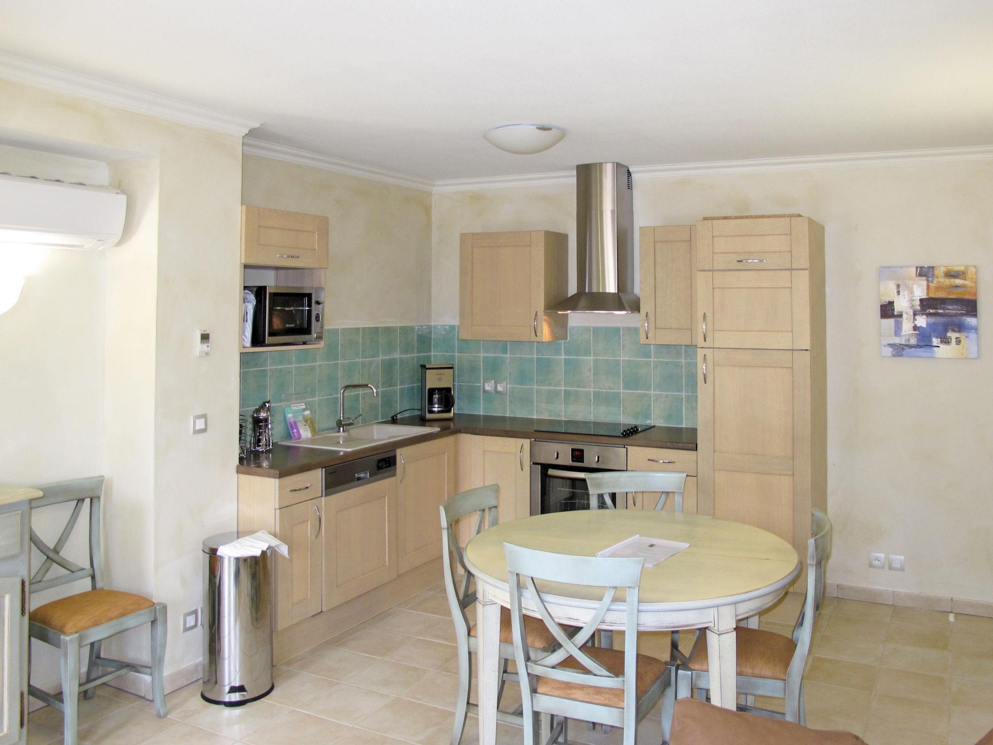 "Domaine de Camiole", 3-room apartment 46 m2. Tasteful furnishings: living/sleeping room with 1 double sofabed, dining table and satellite TV. 1 room with 1 french bed. 1 room with 2 sleeping facilities. Open kitchen (oven, dishwasher, 4 ceramic glass hob hotplates, microwave, electric coffee machine). Sep. WC, bath or shower. Heating, air-conditioning. Balcony. Balcony furniture. Facilities: Internet (WiFi, free). Please note: non-smokers only. Maximum 1 pet/ dog allowed. Smoke alarm, fire extinguisher.