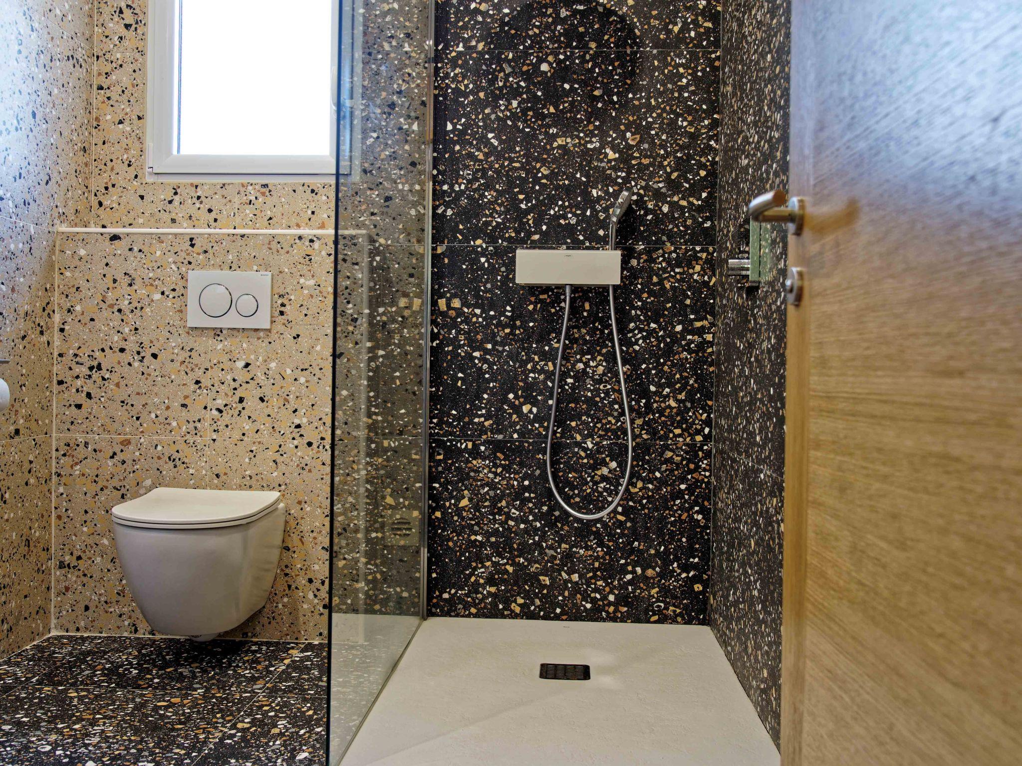 A beautiful bathroom with shower, wall-hung WC and bathroom cabinet.