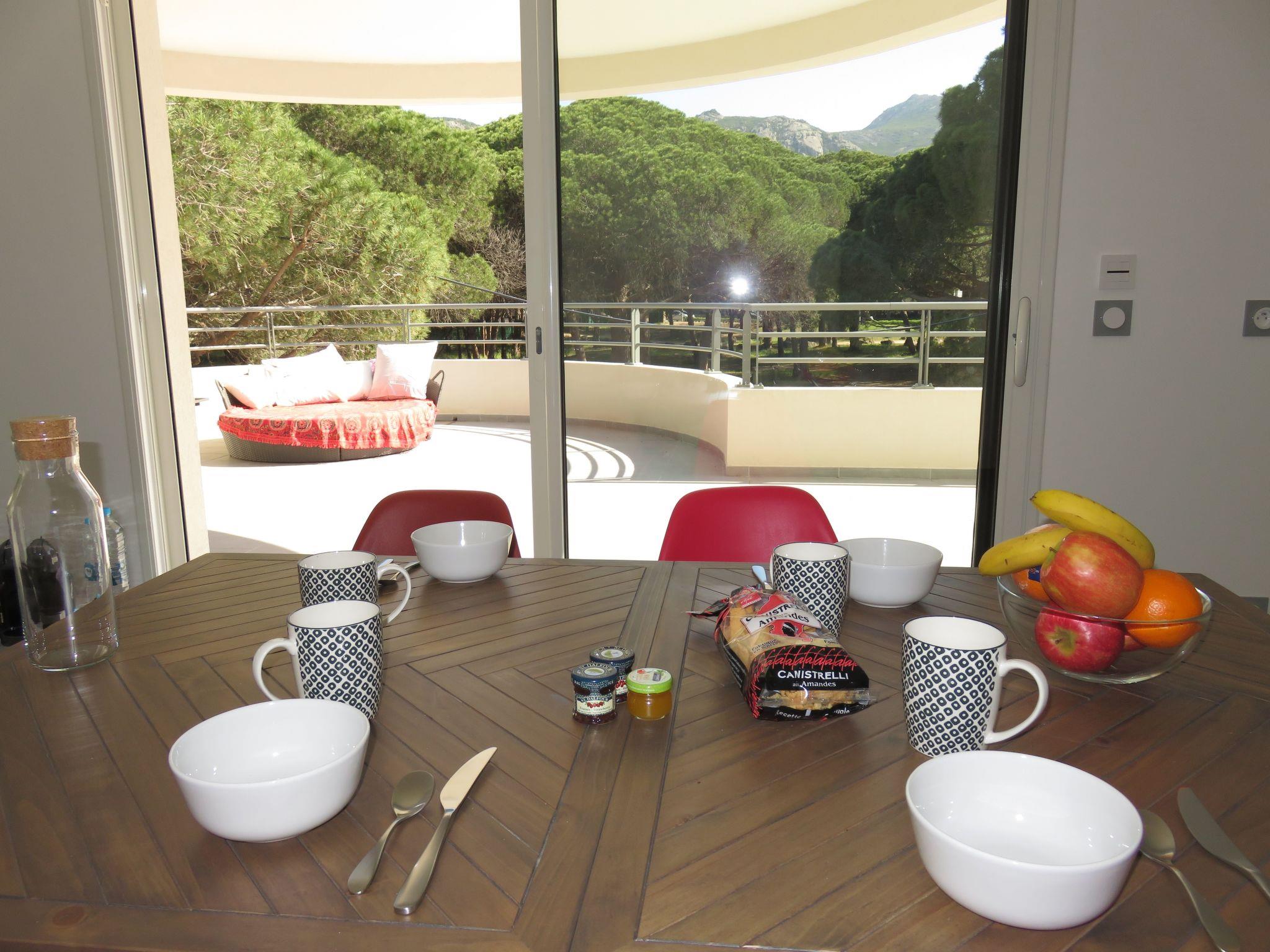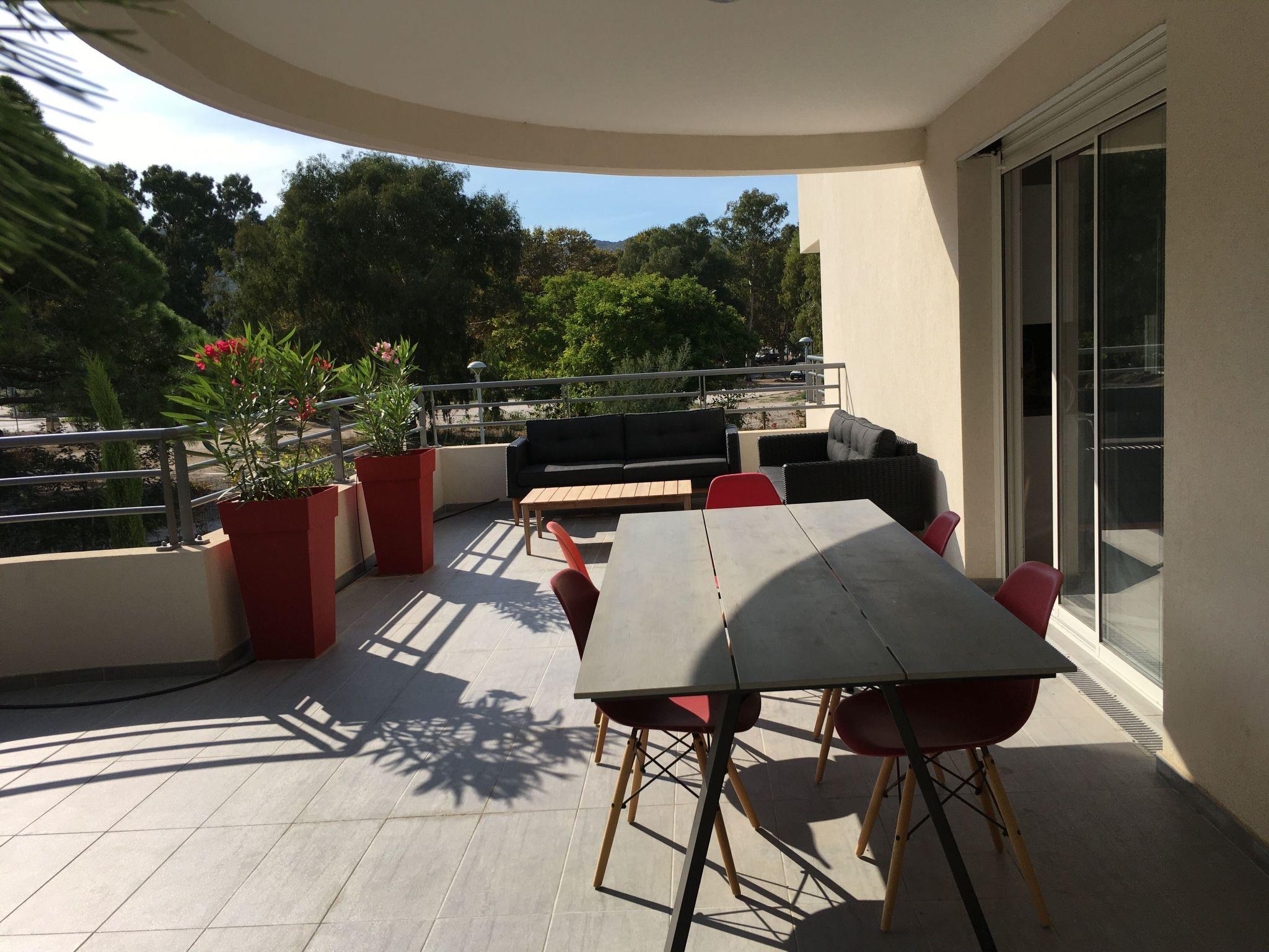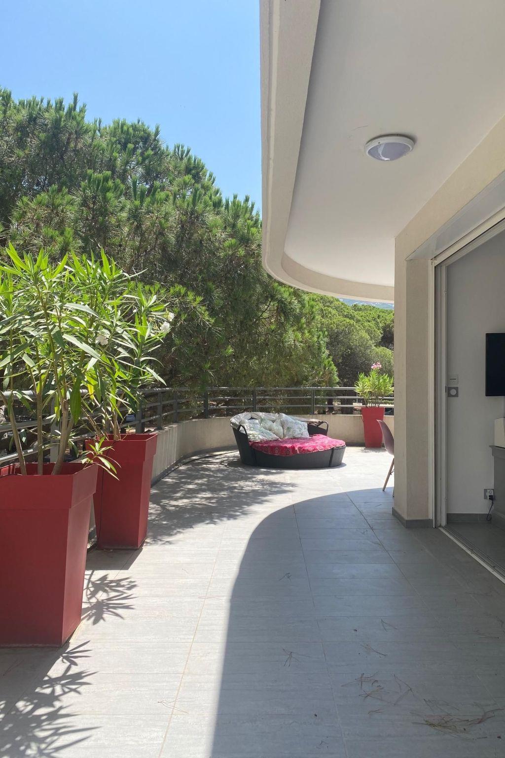 Ideal location in the pine forest, 150 metres from the beach, with no road to cross. A supermarket and shops are 50 metres from the residence. The beach train stops 150 metres away. The airport is a 5-minute drive away (no noise pollution). The port of Calvi is 2 minutes away by car, or a 15-minute walk along the seafront via a promenade through the pine forest.Magnificent new luxury design flat, Les Rivages de Calvi residence, ideally located in the pine forest 150 metres from the beach, with no road to cross.The 85m2 flat is on the 1st floor (lift), surrounded by 100m2 of terraces that give the feeling of having no neighbours, with views of the pine forest and mountains. Air conditioning in all rooms, wifi, two parking spaces.-2 shower rooms+wc, 2 hairdryers- 3 large bedrooms opening onto the terraces (one bedroom with 160x200 beds, one bedroom with 180x200 bed, one bedroom with two 90x200 or 180x200 beds), all air-conditioned- 2 cots and high chair-1 bedroom/cabin with 90x190 cm bunk beds (air-conditioned and with window)-fully equipped living room/kitchen: induction hob, oven, microwave, capsule coffee maker, dishwasher, washing machine, Netflix TV. Air-conditioned - terrace with furniture: 2 sofas and coffee table, round garden furniture, 2 deckchairs, table and chairs, electric griddle - optional concierge service at extra cost: hire of sheets and towels (not provided), cleaning, baby sitting, shopping. Car-free stay possible: Calvi airport 5 minutes away (taxi, bus), Ile Rousse port 20 minutes away, shops nearby, less than 15 minutes' walk from Calvi town centre along the seafront.