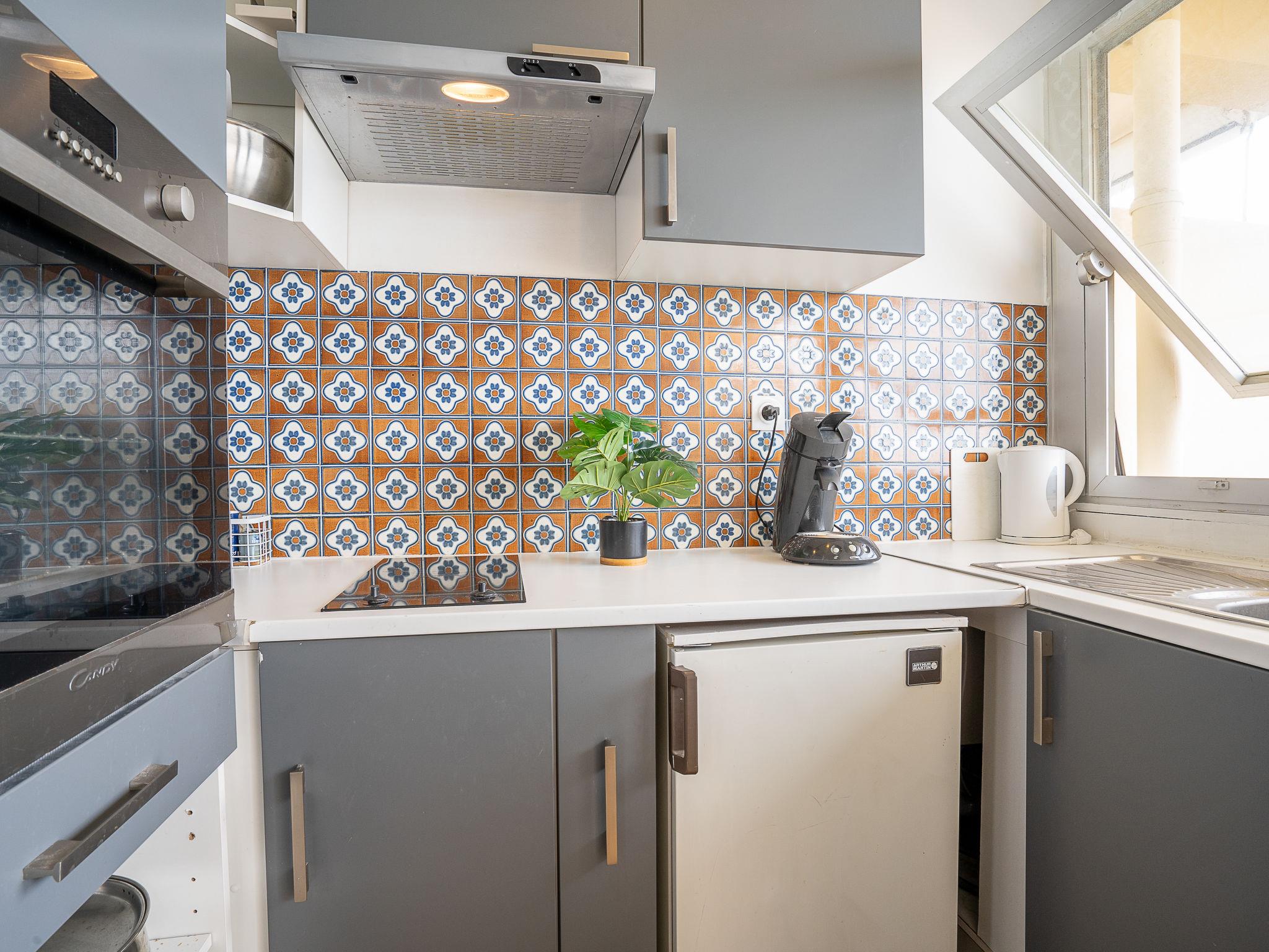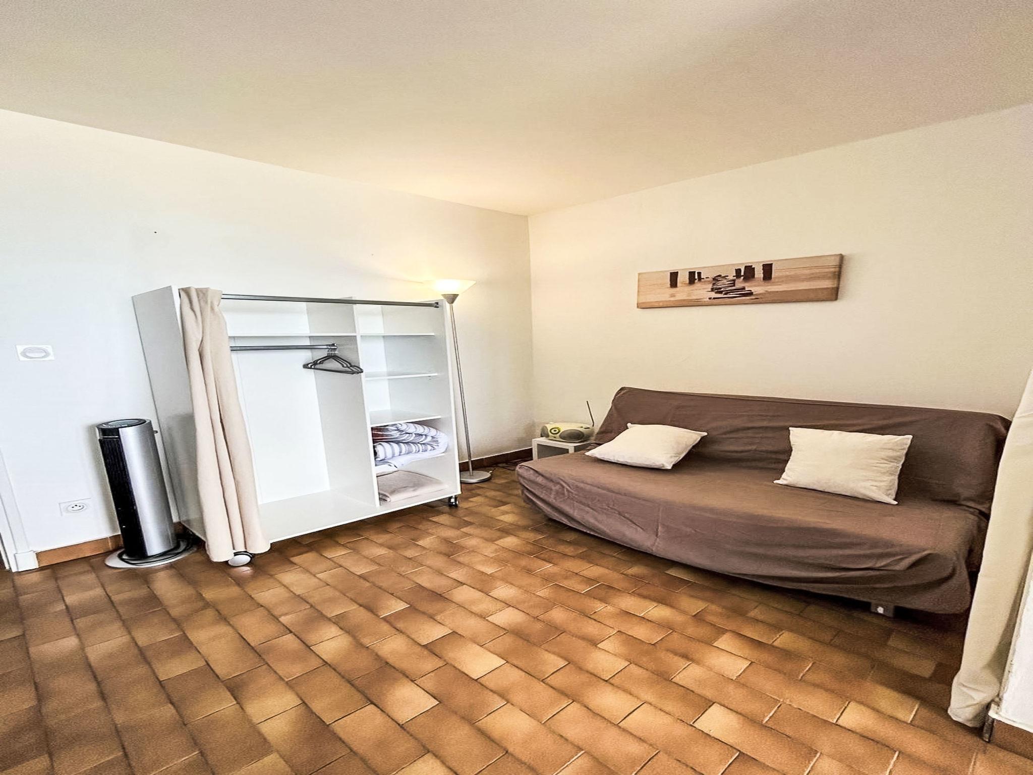 1-room apartment 20 m2 on 6th floor. Simple and practical furnishings: living room with 1 sofabed (140 cm, length 190 cm), TV (flat screen), radio, fan and electric shutters. Exit to the terrace. Kitchenette (oven, 2 ceramic glass hob hotplates, microwave, freezer, electric coffee machine, Capsules for coffee machine (senséo)). Shower/WC. Electric heating. Small terrace 5 m2, east facing position. Balcony furniture. Very beautiful view of the sea. Facilities: iron. Internet (WiFi, extra). Please note: smoke alarm.