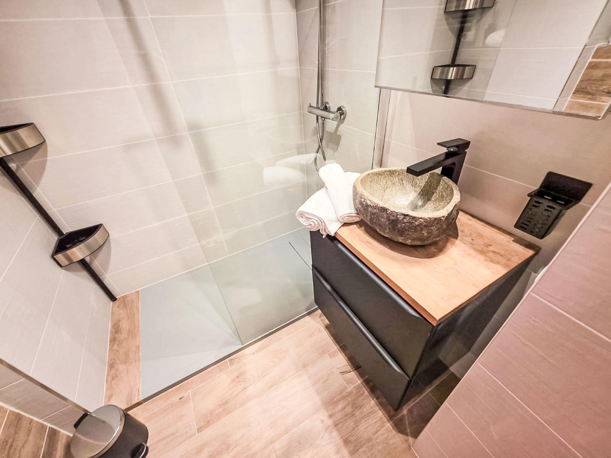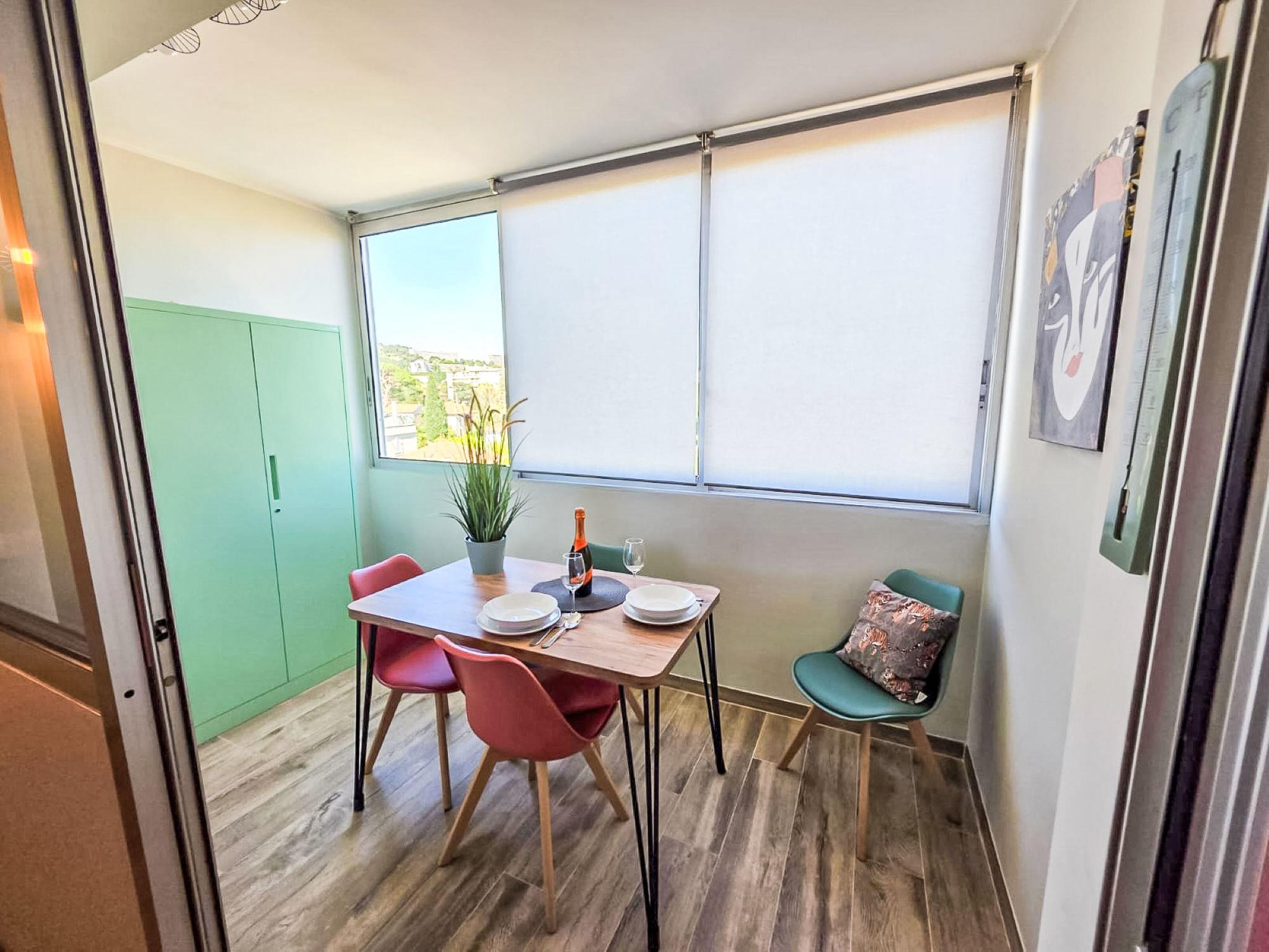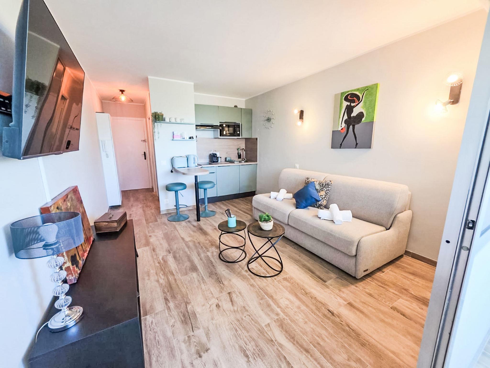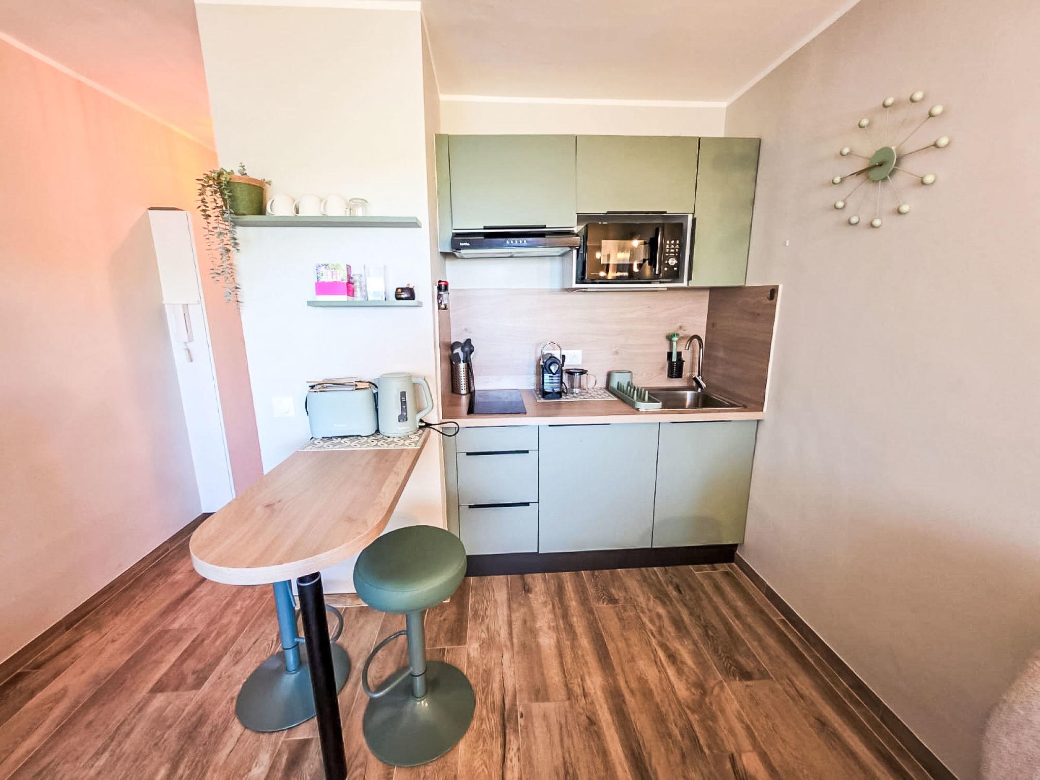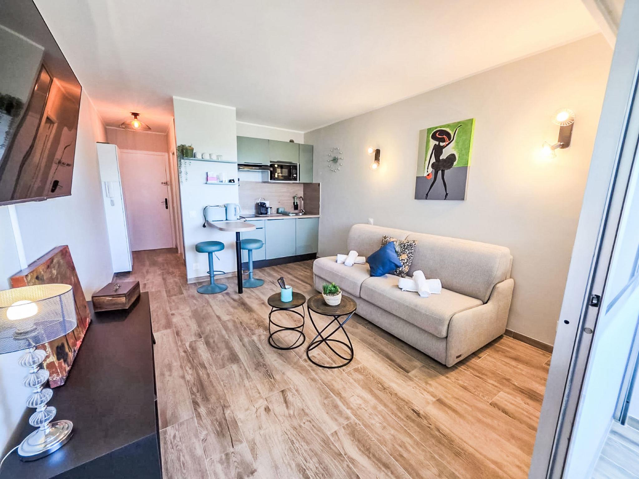 "Joyce", 1-room apartment 20 m2 on 5th floor, east facing position. Comfortable and beautiful furnishings: living/dining room with 1 double sofabed (160 cm, length 200 cm), TV (flat screen). Exit to the veranda. Open kitchen (2 ceramic glass hob hotplates, microwave, electric coffee machine). Shower/WC. Air-conditioning, forced-air heating. Balcony furniture, covered balcony. Facilities: iron, hair dryer. Internet (WiFi, free). Please note: smoke alarm. Offer by a private individual according to Art. 155, IV of CGI. 06029020836AK