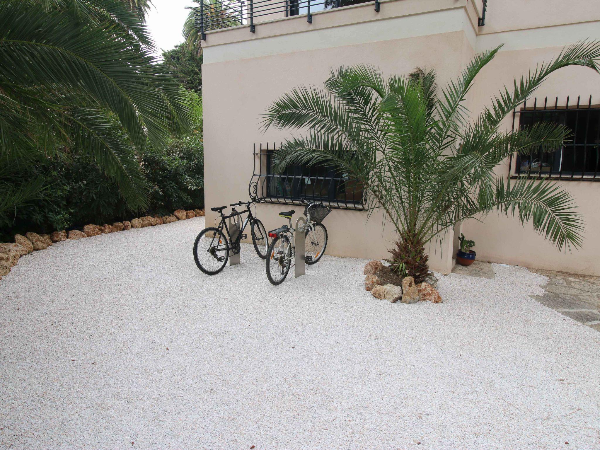 Outside, a large terrace with garden furniture and dining table for 6 people and two balconies await you on the upper floor. In the large, beautiful Mediterranean garden with two 1000-year-old pine trees, eucalyptus trees and palm trees, two large terraces (with a dining table for 10 people) and the heated infinity swimming pool await you. Here you can completely relax and unwind. The infinity pool is a saltwater pool, i.e. the water is odourless and very pleasant for the skin and eyes, thanks to the latest technology in water treatment without the addition of chlorine. Another highlight is the private boules court (boccia) with light balls in the garden at night. There are eight bicycles available, which you can use for trips to the beach or the town centre in just a few minutes. Four cars can be parked free of charge in the villa's private car park. Pets are allowed on request.