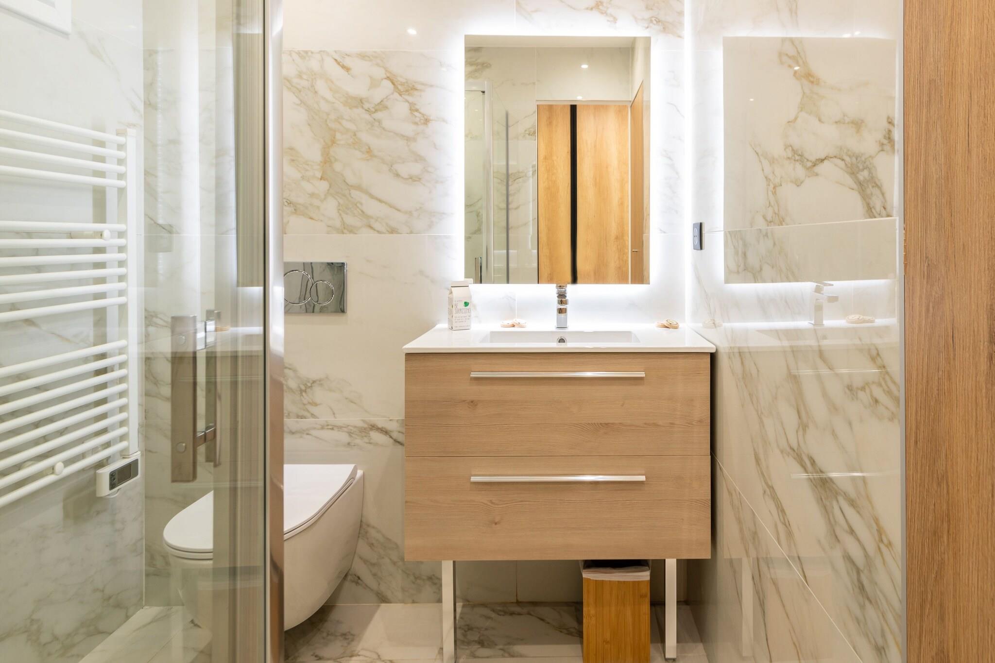 On the 3rd floor: (Kitchen(stove, electric kettle, toaster, coffee machine, microwave, fridge, dishes and cutlery, Cooking basics), Living/bed room(Bed Linen, Internet Access DSL, Wardrobe, double sofa bed, TV, air conditioning), bathroom(shower, washbasin, washing machine, hairdryer, Towels/Sheets (Incl.)), toilet(toilet)) Elevator, Hot Water, First Aid, Beach, Play area, balcony or terrace, heating, iron, shampoo, Essentials, Carbon monoxide detector, Cleaning Disinfection, Downtown, Enhanced cleaning practices, High touch surfaces disinfected, Long term stays allowed, Near Ocean, Town