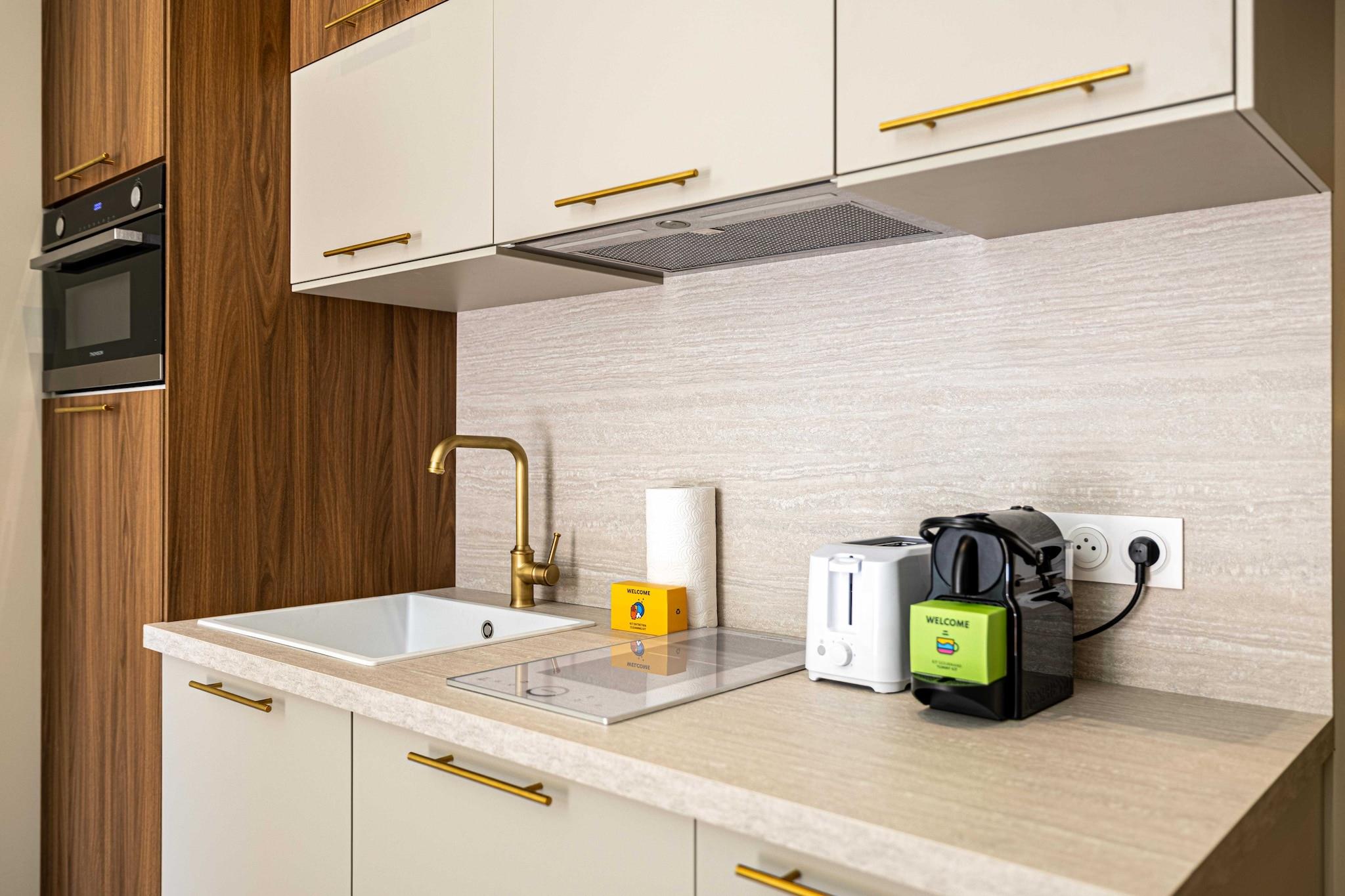 On the 1st floor: (Kitchen(stove, electric kettle, toaster, coffee machine, microwave, fridge, dishes and cutlery, Cooking basics), Living/bed room(double sofa bed, TV(flatscreen)), bedroom(double bed), bathroom(shower, toilet)) Bed Linen, Hot Water, Wardrobe, First Aid, Play area, tumble dryer, washing machine, heating, air conditioning, iron, hairdryer, Towels/Sheets (Incl.), shampoo, Essentials, Carbon monoxide detector, Cleaning Disinfection, Downtown, Enhanced cleaning practices, Long term stays allowed, Town