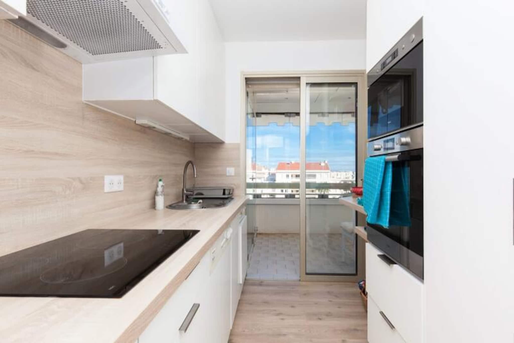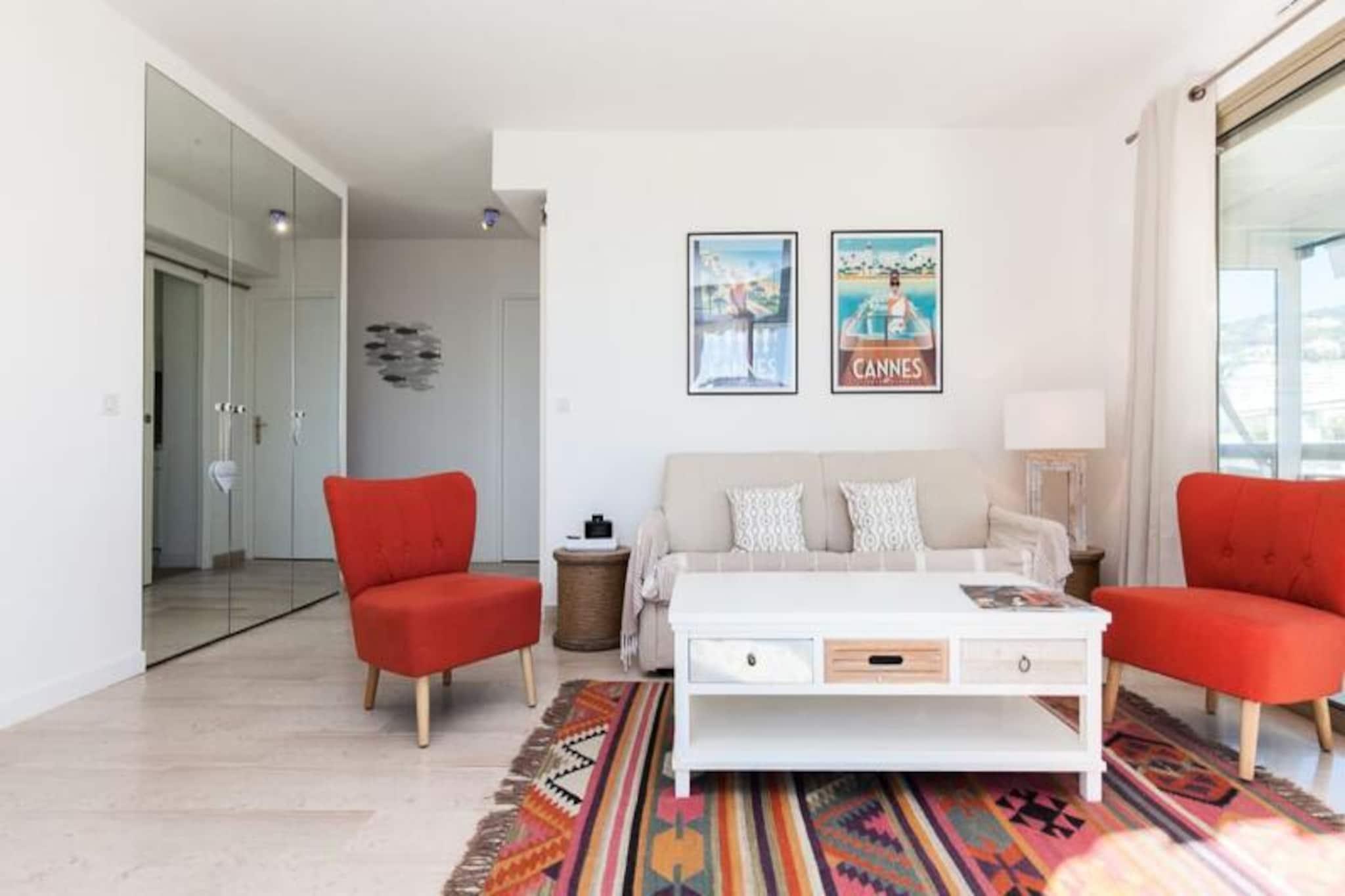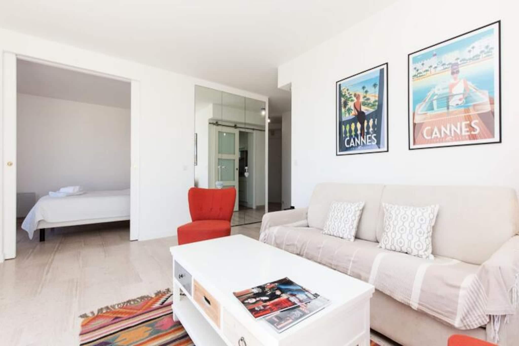 Væk dine sanser i det pulserende Palm Beach-distrikt i Cannes, hvor denne lysende lejlighed på 60 m² inviterer dig til at opleve middelhavslivsstilen, når den er bedst. Med panoramaudsigt over havet fra terrassen og farverig kunst, der pryder interiøret, er denne ejendom en oase af elegance og komfort kun få skridt fra sandstrande og det glitrende azurblå vand ved den franske riviera. Uanset om du nipper til kaffe på verandaen eller slentrer gennem det charmerende kvarter, er hvert øjeblik her fyldt med glamour og ro i Cannes. \n\nIndenfor tilbyder lejligheden et gennemtænkt design, der er perfekt til familier eller grupper på op til seks personer. Den lyse stue har en hyggelig sovesofa, fladskærms-tv og direkte adgang til terrassen, mens det fuldt udstyrede køkken åbner ud til en veranda med spiseplads. Soveværelset har en queensize-seng og adgang til terrassen, mens det andet soveværelse har to enkeltsenge og sin egen private terrasse. To badeværelser, en bruseniche og et separat toilet sikrer bekvemmelighed og privatliv for alle gæster. Moderne bekvemmeligheder som reversibel aircondition, Wi-Fi og privat parkering forbedrer dit ophold, mens sengetøj og daglige fornødenheder er inkluderet for din komfort. \n\nTræd udenfor og fordyb dig i den lokale charme. Inden for fem minutters gang finder du alt, hvad du behøver, fra frisk fisk og skaldyr og håndværksbagerier til små butikker og saloner. En afslappet 20-minutters gåtur langs havet fører dig til den ikoniske Croisette og Palais des Festivals, hvor luksusbutikker og kulturelle vartegn venter. Offentlig transport er bekvemt placeret i nærheden, hvilket gør det nemt at udforske byen og omegn. \n\nUanset om du besøger byen for afslapning eller eventyr, tilbyder denne lejlighed den perfekte blanding af stil, bekvemmelighed og beliggenhed. Lad Cannes' skønhed inspirere din næste ferie og skab uforglemmelige minder i denne middelhavsperle.