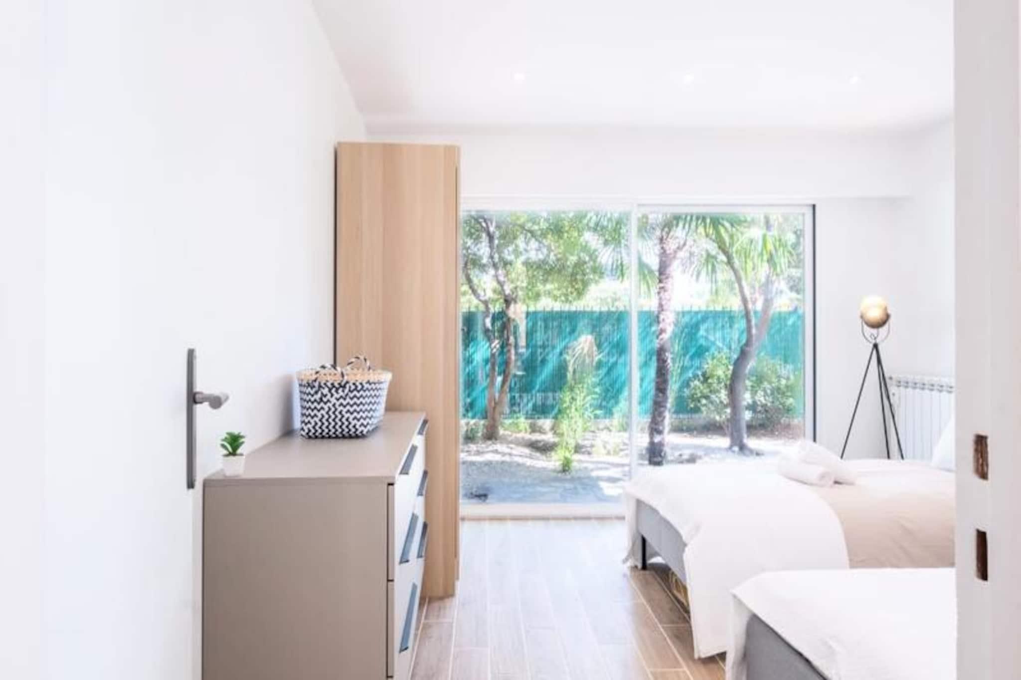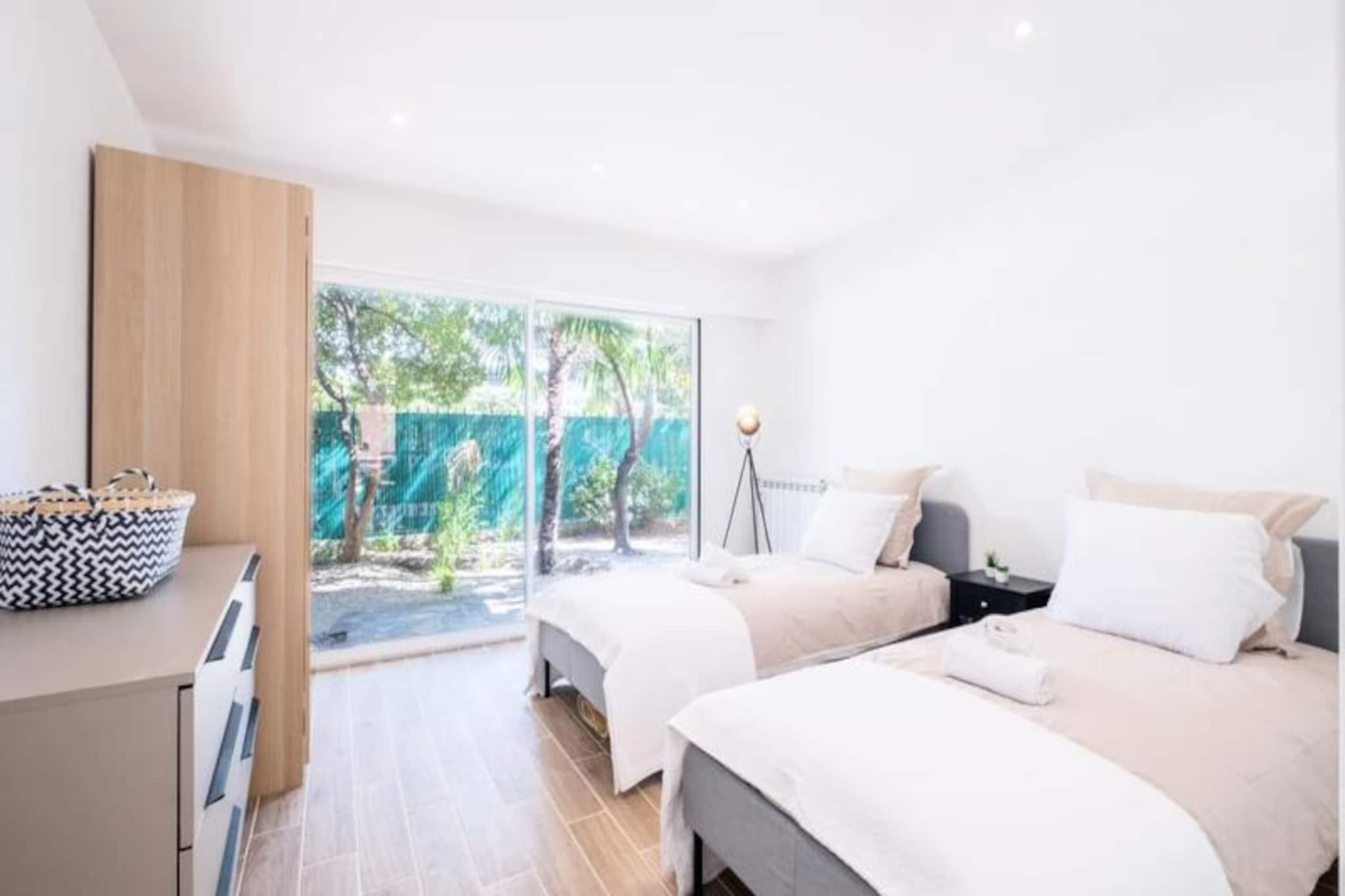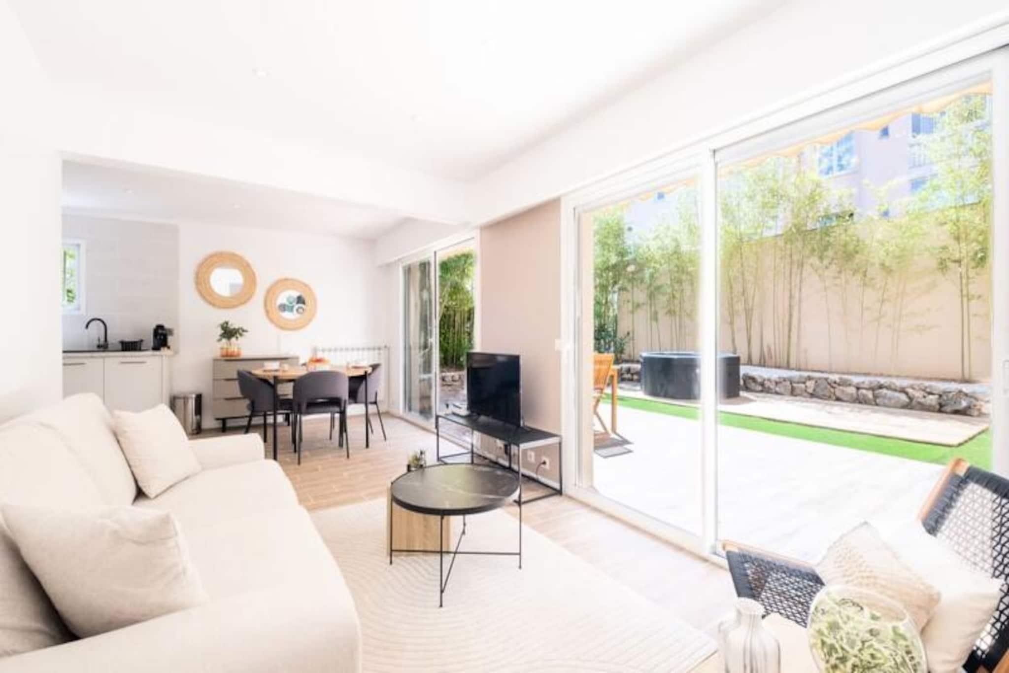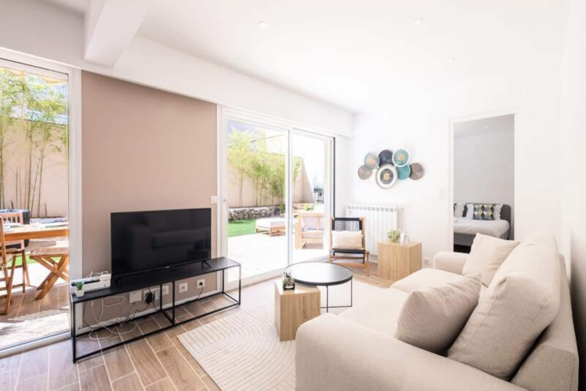 Badet i den franske rivieras gyldne lys tilbyder denne arkitektdesignede lejlighed en fredfyldt tilflugtssted kun få øjeblikke fra de ikoniske Croisette-strande i Cannes. Forestil dig at vågne op til palmernes blide raslen og træde ind i din private have, hvor middelhavsbrisen sætter den perfekte tone for din dag. Uanset om du nipper til kaffe på terrassen eller nyder en middag under stjernerne, lover dette rolige tilflugtssted et uforglemmeligt ophold. \n\nIndenfor kan lejligheden prale af 70 m² omhyggeligt udvalgt plads, der blander moderne elegance med varme, indbydende detaljer. Stuen åbner direkte ud til haven med en blød sofa og smart-tv til afslappede aftener. Det åbne køkken er fuldt udstyret, hvilket gør det nemt at tilberede måltider med friske lokale ingredienser. To smukt indrettede soveværelser tilbyder afslappende oaser: master-soveværelset med en queensize-seng og adgang til terrassen, og det andet med to enkeltsenge og udsigt over haven. Et elegant badeværelse med badekar og separat toilet fuldender planløsningen og sikrer komfort for alle gæster. Aircondition i soveværelserne og termoruder garanterer fredelige nætter. \n\nDenne lejlighed ligger i en sikker og eksklusiv bolig, kun 4 minutters gang fra Croisette-strandene og er omgivet af bekvemme faciliteter, herunder bagerier, delikatesseforretninger og supermarkeder. Besøg Cannes' glamourøse bymidte, charmen i Juan-les-Pins eller parfumerierne i Grasse. Med concierge-service til din rådighed er der sørget for alle detaljer under dit ophold. \n\nUanset om du søger afslapning, eventyr eller en smag af Riviera-luksus, er denne lejlighed din port til det bedste af Côte d'Azur.