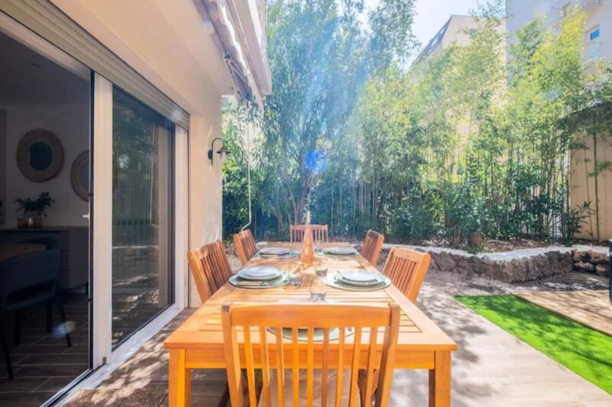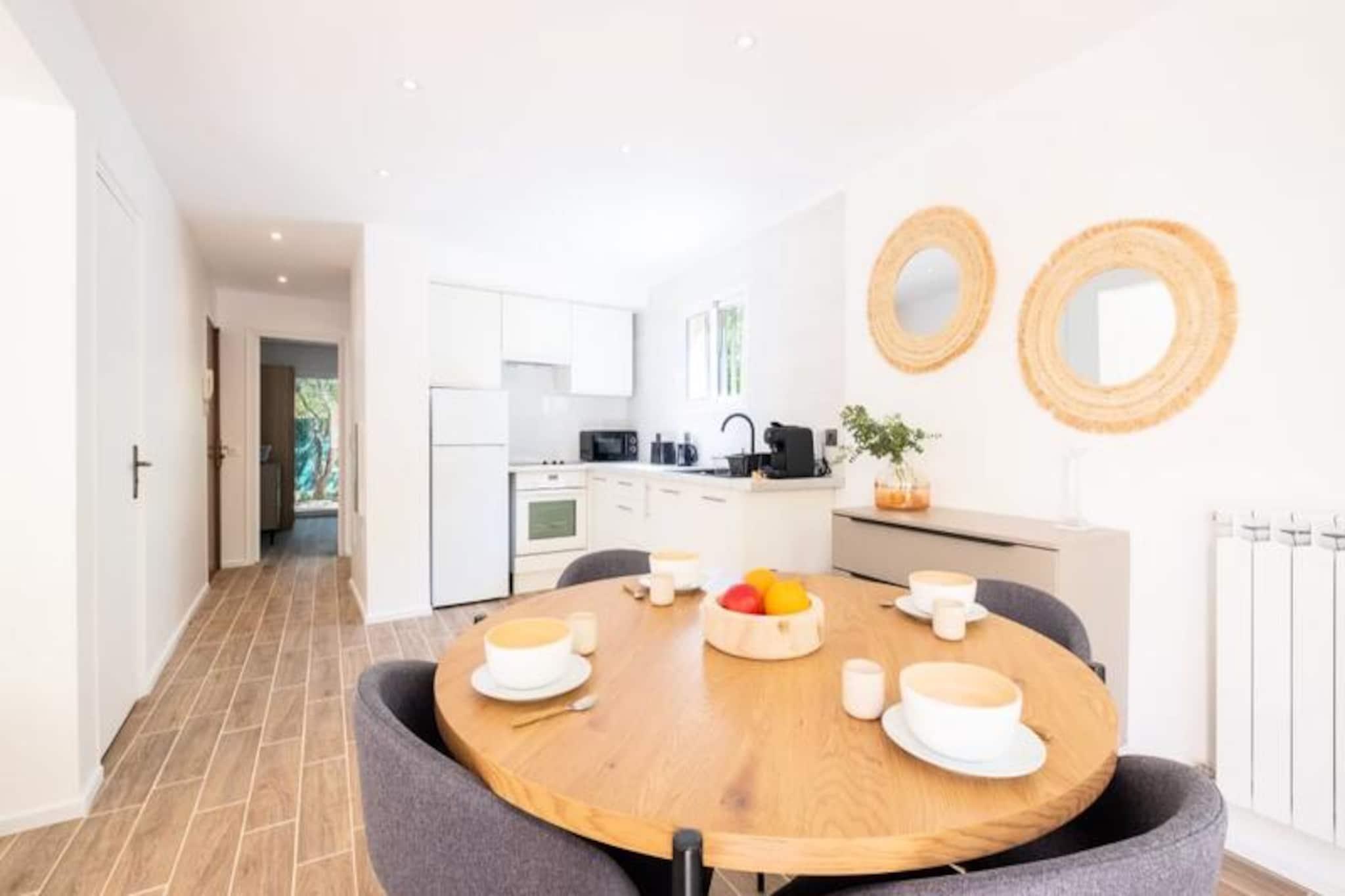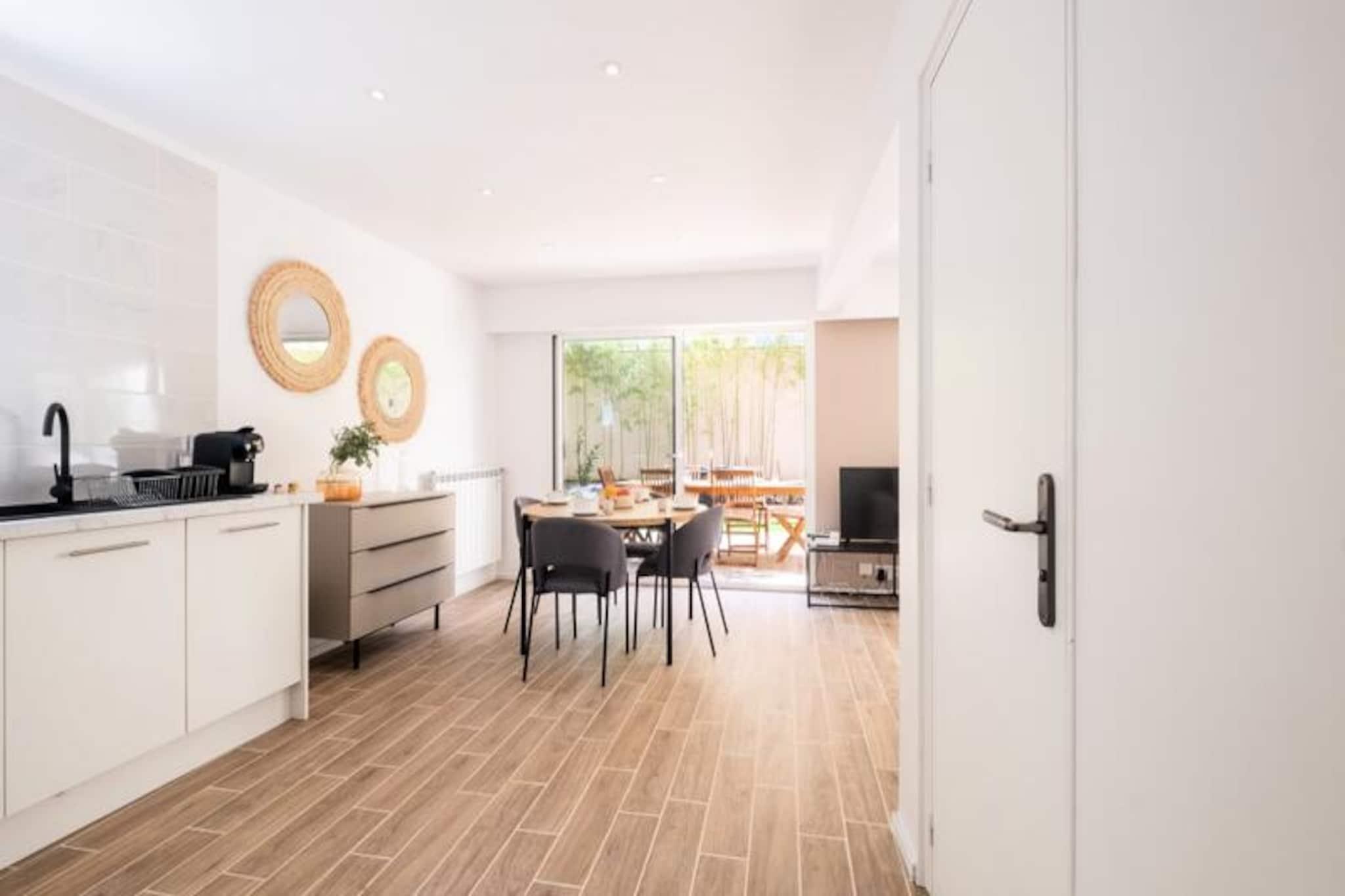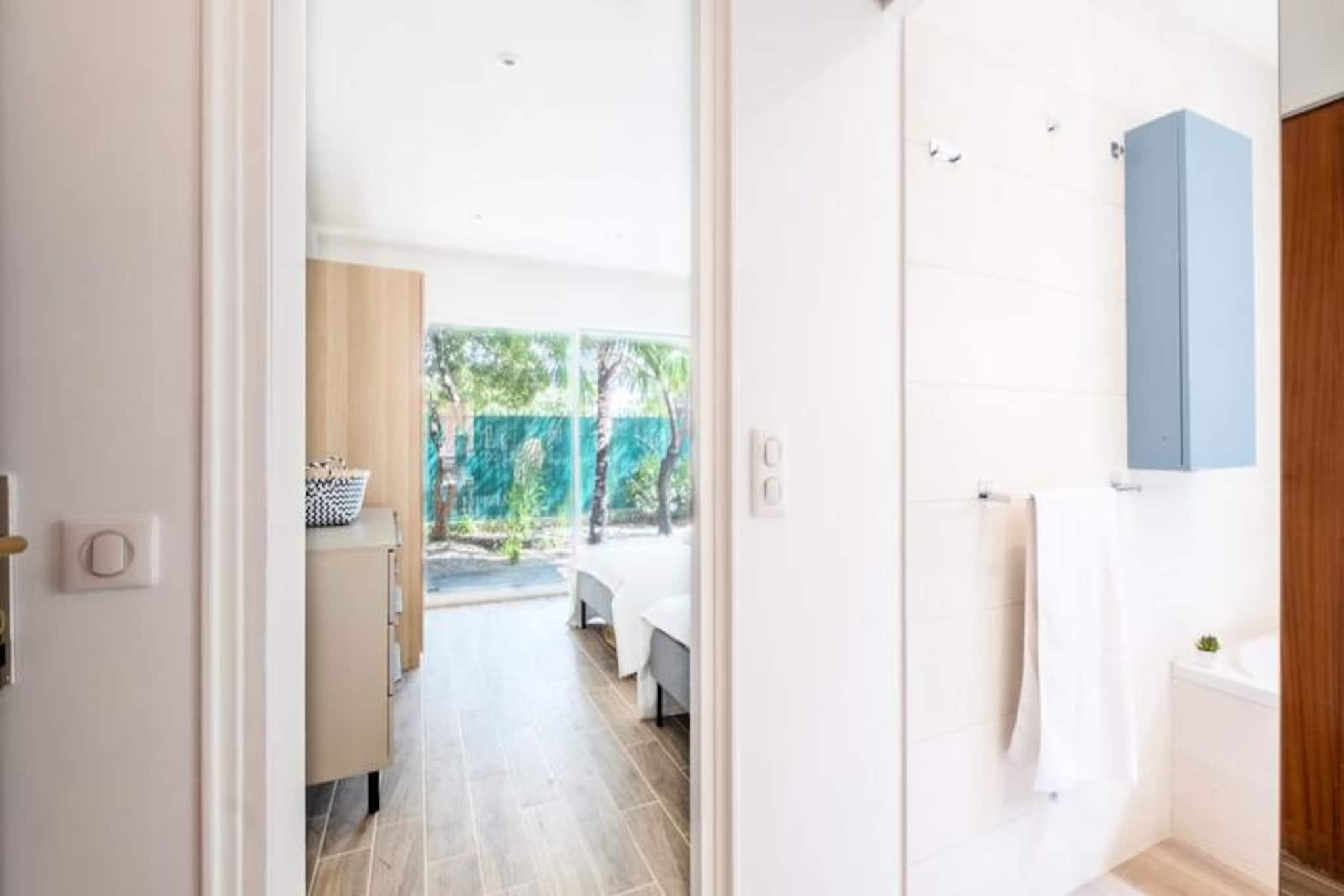 Badet i den franske rivieras gyldne lys tilbyder denne arkitektdesignede lejlighed en fredfyldt tilflugtssted kun få øjeblikke fra de ikoniske Croisette-strande i Cannes. Forestil dig at vågne op til palmernes blide raslen og træde ind i din private have, hvor middelhavsbrisen sætter den perfekte tone for din dag. Uanset om du nipper til kaffe på terrassen eller nyder en middag under stjernerne, lover dette rolige tilflugtssted et uforglemmeligt ophold. \n\nIndenfor kan lejligheden prale af 70 m² omhyggeligt udvalgt plads, der blander moderne elegance med varme, indbydende detaljer. Stuen åbner direkte ud til haven med en blød sofa og smart-tv til afslappede aftener. Det åbne køkken er fuldt udstyret, hvilket gør det nemt at tilberede måltider med friske lokale ingredienser. To smukt indrettede soveværelser tilbyder afslappende oaser: master-soveværelset med en queensize-seng og adgang til terrassen, og det andet med to enkeltsenge og udsigt over haven. Et elegant badeværelse med badekar og separat toilet fuldender planløsningen og sikrer komfort for alle gæster. Aircondition i soveværelserne og termoruder garanterer fredelige nætter. \n\nDenne lejlighed ligger i en sikker og eksklusiv bolig, kun 4 minutters gang fra Croisette-strandene og er omgivet af bekvemme faciliteter, herunder bagerier, delikatesseforretninger og supermarkeder. Besøg Cannes' glamourøse bymidte, charmen i Juan-les-Pins eller parfumerierne i Grasse. Med concierge-service til din rådighed er der sørget for alle detaljer under dit ophold. \n\nUanset om du søger afslapning, eventyr eller en smag af Riviera-luksus, er denne lejlighed din port til det bedste af Côte d'Azur.