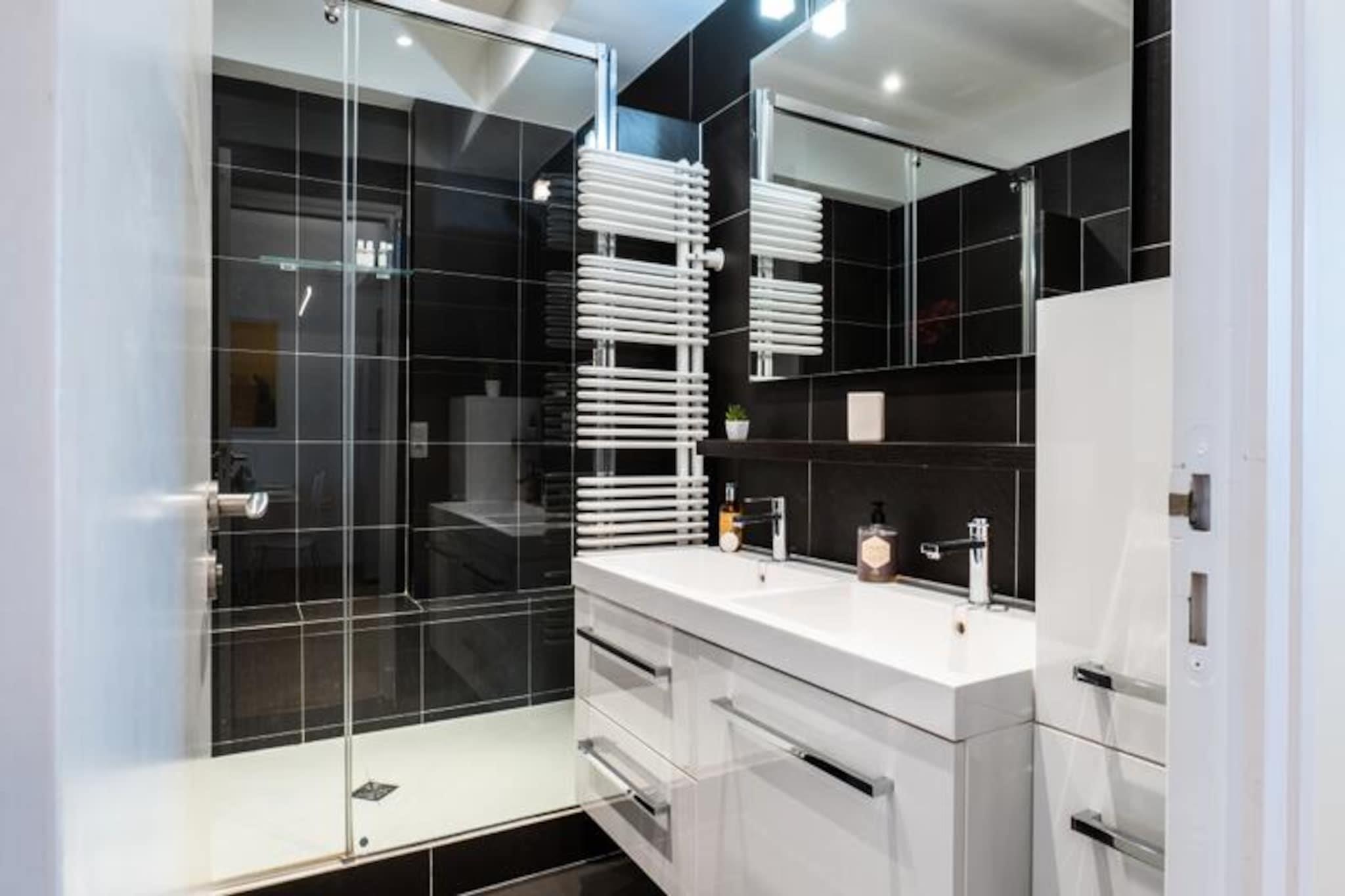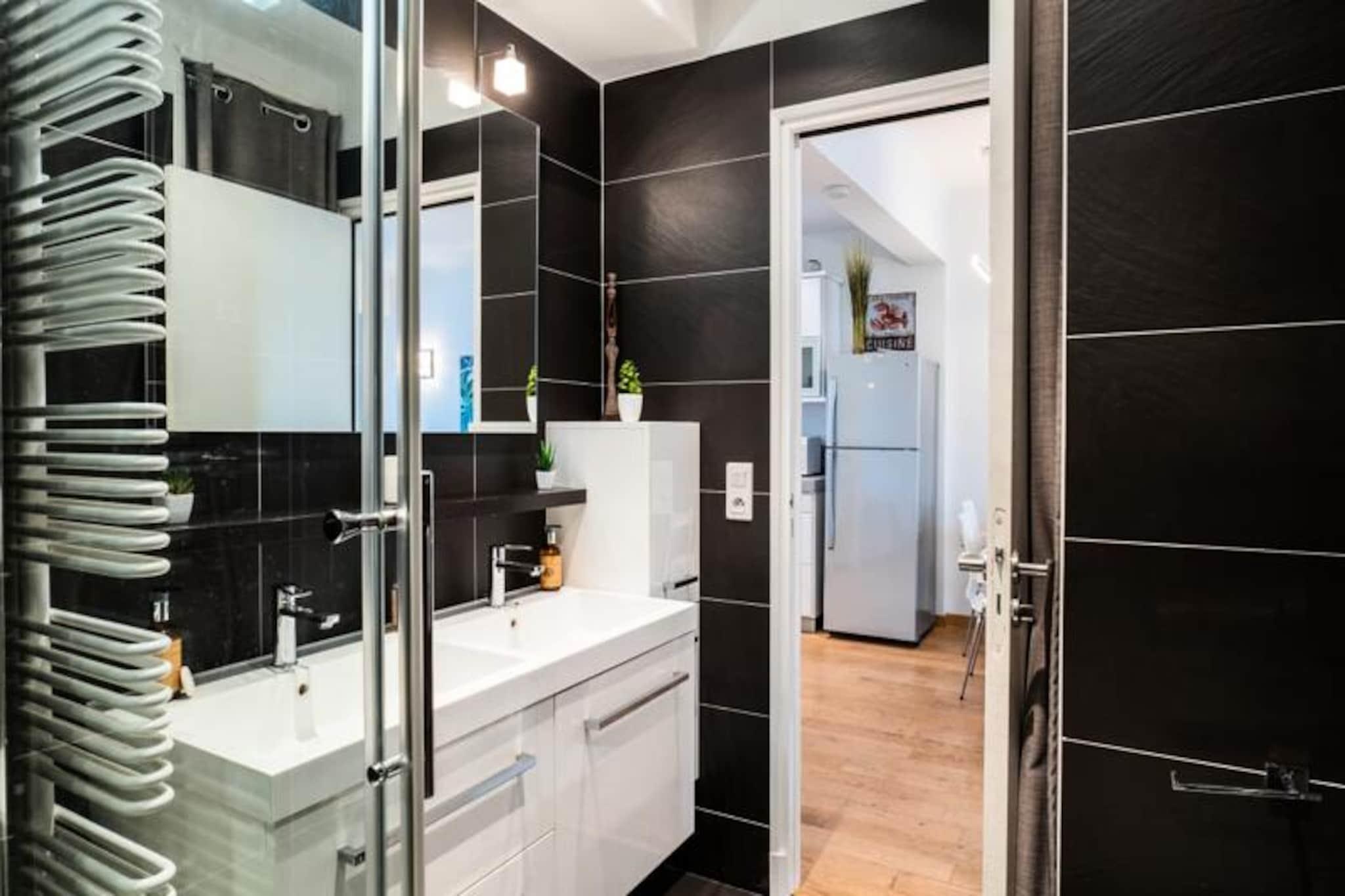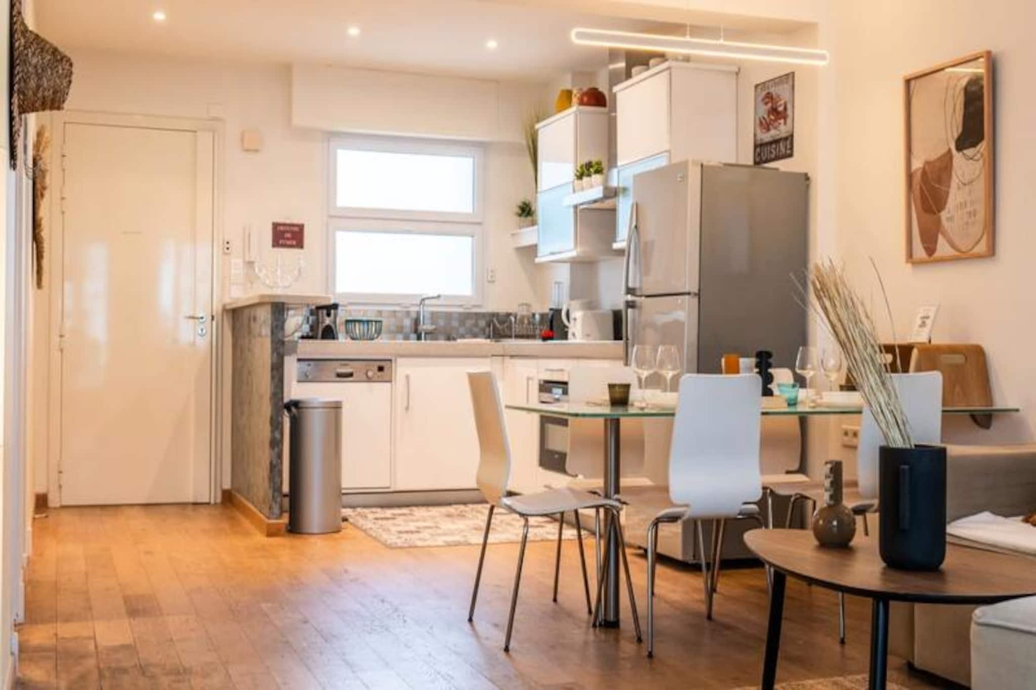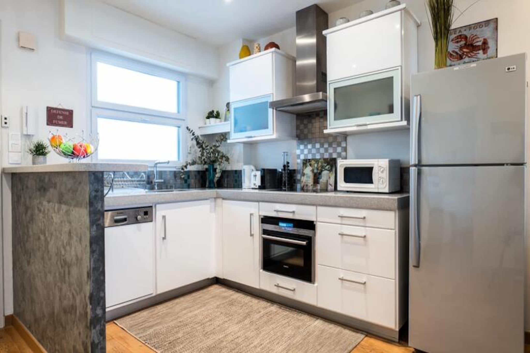 Træd ind i hjertet af Cannes og oplev denne elegante lejlighed med to soveværelser, perfekt beliggende kun få skridt fra den ikoniske Croisette. Med sine pulserende omgivelser og nærhed til byens fineste attraktioner tilbyder denne ejendom en ideel base for at udforske Cannes med venner eller kære. Forestil dig at nippe til din morgenkaffe på den østvendte terrasse med udsigt over det berømte Martinez Hotel, mens du nyder den delvise havudsigt og den livlige atmosfære på Rue Latourg-Maubourg. Uanset om du er her for glamouren i Palais des Festivals eller charmen i de lokale gader, placerer denne lejlighed dig i centrum af det hele. \n\nIndenfor udstråler lejligheden varme og elegance med sin smagfulde indretning og gennemtænkte designede rum. Den rummelige opholdsstue er opdelt i tre forskellige zoner: en hyggelig stue med en blød sofa og fladskærms-tv, et fuldt udstyret åbent køkken med ovn og mikrobølgeovn samt en spiseplads til fire personer, der åbner ud til terrassen. Begge soveværelser har queensize-senge, indbyggede skabe og blødt sengetøj for at sikre afslappende nætter. Det større soveværelse har endda et fladskærms-tv for ekstra komfort. Et moderne badeværelse med en stor bruser fuldender rummet og tilbyder alt, hvad du behøver for et afslappende ophold. \n\nTræd udenfor, og du vil være omgivet af trendy barer, restauranter og butikker. Gå en tur langs Croisetten, shoppe på Rue d'Antibes, eller nyd morgenmad og cocktails på Rue Hoche - alt sammen få minutter fra din dør. For dem, der søger et livligt natteliv, fortsætter områdets pulserende energi ind i aftenen, med nærliggende steder, der skaber en spændende atmosfære. \n\nUanset om du besøger byen for glamouren, maden eller kystcharmen, tilbyder denne lejlighed en problemfri blanding af komfort og bekvemmelighed, hvilket gør den til det perfekte valg til din Cannes-ferie.