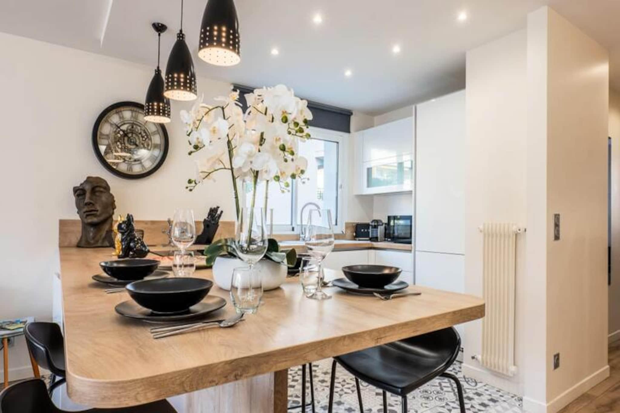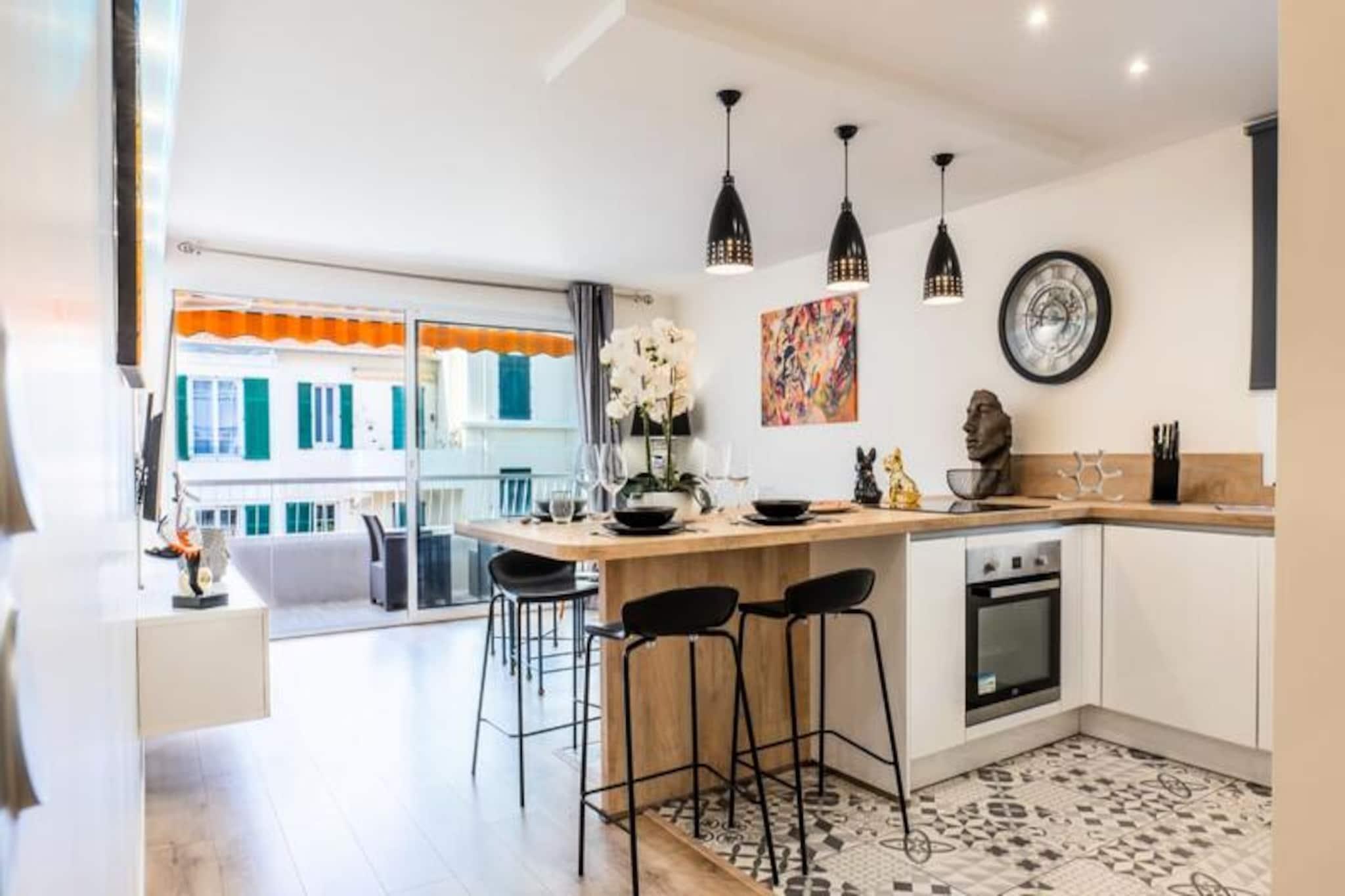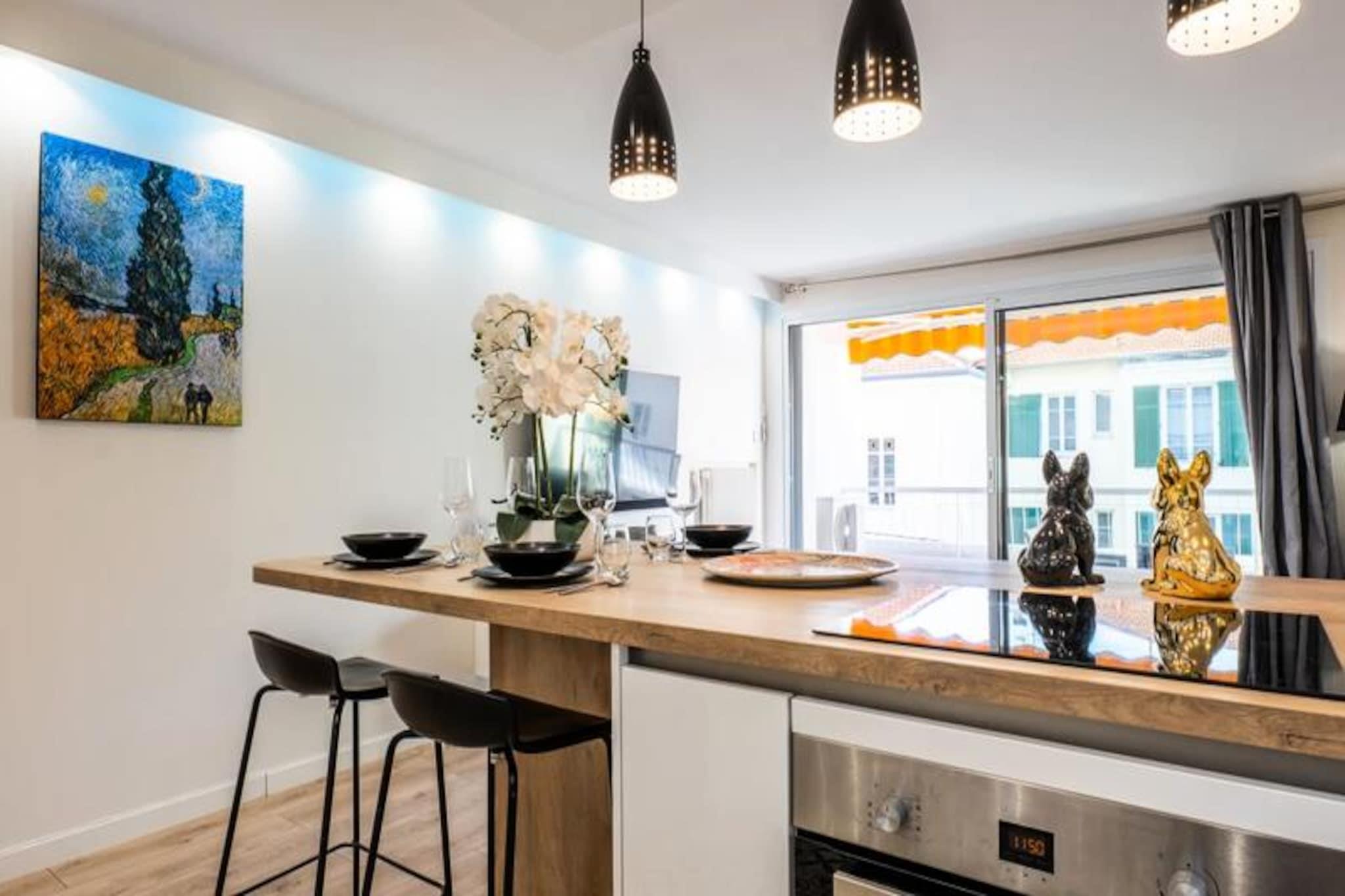 Træd ind i en verden af ??underspillet elegance i denne smukt renoverede lejlighed på 48 m², perfekt skræddersyet til par, der søger et roligt tilflugtssted i hjertet af Cannes. Med sit lyse interiør, moderne bekvemmeligheder og en privat terrasse tilbyder denne ejendom den ideelle blanding af komfort og bekvemmelighed. Forestil dig at vågne op i et roligt soveværelse med en kingsize-seng og eget brusebad, og nyd derefter din morgenkaffe på terrassen, mens byen langsomt vågner til live. Uanset om du er her for fritid eller forretning, er denne lejlighed dit fristed midt i Cannes' pulserende energi. \n\nLejligheden kan prale af en indbydende åben opholdsstue med et fuldt udstyret køkken med opvaskemaskine og ovn, perfekt til at tilberede måltider efter en dag med udforskning. Stuen, der er møbleret med en blød sofa og Smart TV, inviterer dig til at slappe af med dine yndlingsprogrammer eller blot slappe af med et glas vin. Praktiske detaljer som termoruder, aircondition og en stor indbygget garderobe sikrer et stressfrit ophold, mens den private parkeringskælder tilføjer et ekstra lag af bekvemmelighed. \n\nBeliggende i et fredeligt kvarter, er du kun 8 minutters gang fra den travle bymidte og Rue d'Antibes, Cannes' førende shoppinggade. En afslappet gåtur på 15 minutter tager dig til det ikoniske Palais des Festivals og Croisetten, hvor den franske rivieras glamour udfolder sig. På din gade finder du et charmerende bageri og Hive Bar, et hyggeligt sted med brætspil og lækker mad. \n\nUanset om du er her for at nyde solen, udforske byens kulturelle perler eller forkæle dig selv med shopping i verdensklasse, er denne lejlighed din port til en uforglemmelig Cannes-oplevelse. Lad charmen ved den franske riviera fortrylle dig, et øjeblik ad gangen.