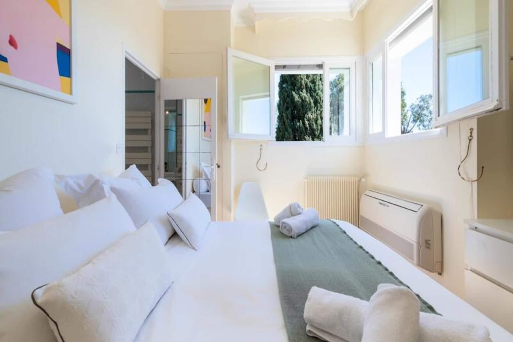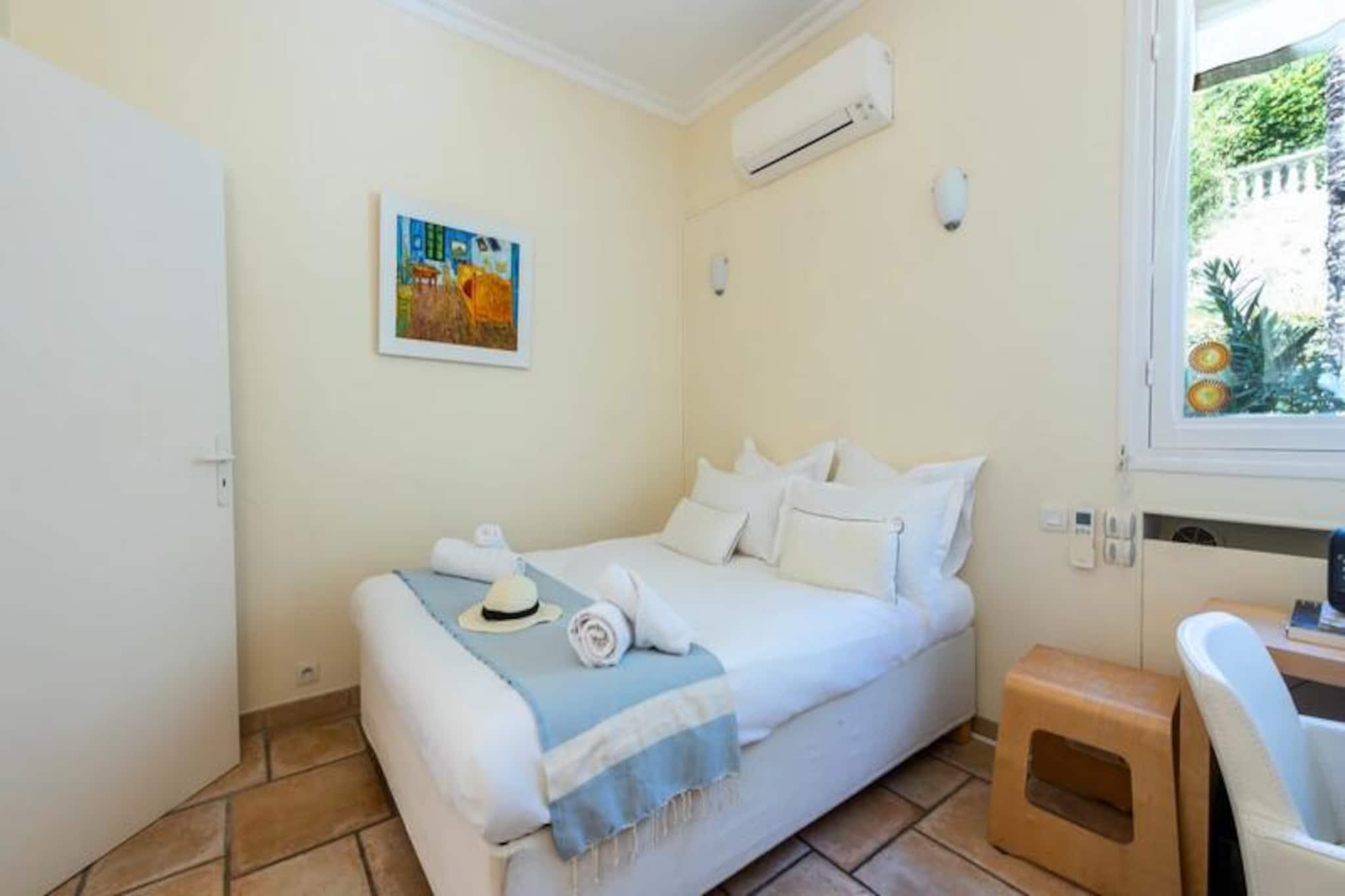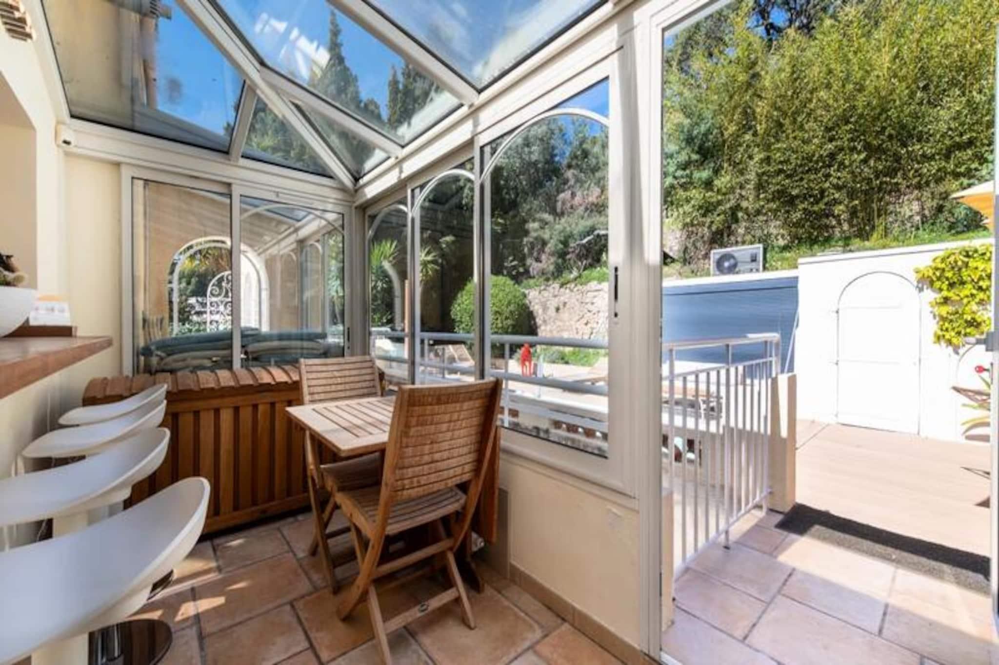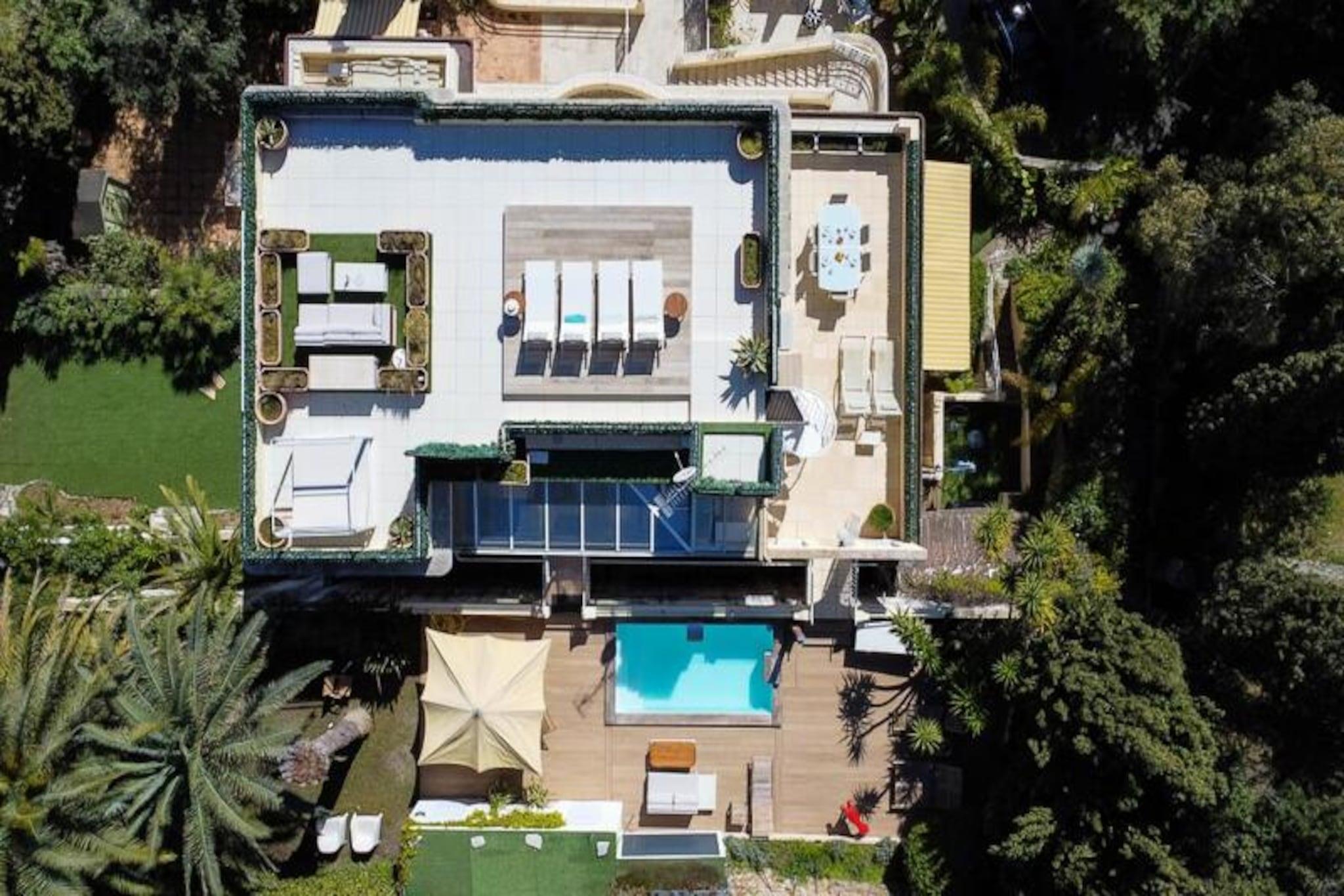 Højt over Cannes' glamourøse gader tilbyder denne udsøgte lejlighed på øverste etage i en historisk villa et uovertruffent tilflugtssted for dem, der søger både ro og elegance. Forestil dig at vågne op til den blide middelhavsbrise med panoramaudsigt, der strækker sig fra det azurblå hav til de ikoniske Lérinsøer, alt sammen fra din private tagterrasse. Denne fredfyldte tilflugtssted ligger kun få minutter fra Cannes' pulserende hjerte, men føles alligevel som en verden væk i sine fredelige boligomgivelser. Træd indenfor og bliv mødt af en lys stue, hvor en sydvendt udsigt bader rummet i solskin. Den elegante lædersofa og spiseplads skaber en indbydende atmosfære, mens det fuldt udstyrede køkken åbner ud til en charmerende vinterhave, perfekt til morgenkaffe eller stille refleksion. Udenfor lokker den private have med sin intime swimmingpool, liggestole og skyggefulde spiseplads under svajende palmer. For den ultimative forkælelse kan du gå op til tagterrassen, hvor en udendørs lounge og dagseng inviterer dig til at nyde den betagende udsigt. Lejligheden har komfortabel plads til op til fire gæster med to smukt indrettede soveværelser. Master-suiten har et ensuite badeværelse, mens et andet dobbeltværelse og et ekstra brusebad sikrer bekvemmelighed og privatliv. Moderne bekvemmeligheder som højhastigheds-Wi-Fi, reversibel aircondition og en privat elevator forbedrer dit ophold. Denne ejendom har en perfekt beliggenhed tæt på Cannes' mest ikoniske attraktioner. Gå en tur langs Boulevard de la Croisette, udforsk de brostensbelagte gader i Le Suquet, eller slap af på sandstranden ved Gazagnaire-stranden. Uanset om du er her for filmfestivalen, luksusshopping eller blot for at slappe af, tilbyder denne lejlighed en raffineret base for at opleve det bedste af den franske riviera.