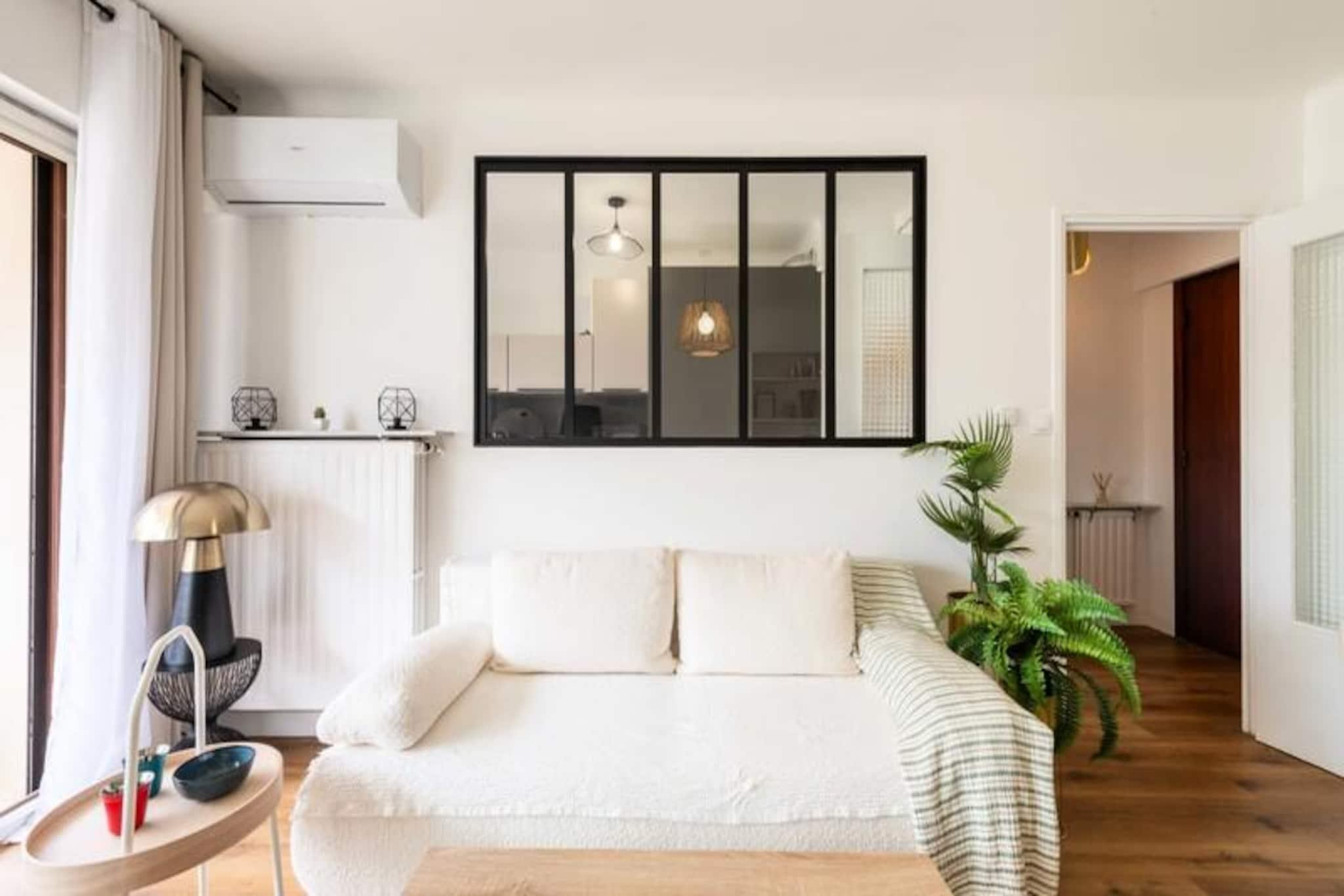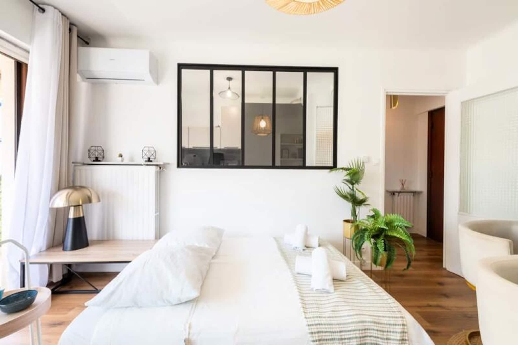 Badet i den gyldne glød fra den sene eftermiddagssol tilbyder denne elegante lejlighed i Cannes' Palm Beach-distrikt et roligt tilflugtssted kun få skridt fra det glitrende Middelhav. Uanset om du nyder et stille øjeblik på den vestvendte terrasse eller slentrer til nærliggende strande, inviterer denne ejendom dig til at omfavne den afslappede rytme af kystlivet i en af ??Frankrigs mest ikoniske destinationer. Den underspillede indretning og det gennemtænkte design skaber en atmosfære af rolig raffinement, perfekt til at slappe af efter en dag med at udforske den pulserende by. \n\nLejligheden ligger på tredje sal med elevatoradgang og har en rummelig stue med spiseplads, en komfortabel sovesofa og direkte adgang til terrassen. Det separate, fuldt udstyrede køkken kan prale af en stilfuld glasvæg og franske døre, der fører udenfor, hvilket gør det ideelt til at tilberede måltider med friske lokale ingredienser. Soveværelset, der er møbleret med en queensize-seng og garderobe, åbner også ud til terrassen, så du kan vågne op til den blide havbrise. Et moderne brusebad og separat toilet fuldender rummet, mens faciliteter som reversibel aircondition, Wi-Fi og et smart-tv sikrer, at dit ophold er lige så behageligt, som det er praktisk. \n\nBeliggenheden er virkelig exceptionel og placerer dig i gåafstand fra Mouré Rouge-stranden, Gazagnaire-stranden og den travle Place de l'Étang, hvor du finder butikker, bagerier og restauranter. Den berømte Boulevard de la Croisette, omkranset af luksusbutikker og private strande, ligger kun en kort gåtur væk, mens Palais des Festivals og Rue d'Antibes er let tilgængelige for dem, der søger kulturelle oplevelser og shoppingoplevelser. For naturelskere tilbyder udflugter til Lérins-øerne en mulighed for at udforske uberørte landskaber og historiske steder. \n\nUanset om du besøger Cannes for en romantisk ferie, en familieferie eller en kulturel flugt, kombinerer denne lejlighed diskret komfort med en førsteklasses beliggenhed og lover et uforglemmeligt ophold i hjertet af Cannes.