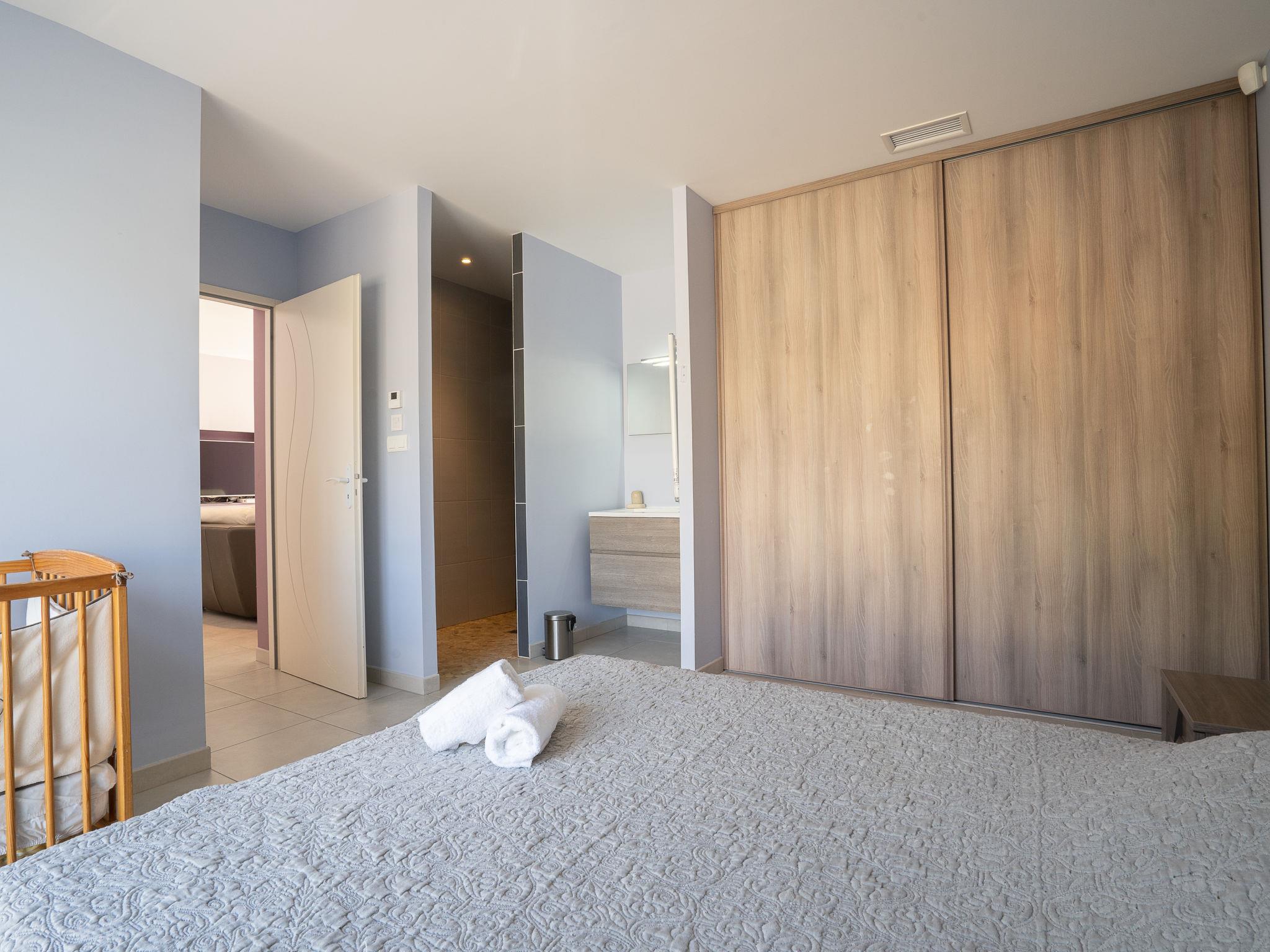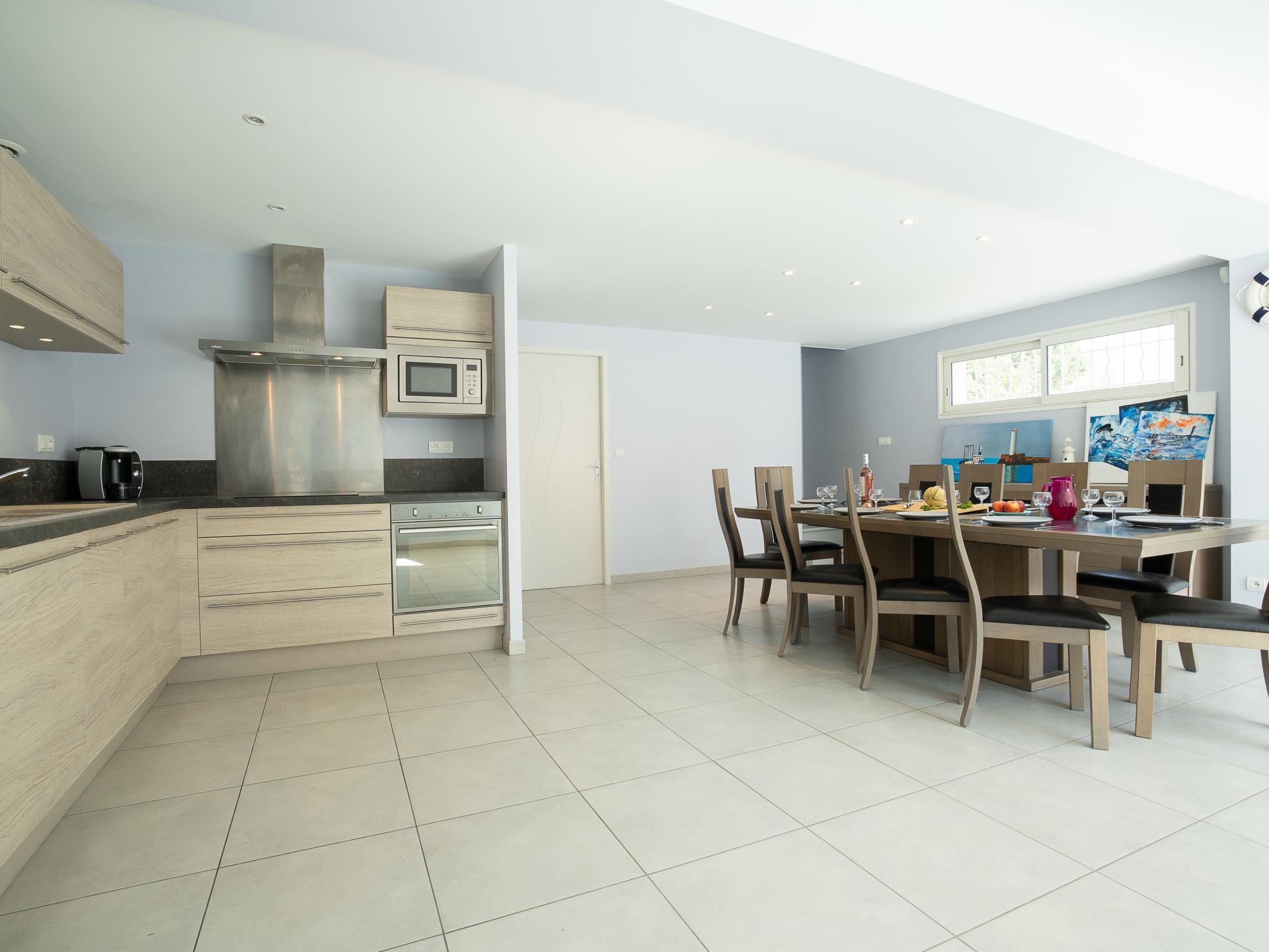 7-room villa 158 m2, south facing position. Spacious and bright, fully in 2014, very comfortable and modern furnishings: large dining room 39 m2 with panoramic window south facing position with flat screen and air conditioning. Exit to the terrace, to the swimming pool. Lounge 29 m2 with panoramic window with digital TV and air conditioning. Exit to the terrace, to the swimming pool, south facing position. 1 room 12 m2 with 1 french bed (160 cm, length 200 cm), hand-basin, shower and air conditioning. Exit to the garden. 1 room 17 m2 with 1 french bed (160 cm, length 200 cm), hand-basin, shower and air conditioning. 1 room 10 m2 with 1 french bed (140 cm, length 190 cm). Open kitchen (oven, dishwasher, 2 ceramic glass hob hotplates, microwave, freezer, electric coffee machine). Bathroom, sep. WC. Upper floor: 1 room 14 m2, with sloping ceilings, ceiling height 110 - 206 cm with 1 french bed (140 cm, length 190 cm), air conditioning. 1 room 9 m2, with sloping ceilings, ceiling height 110 - 206 cm with 1 french bed (140 cm, length 190 cm). 2 large terraces. Terrace furniture, deck chairs. Facilities: washing machine, iron, hair dryer. Internet (WiFi, free). Please note: maximum 1 pet/ dog allowed. Smoke alarm. Spring 2016 New garden design and design of a beautiful summer kitchen with grill, griddle built into the work plan.