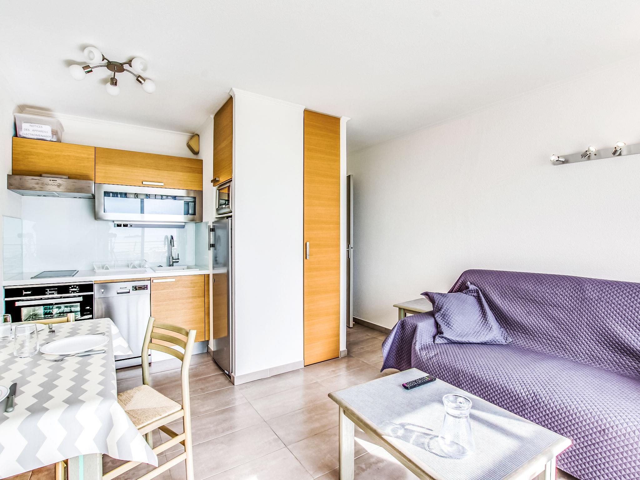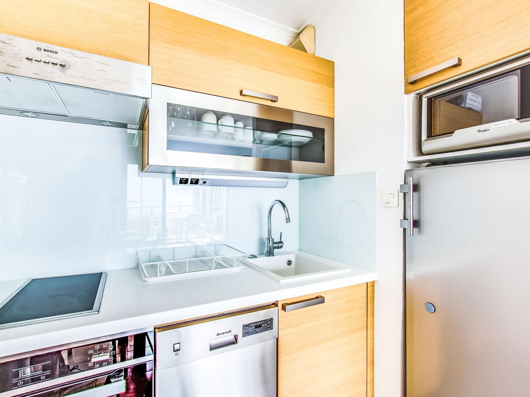2-room apartment 34 m2 on 4th floor. Bright, fully renovated in 2016: living/dining room with panoramic window with 1 double sofabed (140 cm, length 190 cm), TV (flat screen). Exit to the terrace. 1 room with 1 french bed (140 cm, length 190 cm). Kitchenette (mini-oven, oven, dishwasher, 2 induction hot plates, electric coffee machine). Shower, sep. WC. Electric heating. Terrace 8 m2 partly roofed. Terrace furniture. Very beautiful view of the sea, the swimming pool and the garden. Facilities: washing machine. Internet (WiFi, extra). Parking space n 364 (roofed). Please note: suitable for families. Parking space for small car only. Smoke alarm.