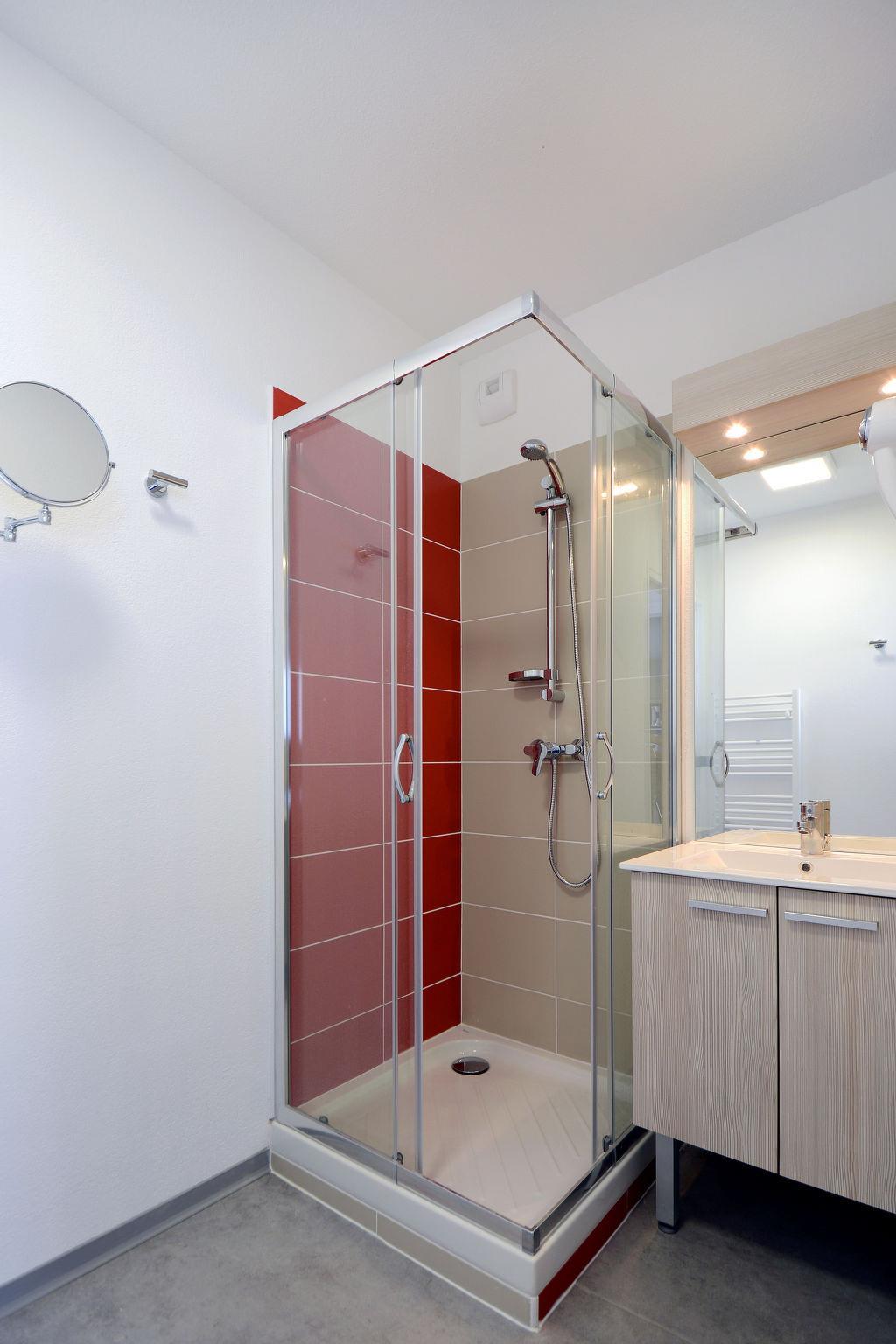 "Résidence Odalys Collection Nakâra", 3-room terraced house 42 m2 on 2 levels. Beautiful furnishings: living/sleeping room with 1 double sofabed (140 cm, length 190 cm), dining table and TV. Exit to the terrace. Small, open kitchen (dishwasher, 4 ceramic glass hob hotplates, toaster, kettle, freezer, electric coffee machine, combination microwave). Sep. WC. Upper floor: 1 room with 1 french bed (160 cm, length 190 cm). 1 small room with 1 x 2 bunk beds. Bath or shower. Electric heating. Terrace. Terrace furniture. Facilities: children's high chair, baby cot. Internet (WiFi, free). Please note: non-smoking house. Maximum 1 pet/ dog allowed. Smoke alarm, fire extinguisher.