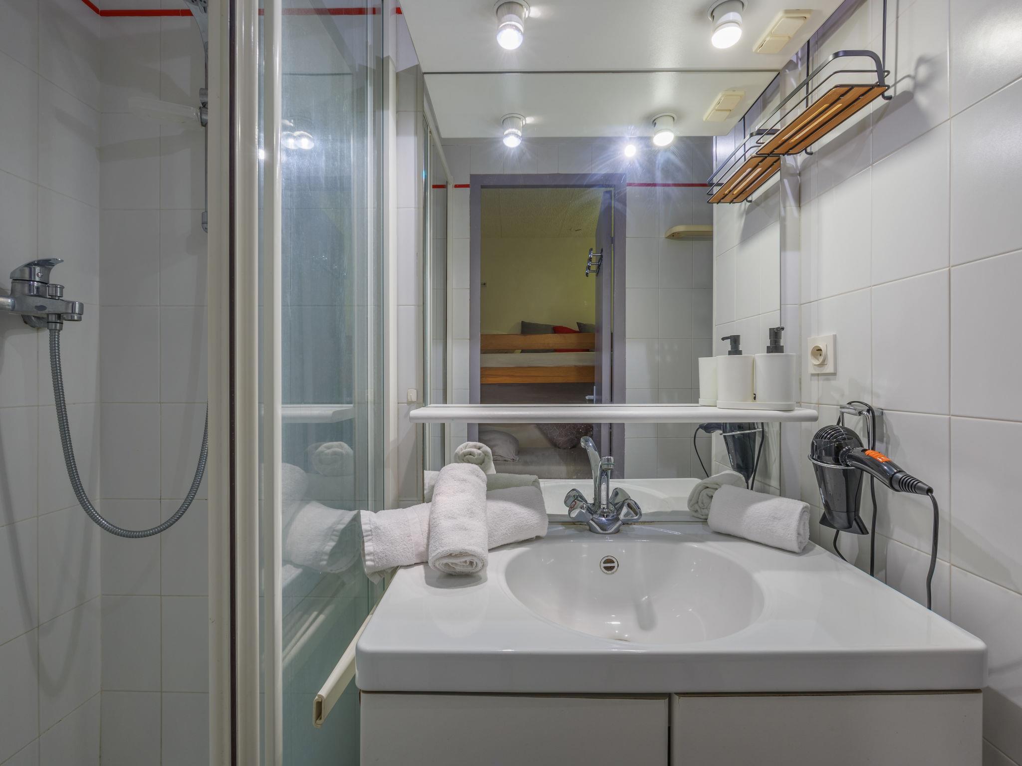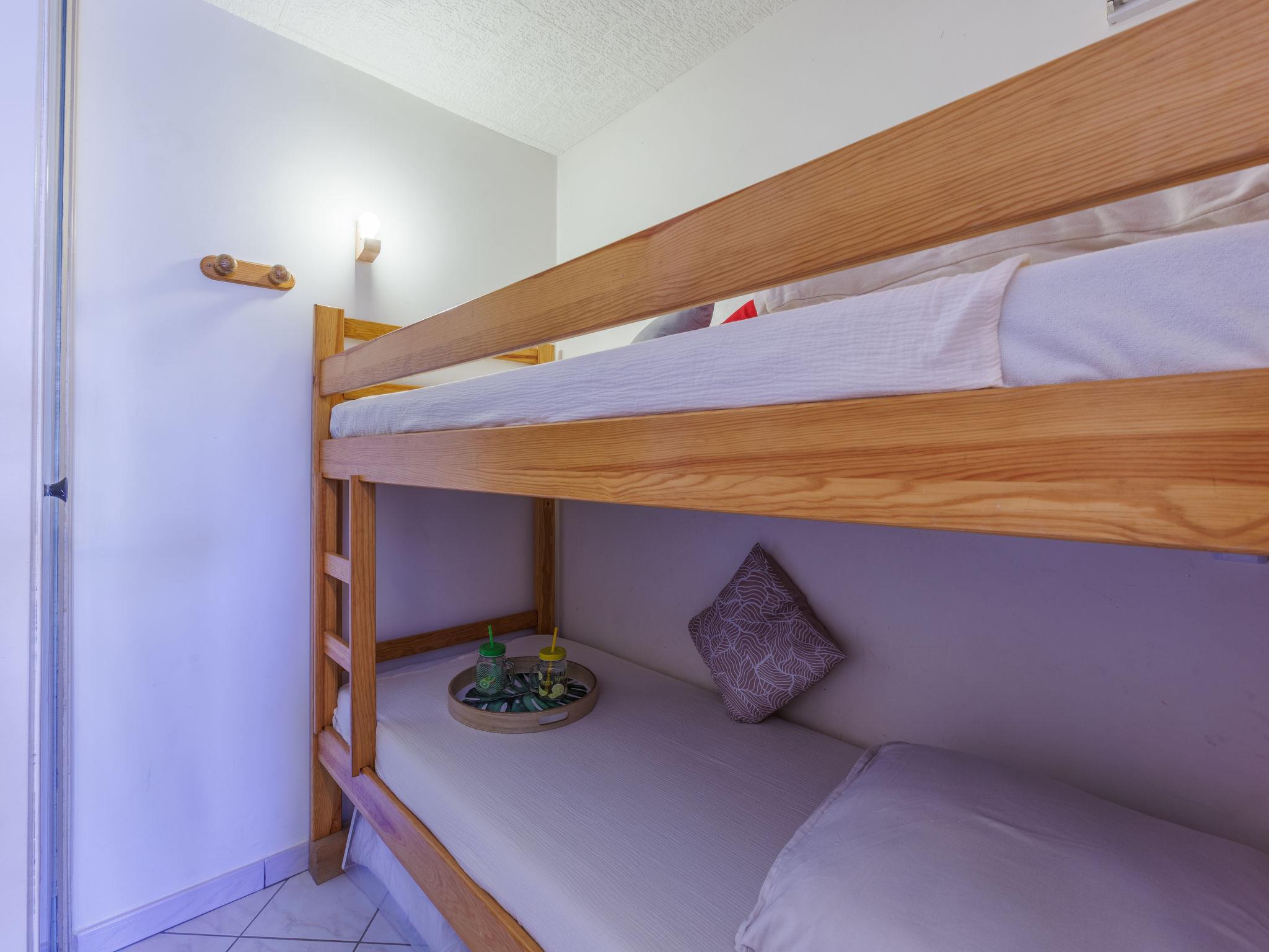 1-room studio 20 m2, on the ground floor. Living/sleeping room with 1 fold-away bed (140 cm, length 190 cm), TV (flat screen), air conditioning. Exit to the terrace. Open sleeping alcove with 1 x 2 bunk beds (140 cm, length 190 cm). Kitchenette (oven, dishwasher, 2 ceramic glass hob hotplates, toaster, kettle, microwave, electric coffee machine, Capsules for coffee machine (Nespresso)). Shower/WC. Electric heating. Large terrace 10 m2. Terrace furniture. Facilities: washing machine. Internet (WiFi, extra). Parking space n 35. Please note: smoke alarm. Instead of an enclosed bedroom, some sleeping areas are located in an open-plan area (gallery, alcove, etc.). Offer by a private individual according to Art. 155, IV of CGI.