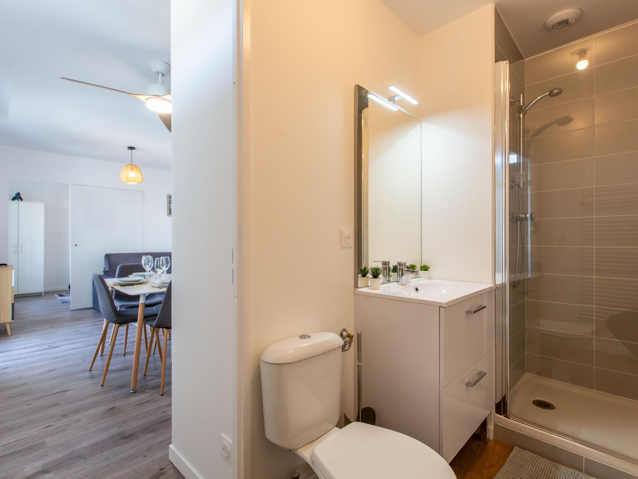 Capbreton: Apartment block "Cap Océan", 2 storeys, built in 2023. 17 apartments in the residence. In the resort, 150 m from the sea, 150 m from the beach. In the complex: washing machine, tumble dryer (for shared use). Public parking on the road. Shop 300 m, grocery 150 m, supermarket 1.8 km, restaurant 50 m, bakery 150 m, bicycle rental 100 m, bus stop "Capbreton Estacade" 300 m, sandy beach "Du Prévent" 150 m. Golf course (18 hole) 4 km, surf school 150 m, tennis 3 km, minigolf 200 m, riding stable 1 km. Nearby attractions: Seignosse 15 km, Bayonne 22 km, Dax 37 km, Biarritz 37 km. Well-known lakes can easily be reached: Réserve Naturelle des Marais d’Orx, Réserve Naturelle du courant d’Huchet.