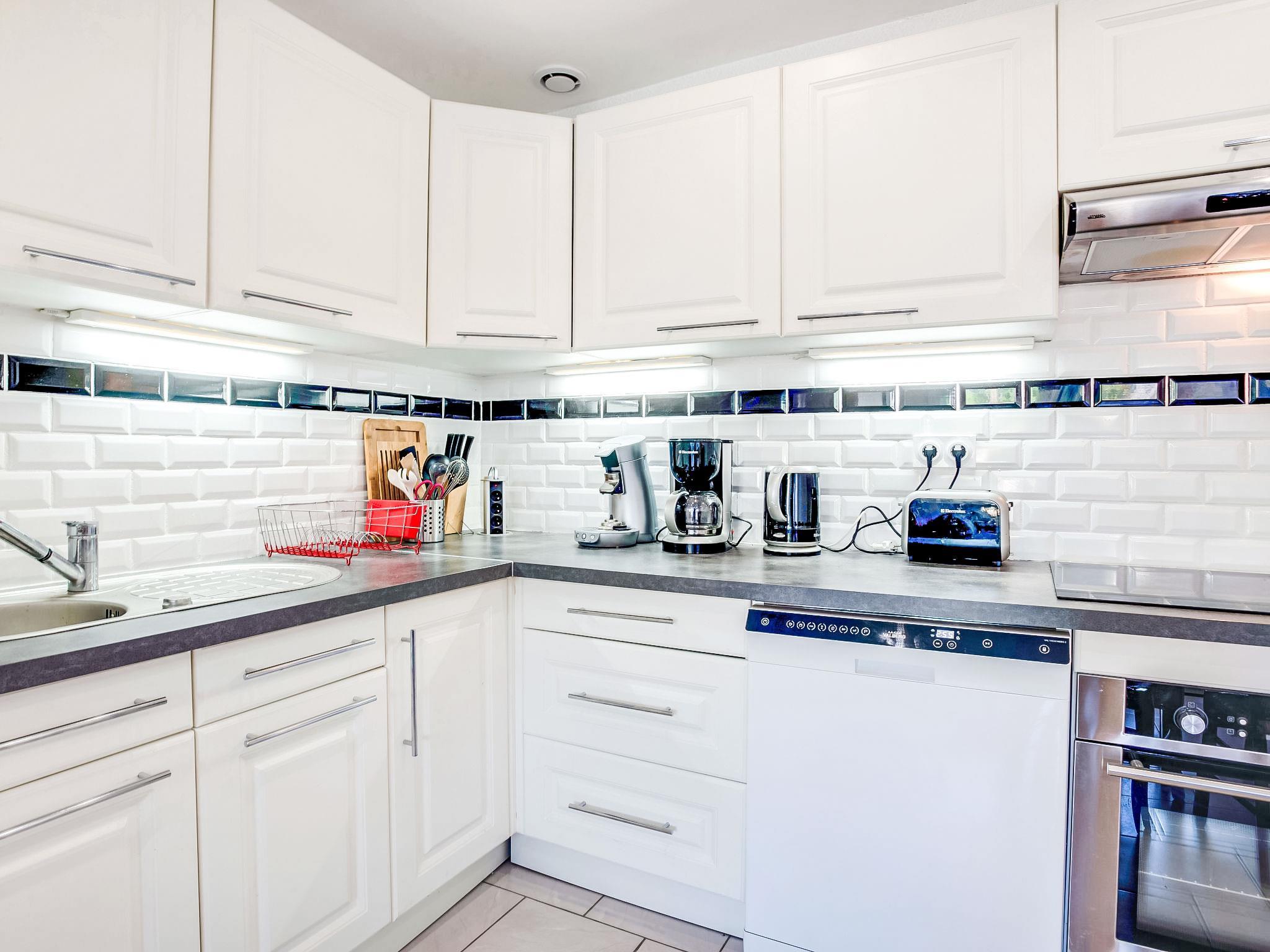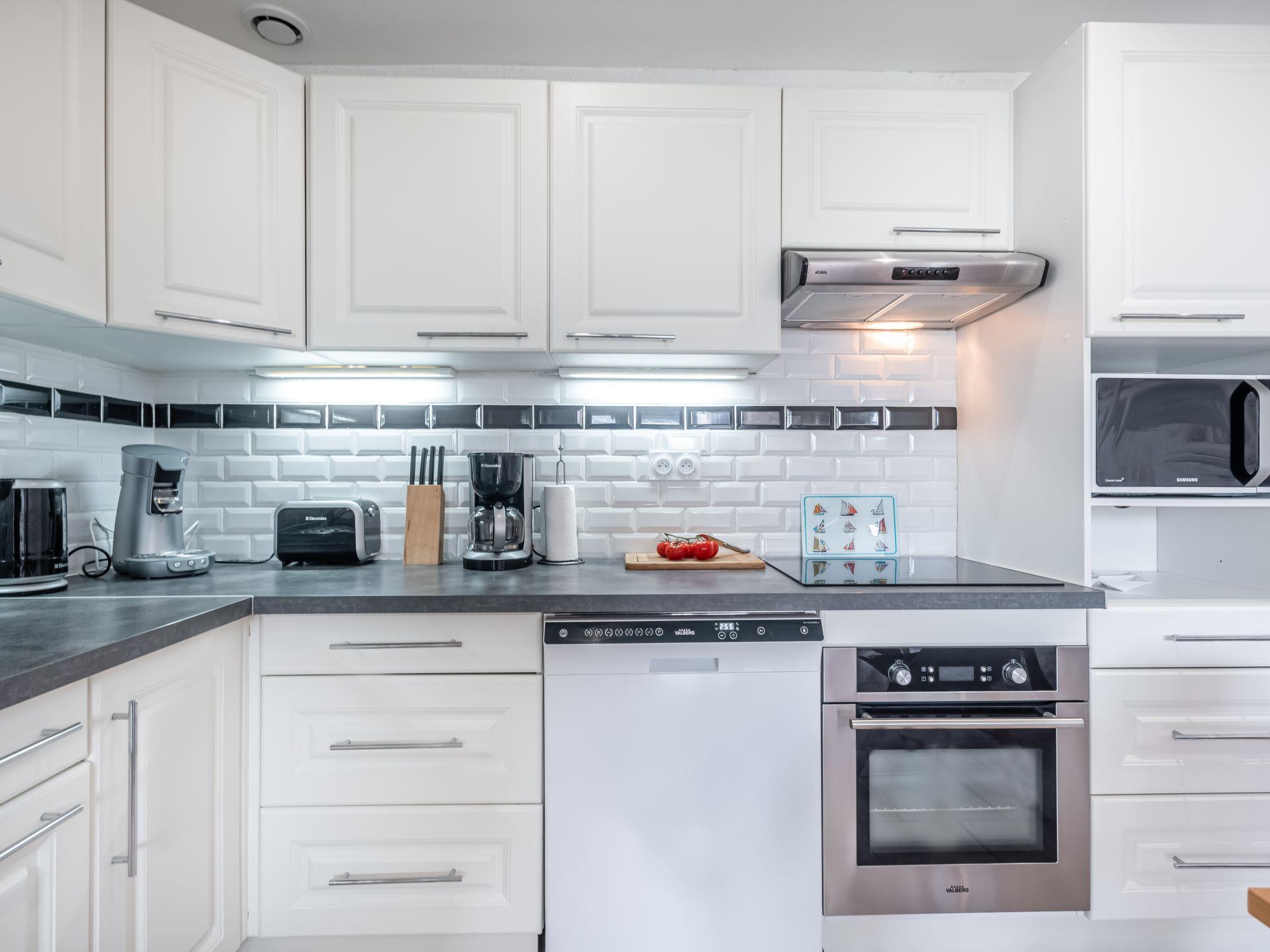 3-room apartment 42 m2, on the ground floor. Renovated in 2017, comfortable and beautiful furnishings: living/dining room with TV (flat screen). Exit to the garden, to the terrace. 1 room with 2 beds (90 cm, length 190 cm). 1 room with 1 french bed (1 x 140 cm, length 190 cm). Open kitchen (oven, dishwasher, 4 induction hot plates, microwave, freezer, electric coffee machine) with dining table. Shower, sep. WC. Electric heating. Terrace 12 m2. Terrace furniture, deck chairs (4). View of the resort. Facilities: washing machine, dryer, iron. Internet (WiFi, free). Parking space n 50 (1 car). Please note: smoke alarm. Plancha available. 56258 000153 4O