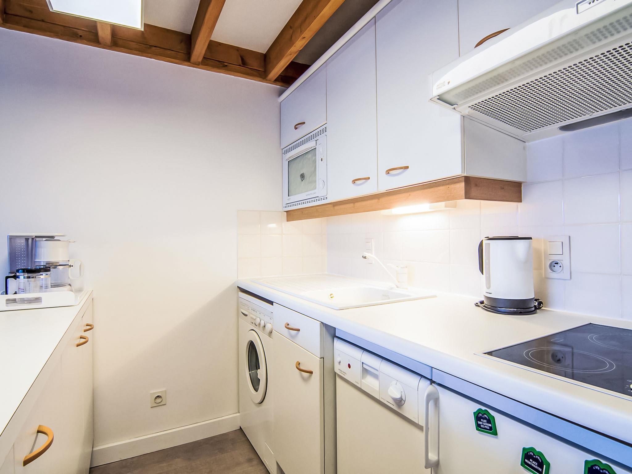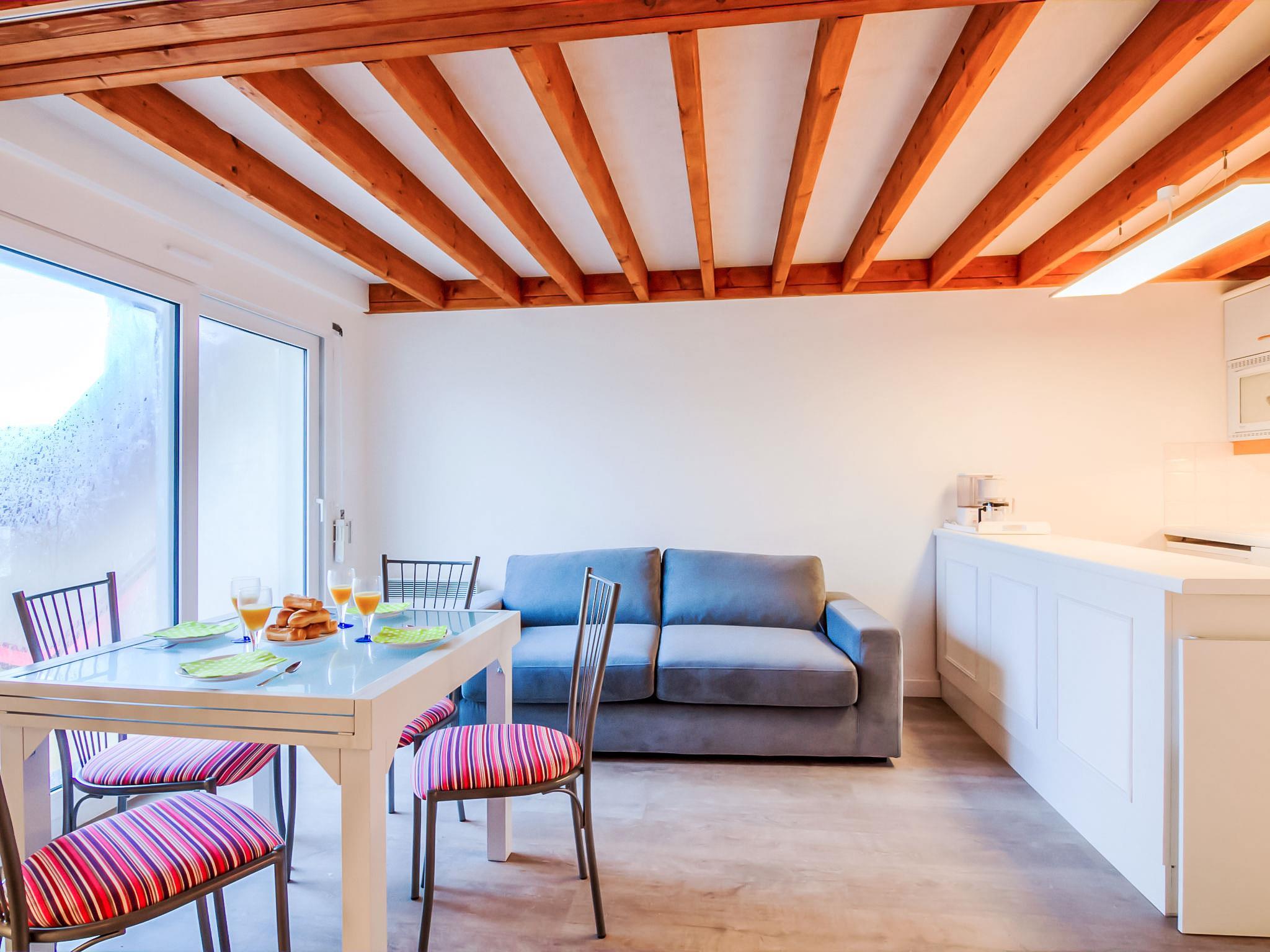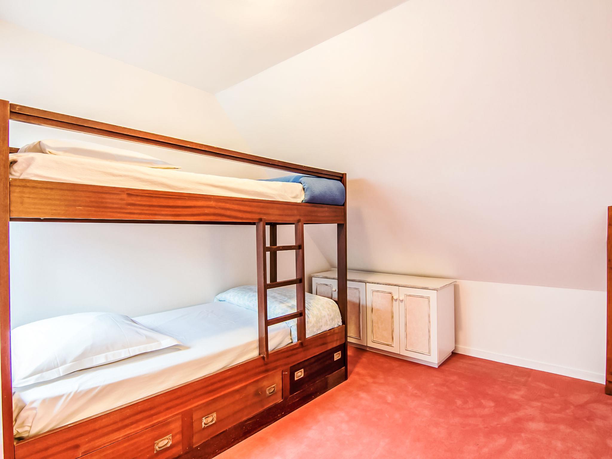 3-room apartment 41 m2 on 2 levels on 1st floor. Practical and beautiful furnishings: living/dining room with panoramic window with TV (flat screen). Exit to the balcony. 1 room with 1 french bed (1 x 140 cm, length 190 cm). Kitchenette (mini-oven, dishwasher, 2 ceramic glass hob hotplates, electric coffee machine). Sep. WC. Upper floor: 1 children's room with 1 x 2 bunk beds (90 cm, length 190 cm). Bathroom. Electric heating. Balcony furniture. Side view of the swimming pool. Facilities: washing machine. Internet (WiFi, free). Parking space n 1-7. Please note: smoke alarm. Swimming pool completely renovated in 2022. 56034000762D3