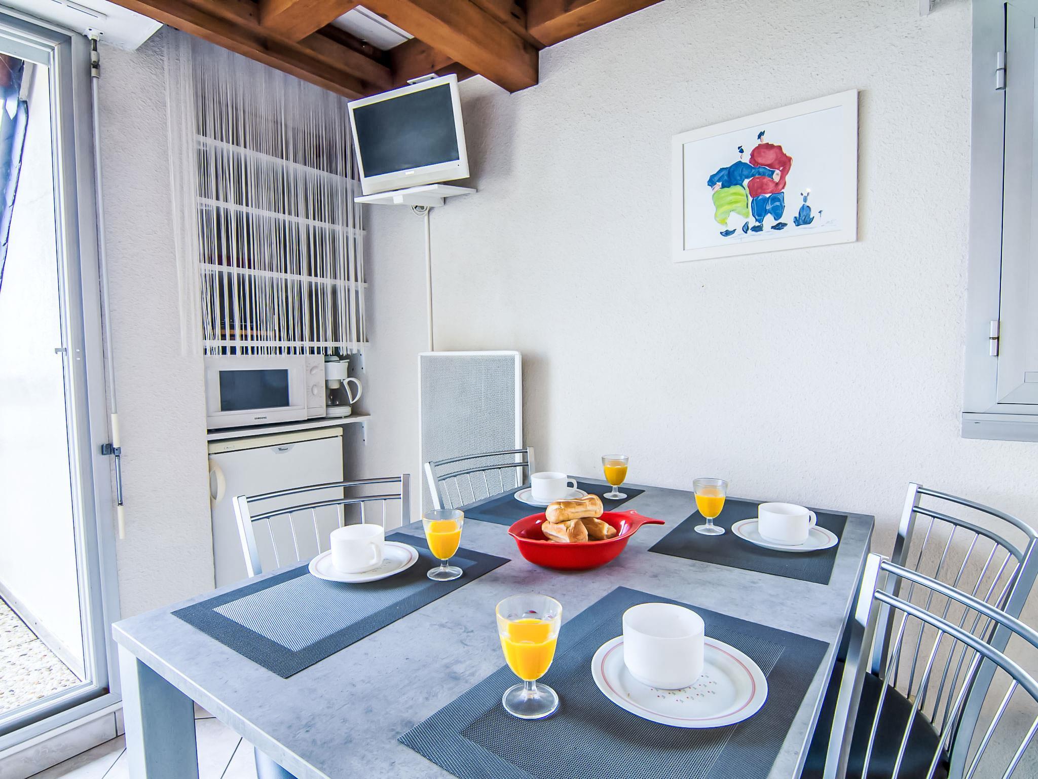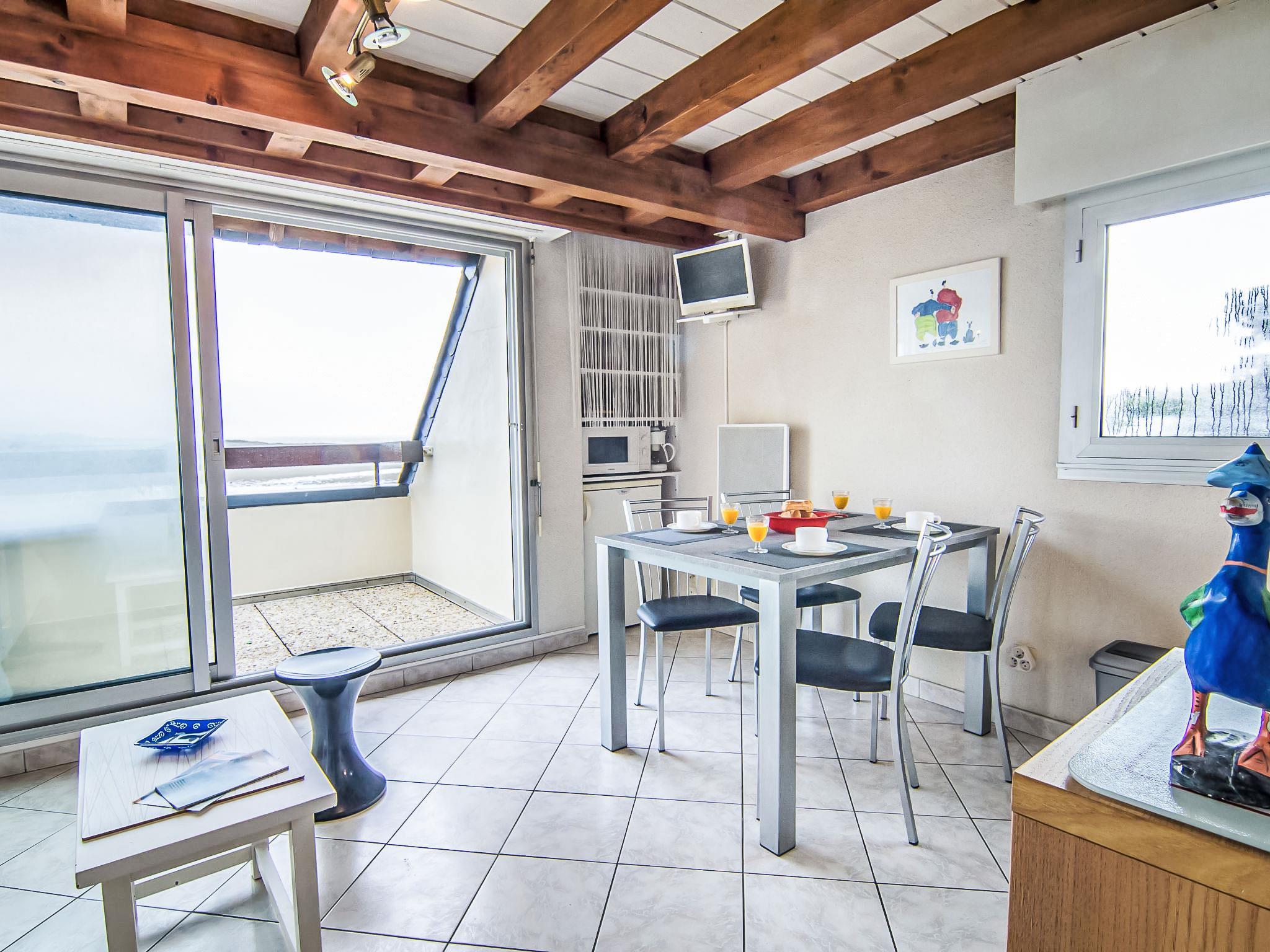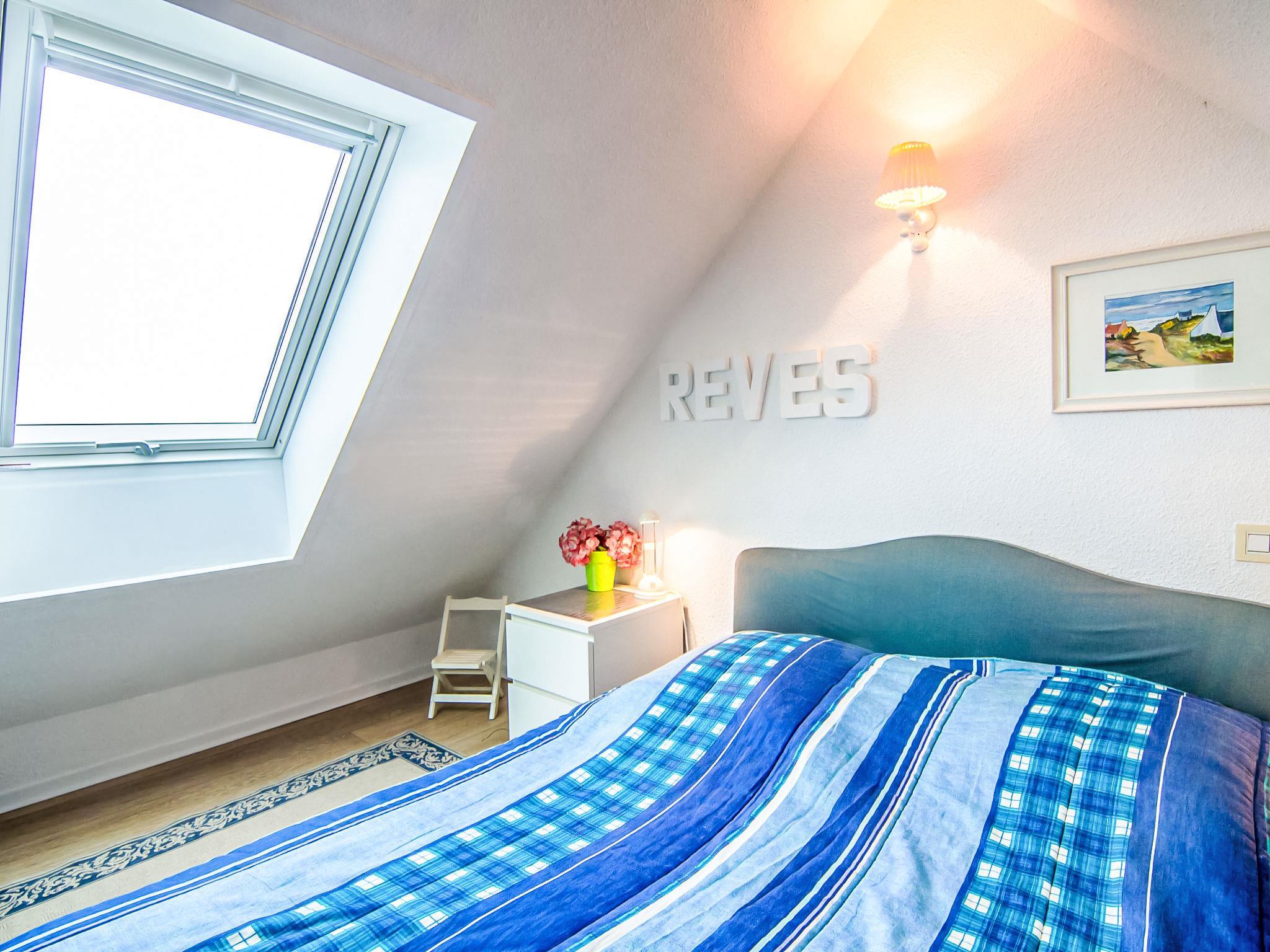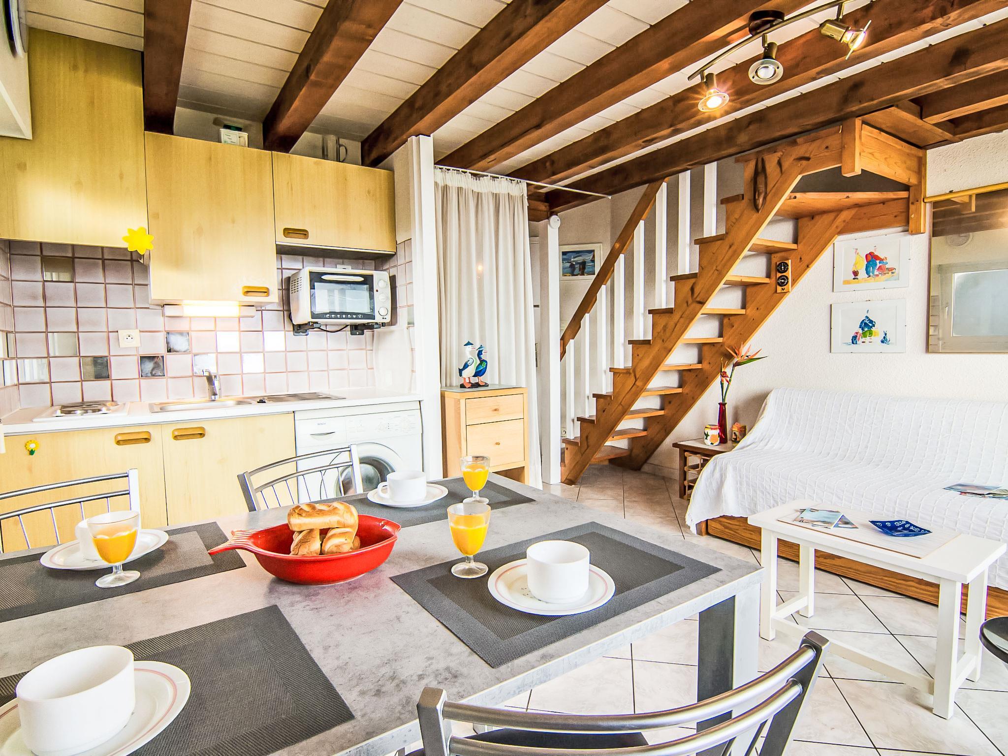 2-room apartment 29 m2 on 2 levels on 2nd floor, south-east facing position. Living/dining room with 1 pull-out bed (2 pers.), TV. Exit to the balcony. Kitchenette (2 hot plates, oven, microwave). Bath/WC. Upper floor: 1 room with sloping ceilings with 1 french bed (140 cm). Balcony 5 m2. Balcony furniture. Beautiful view of the sea. Facilities: washing machine, hair dryer. Internet (WiFi, extra). Parking space n 14. Please note: TV only FR. Smoke alarm.
