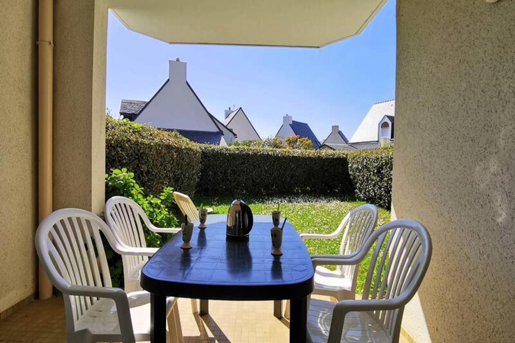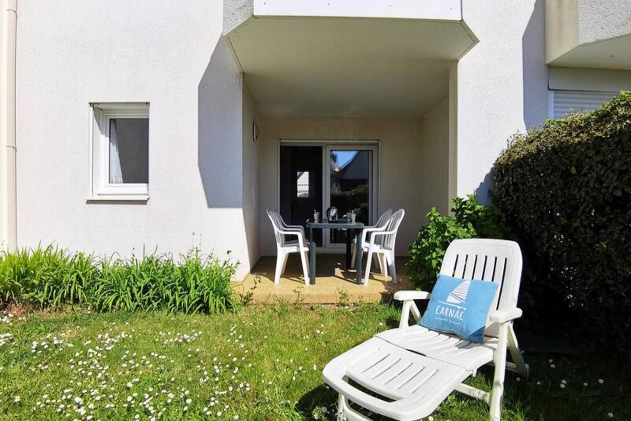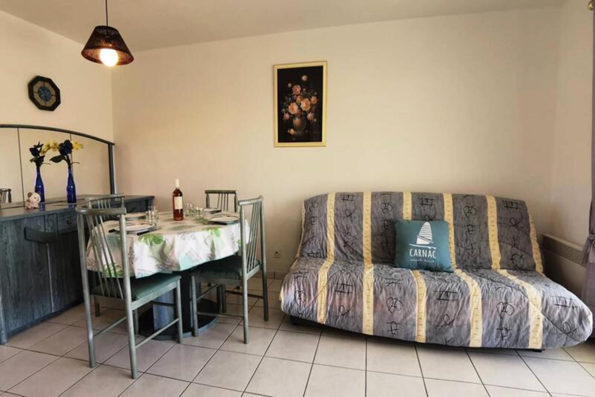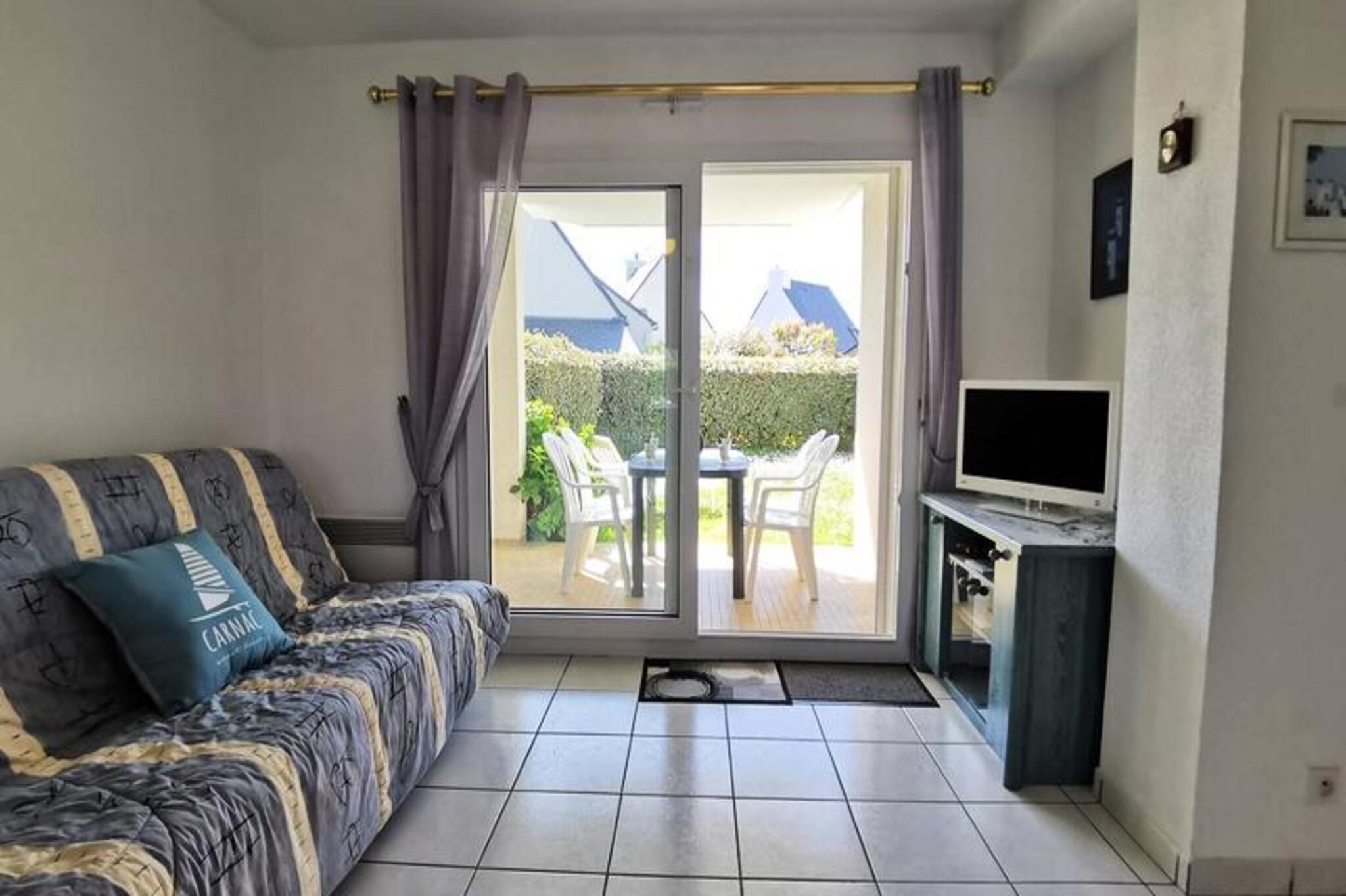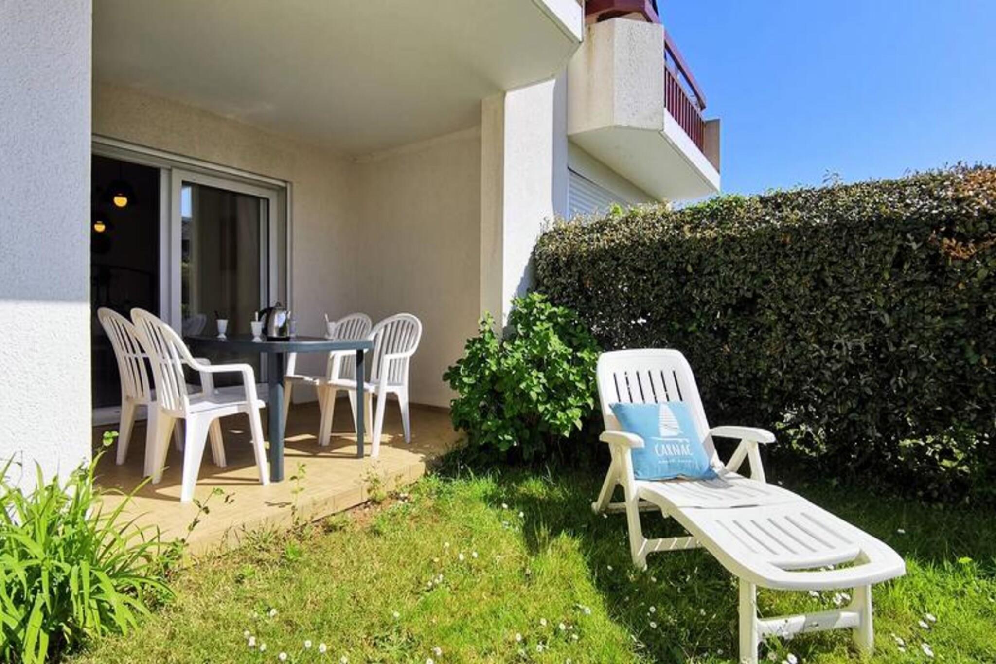 This cozy 2-room apartment offers a comfortable retreat for up to 4 guests. The bedroom is furnished with a double bed, while the living room features a sofa bed that sleeps 2 additional people. Located on the ground floor of a residential complex, the apartment also includes a dining area and lounge with a TV, providing a perfect spot for relaxation. Pets are not allowed in the property. There is a reserved parking space (No. 30) for guests, and energy consumption costs are included in the rental price, with the option for additional services like end-of-stay cleaning and linen rental. Located just 400 meters from Légenèse beach and 1 km from Carnac Thalassotherapy, the apartment offers convenient access to local attractions. The charming cafés, markets, and shops of the area are within walking distance, providing plenty of opportunities to explore the local culture. Guests can enjoy beachside activities or indulge in the nearby wellness treatments for a well-rounded getaway. The apartment comes equipped with a fully functional kitchen, including a 4-burner electric hob, refrigerator, microwave, and washing machine, making it easy to cook and refresh during your stay. The bathroom provides essential amenities, and there is a separate WC for convenience. For outdoor enjoyment, the living room opens to a west-facing terrace, with garden furniture extending to the garden area. Guests can also enjoy the shared swimming pool open from mid-June to mid-September.