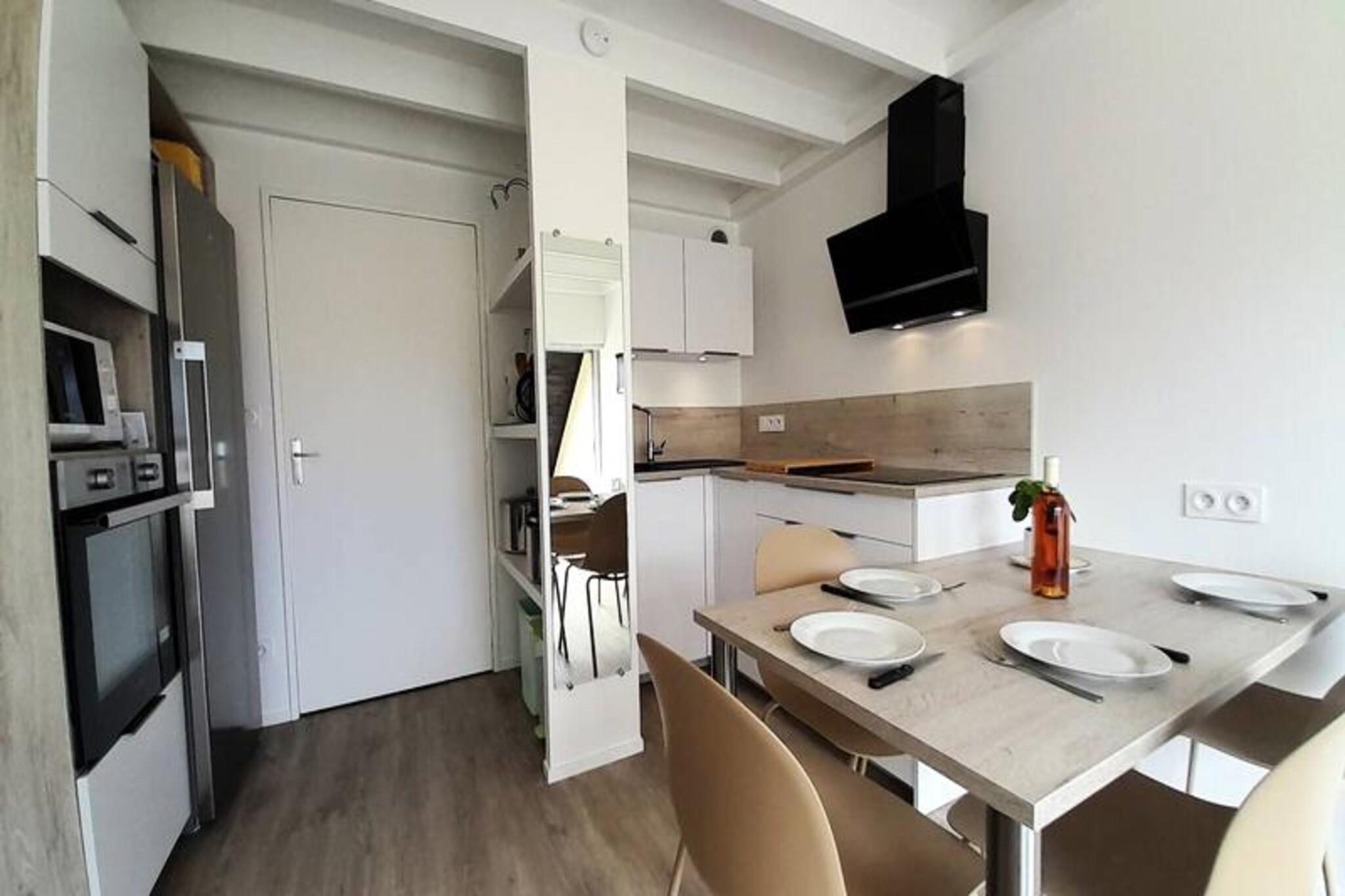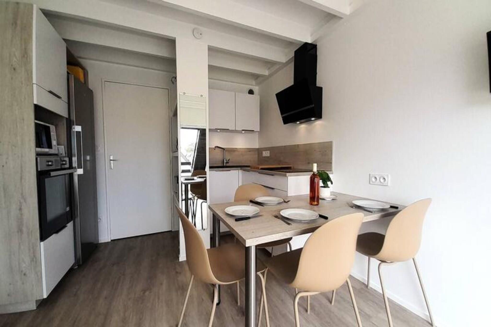 Denne hyggelige 28 m² duplex lejlighed kan komfortabelt rumme op til fire gæster. Sovearrangementer inkluderer en dobbelt sovesofa (140 cm) i stuen og en dobbeltseng (140 cm) plus en enkeltseng (90 cm) i det åbne loftsværelse ovenpå. Et kæledyr er accepteret for yderligere 4 EURO per dag. Varme og energiforbrug er inkluderet. Beliggende roligt kun 200 m fra Beaumer-stranden og 500 m fra Grande Plage og et supermarked, tilbyder denne lejlighed nem adgang til havet og daglige fornødenheder. Lejligheden har en stue med spise- og opholdsstue med udgang til en sydvendt terrasse med havemøbler. Det veludstyrede tekøkken omfatter induktionskomfur med 3 brændere, køleskab, ovn og mikroovn. Der er en nedenunder pulver værelse og toilet, og ovenpå er det åbne soveværelse. Parkering er til rådighed. En forbrugspakke på 35 EURO pr. uge gælder, undtagen fra 23. maj til 20. september 2025. Valgfrie tjenester omfatter slutrengøring (65 EURO), leje af sengetøj, udstyr til børnepasning og en Wi-Fi-miniboks.