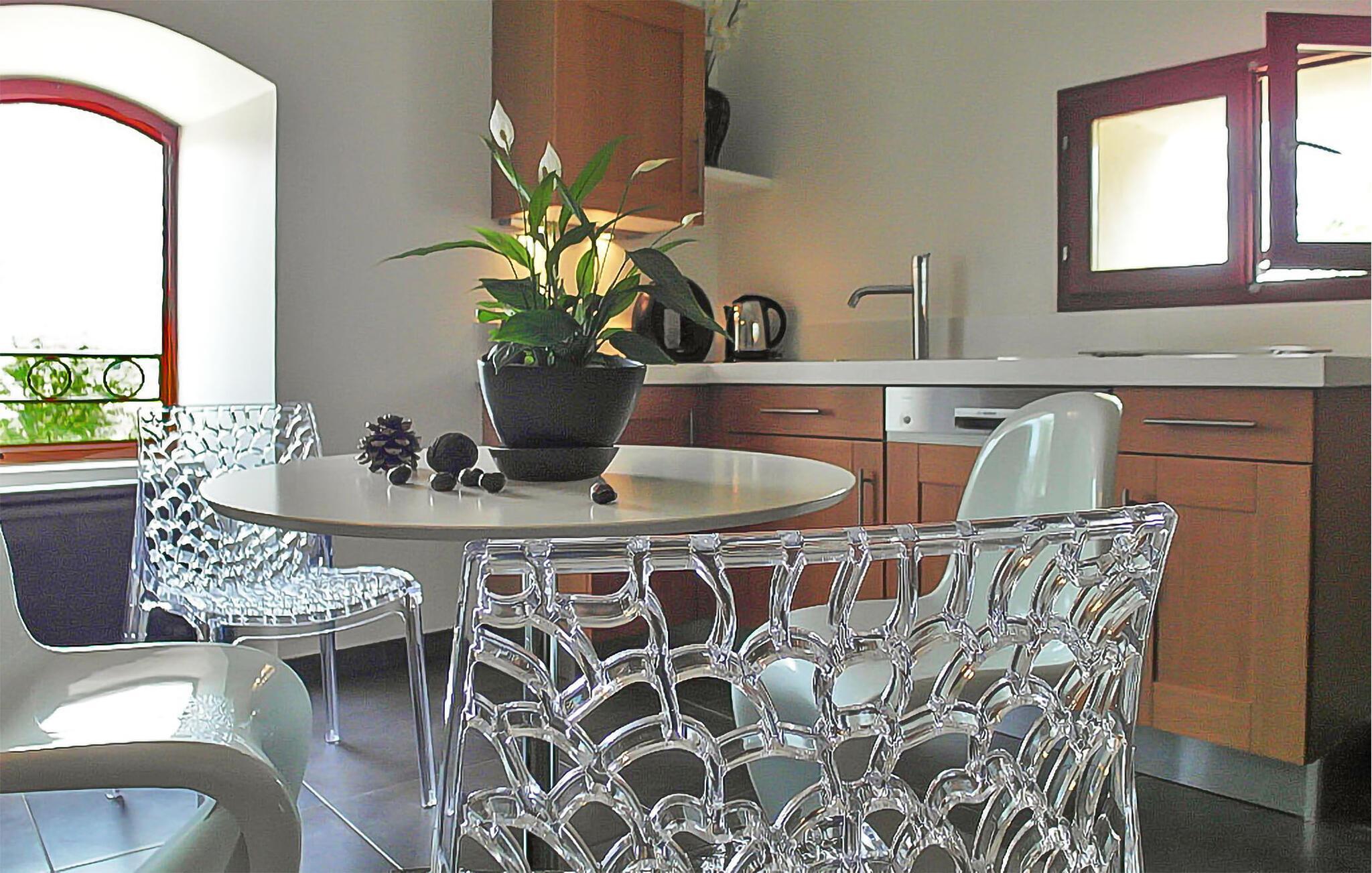 Dette historiske kloster fra det 9. århundrede, nu omdannet til et prestigefyldt feriehus, tilbyder en idyllisk tilflugtssted mellem Nimes og Montpellier. Beliggende midt i vinmarker på en fredfyldt ejendom, lover dette charmerende lejemål et romantisk tilflugtssted. Gå op gennem stentrapper til dette raffinerede tilflugtssted. Indenfor kan du opdage et indbydende opholdsområde, der er udsmykket med synlige stenvægge og vintage bjælker, med en hjemmebiograf til afslappede aftener. Det velindrettede køkkenområde kan prale af moderne apparater såsom en Nespresso-kaffemaskine. Det hyggelige soveværelse byder på en dobbeltseng og en Louis XV-garderobe, mens det luksuriøse badeværelse er udstyret med et foryngende spabad med massagedyser, farveterapi og et brusekabine, hvilket sikrer ultimativ afslapning. Udendørs faciliteter inkluderer et fælles vaskerum, malerisk udsigt over vingården og en fælles swimmingpool sikret med en alarm (12 mx 5 m, dybde: 1,20 m - 2 m). Selvom terrassen ikke er direkte forbundet med lejemålet, har gæsterne et privat område i parken perfekt til udendørs spisning. For dem, der søger yderligere tjenester eller aktiviteter, kan massagesessioner arrangeres på stedet (detaljer gives efter anmodning), mens cykelture er blandt de mange rekreative muligheder, der tilbydes mod et ekstra gebyr. Ejendommen er beliggende mellem Nîmes og Montpellier, tæt på landsbyen Carnas, nær den middelalderlige landsby Sommières. Med 300 solskinsdage om året byder dette hjørne af paradis i den provencalske Gard på landskaber af sjælden skønhed: 30 minutter mod syd strækker dammene i Camargue og sandstrandene i Languedoc. Et stenkast væk afslører nationalparken Cévennes lige så spektakulære landskaber. Regionen er rig på en fantastisk historisk arv: Byen Avignon, de romerske byer Nîmes og Arles, Pont du Gard, Hertugdømmet Uzès, de historiske Languedoc-byer Montpellier, Pézenas, Aigues-Mortes, Sommières og Sauve og et væld af charmerende landsbyer at besøge. Denne ferieejendom er et ideelt udgangspunkt for at opdage Camargue, Cevennerne, Gard Provençal, Languedoc.