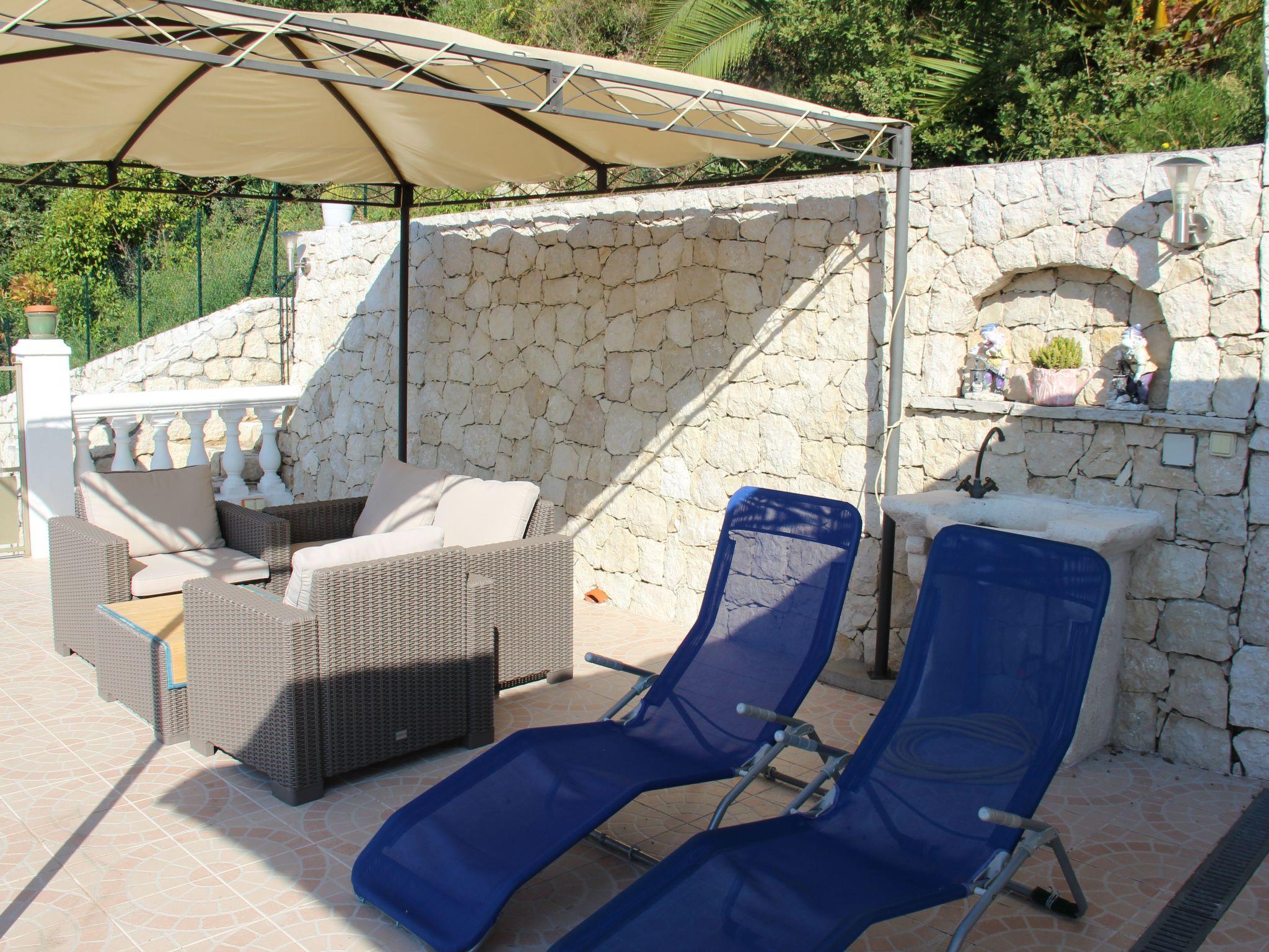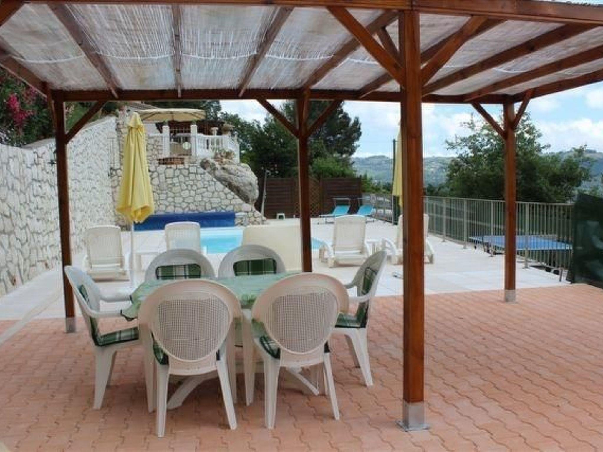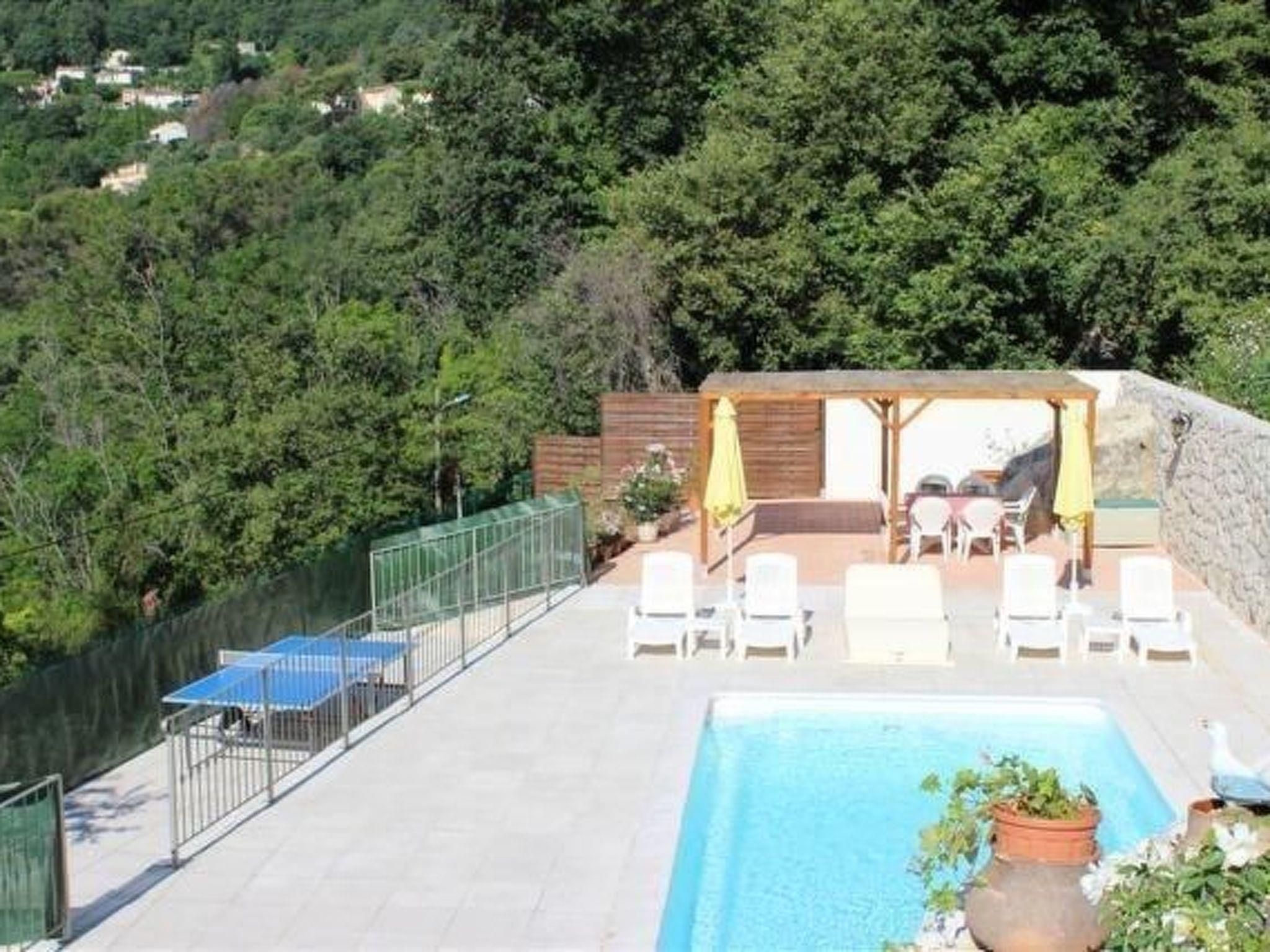 The 80 m² terrace, enclosed and protected from the sun, communicates with the living room. Here you can enjoy absolute peace and quiet. Parents can relax while the children play. The terrace has an arbour (5 x 3 m) and a pergola (3.5 x 3.5 m), a barbecue, a wall-mounted pizza oven, garden furniture, a table and chairs and sun loungers. This means you can spend plenty of time outside enjoying the barbecue, eating, relaxing and lounging. From the terrace, you can access your own private swimming pool (8 x 4 m, 1 m to 1.70 m deep), filled with chlorine-treated water and situated just below. Thanks to its sunny location, it's already a pleasant temperature early on. The 200 m² paved area around the pool is furnished with six sun loungers, two parasols and a solar shower. It enjoys all-day sunshine and magnificent sea views. Enjoy the peace and quiet as you listen to the birds and cicadas. For those who like to be a little more active, a table tennis table and table football are available. The property has an automatic entrance gate, automatic lighting and two parking spaces.