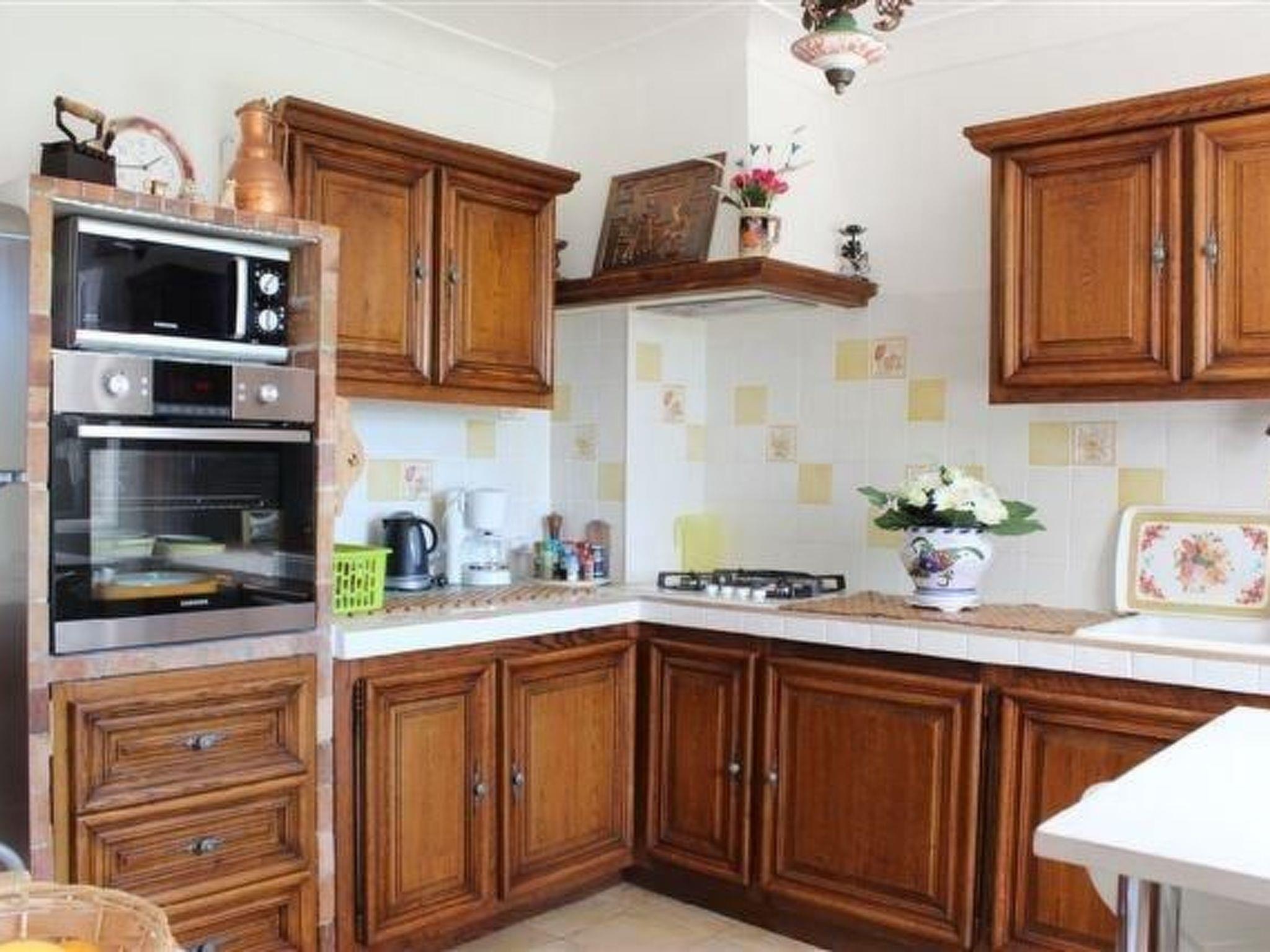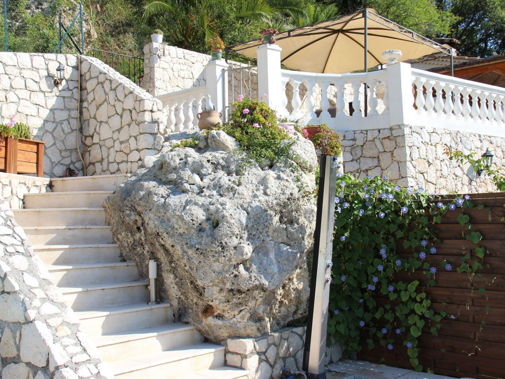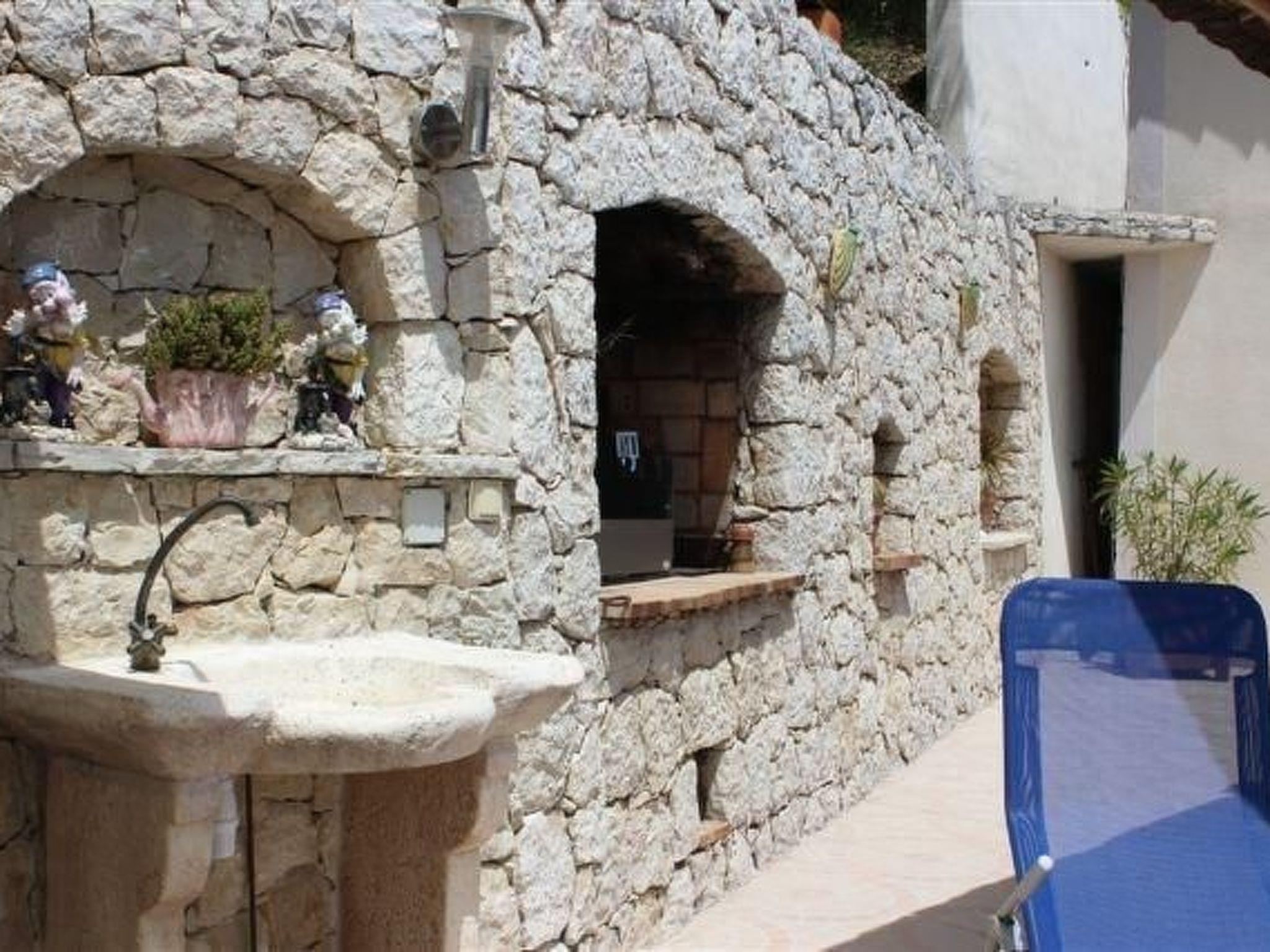 The 80 m² terrace, enclosed and protected from the sun, communicates with the living room. Here you can enjoy absolute peace and quiet. Parents can relax while the children play. The terrace has an arbour (5 x 3 m) and a pergola (3.5 x 3.5 m), a barbecue, a wall-mounted pizza oven, garden furniture, a table and chairs and sun loungers. This means you can spend plenty of time outside enjoying the barbecue, eating, relaxing and lounging. From the terrace, you can access your own private swimming pool (8 x 4 m, 1 m to 1.70 m deep), filled with chlorine-treated water and situated just below. Thanks to its sunny location, it's already a pleasant temperature early on. The 200 m² paved area around the pool is furnished with six sun loungers, two parasols and a solar shower. It enjoys all-day sunshine and magnificent sea views. Enjoy the peace and quiet as you listen to the birds and cicadas. For those who like to be a little more active, a table tennis table and table football are available. The property has an automatic entrance gate, automatic lighting and two parking spaces.