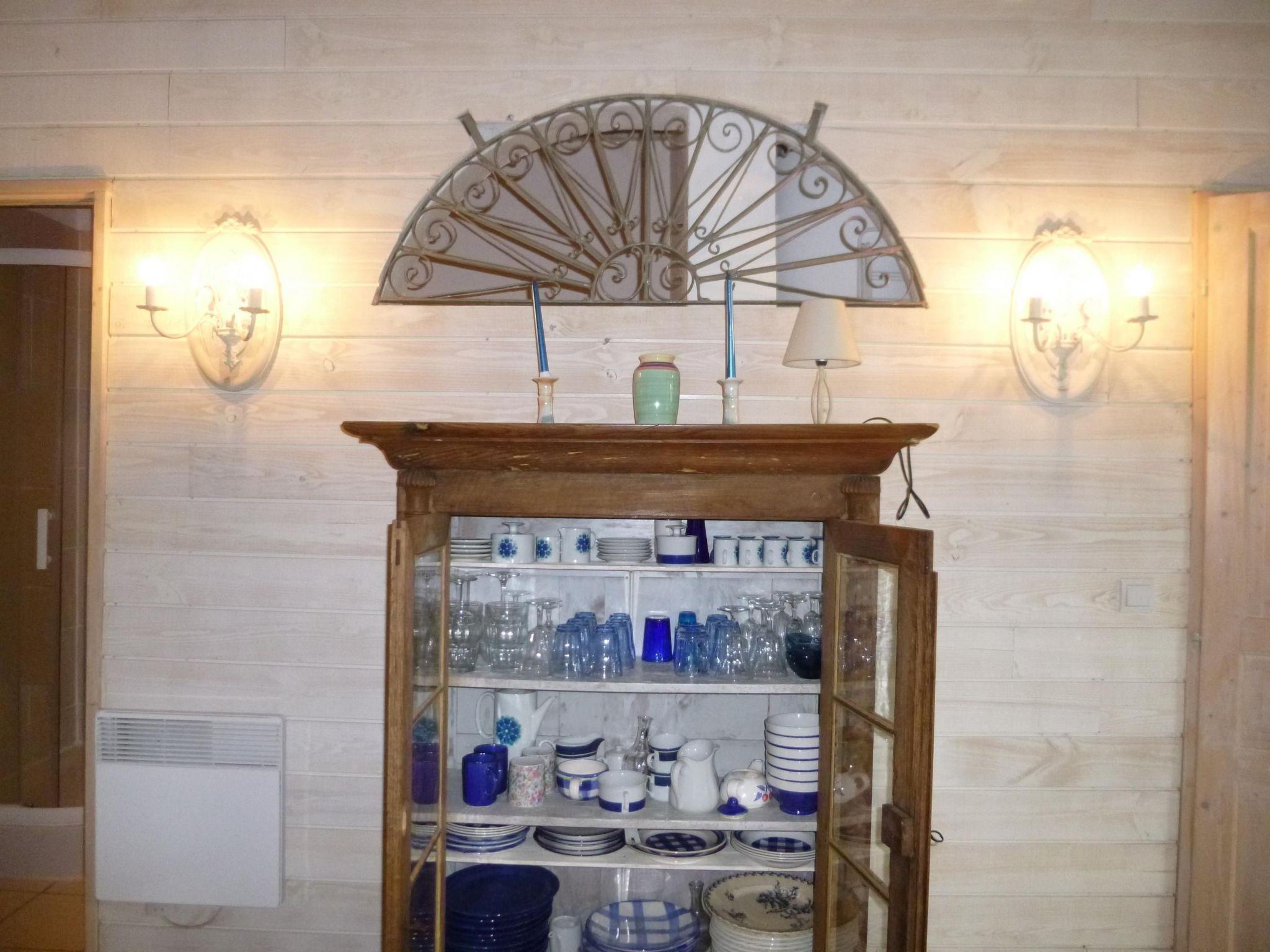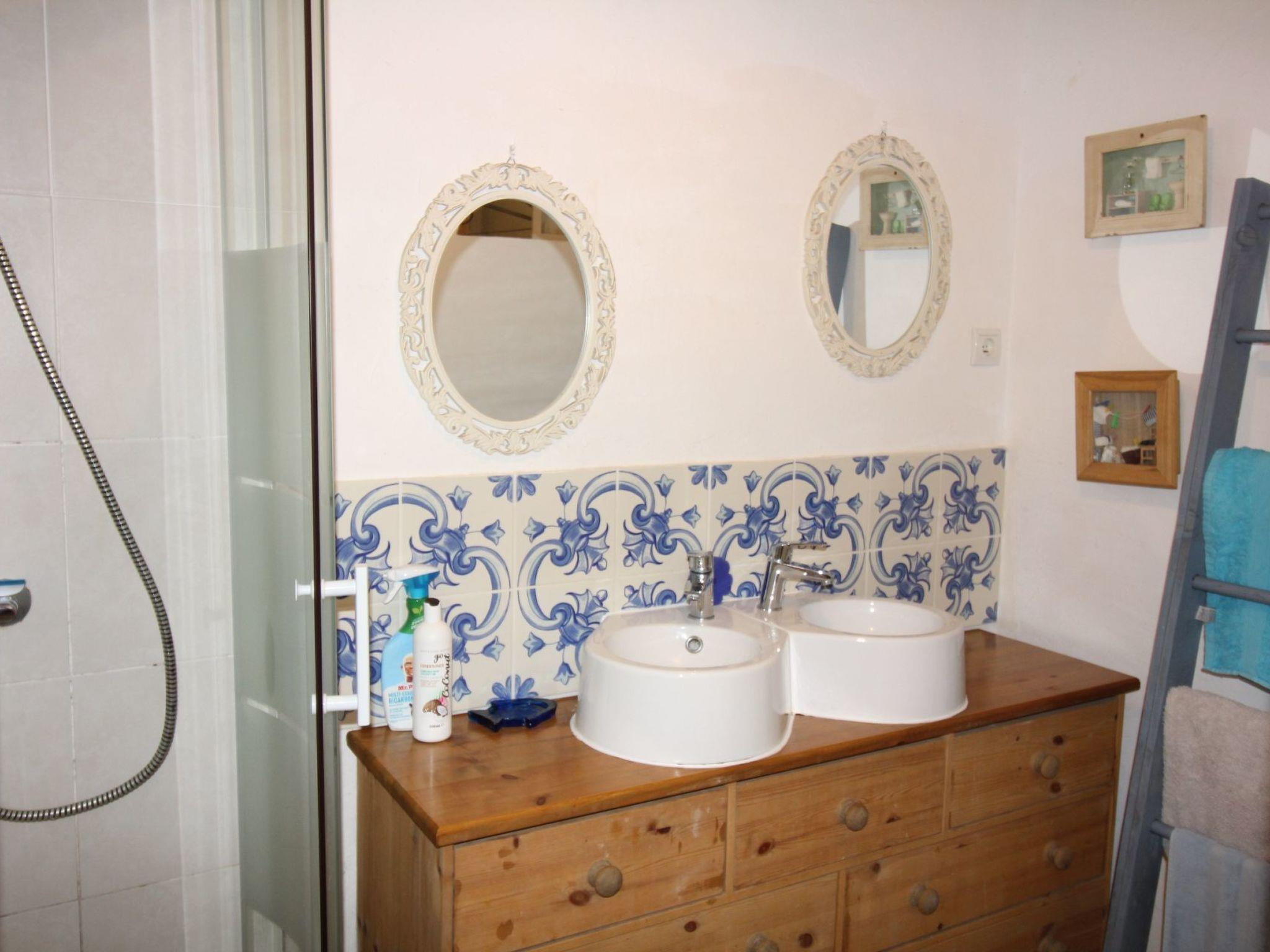 . The wood-burning stove next to the dining area provides pleasant warmth on colder days in the low season. The dining area has a wooden table with four chairs and a sideboard for crockery. The ground floor also has a separate WC and a corner shower room (90 x 90cm) with two washbasins and a wooden cupboard underneath.