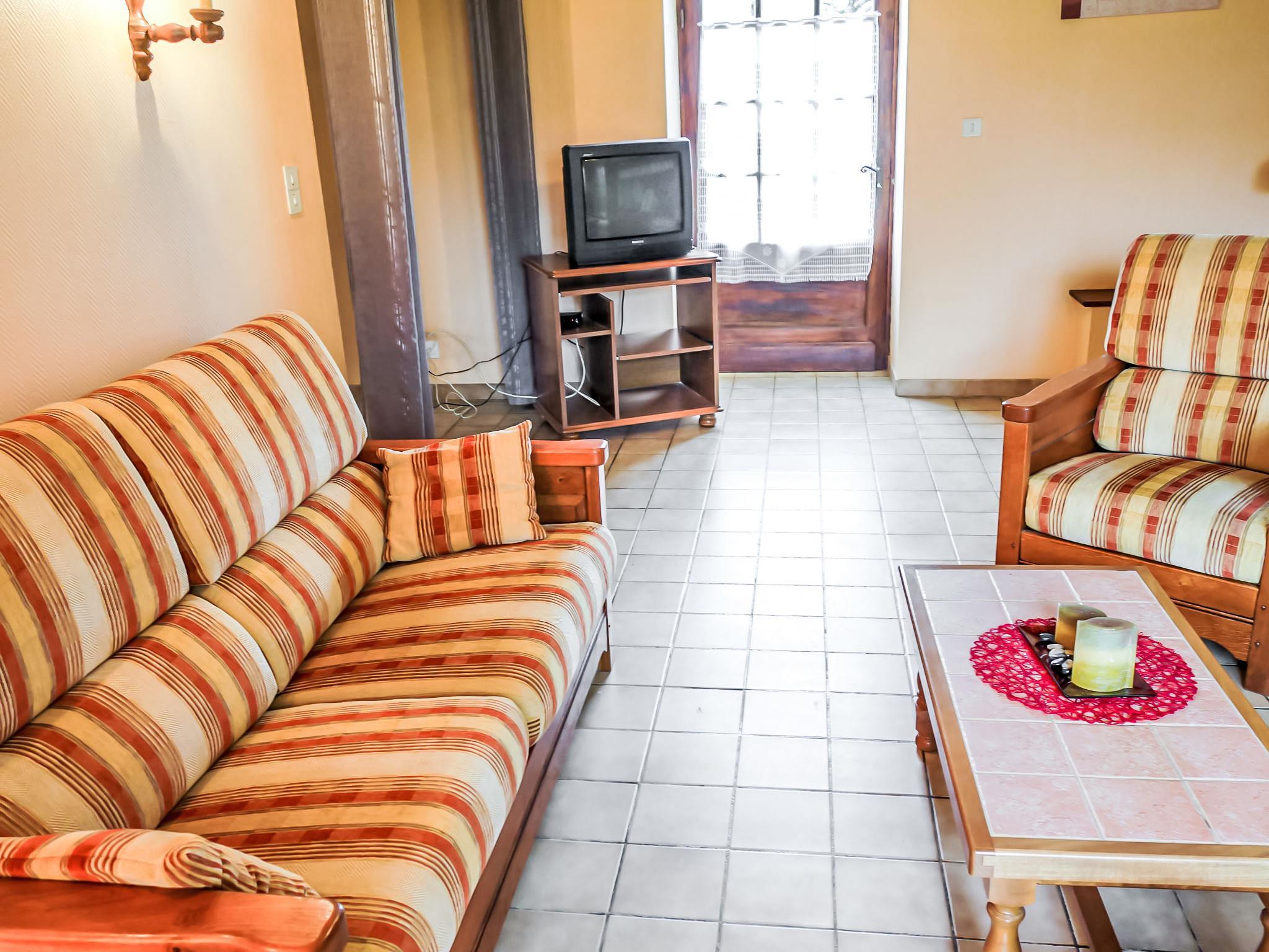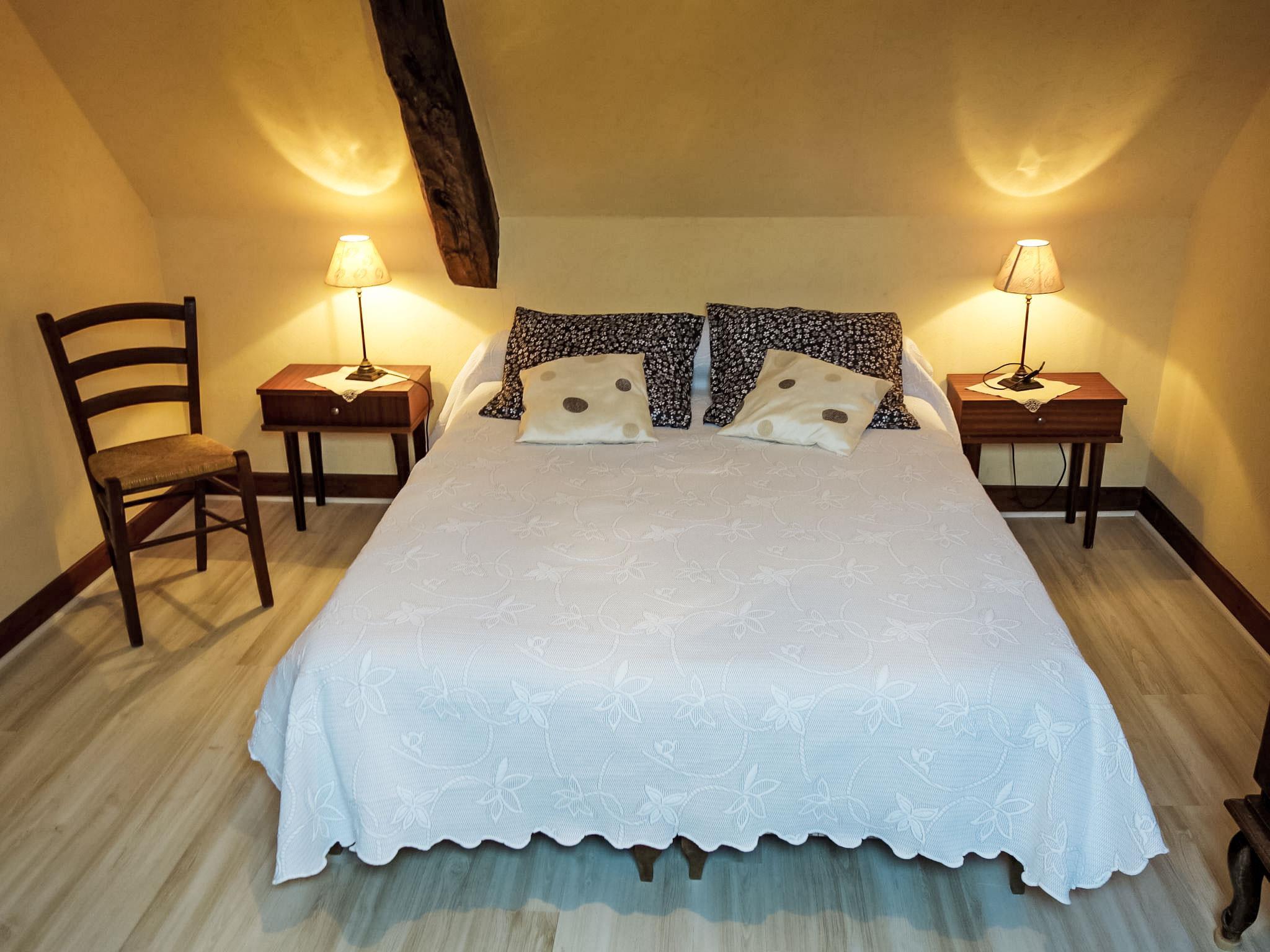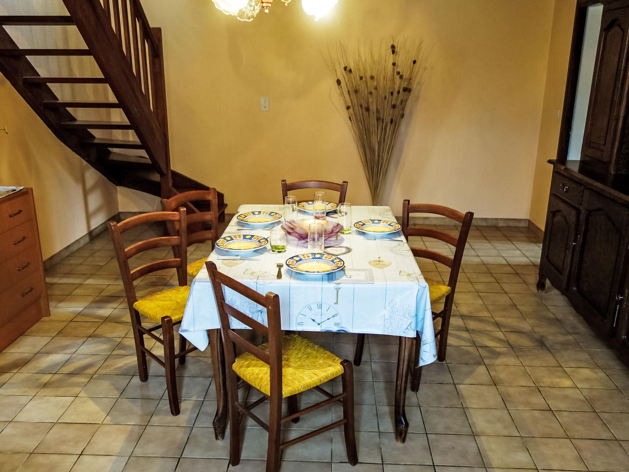 3-room house 90 m2 on 2 levels. Beautiful and rustic furnishings: living/dining room with open-hearth fireplace, dining table and TV (flat screen). Exit to the garden. Kitchen (1 hot plate, oven, dishwasher, 3 gas rings, toaster, kettle, microwave, freezer, electric coffee machine) with dining table. Shower, sep. WC. Boiler (200 litres). Upper floor: 1 room with sloping ceilings with 1 french bed (140 cm, length 190 cm). 1 room with sloping ceilings with 3 beds (90 cm, length 190 cm). Electric heating. Terrace roofed. Terrace furniture, barbecue (portable), deck chairs (5). Facilities: washing machine, iron, children's high chair, baby cot, logs (free). Please note: suitable for families. Non-smoking house. Maximum 1 pet/ dog allowed. Smoke alarm.
