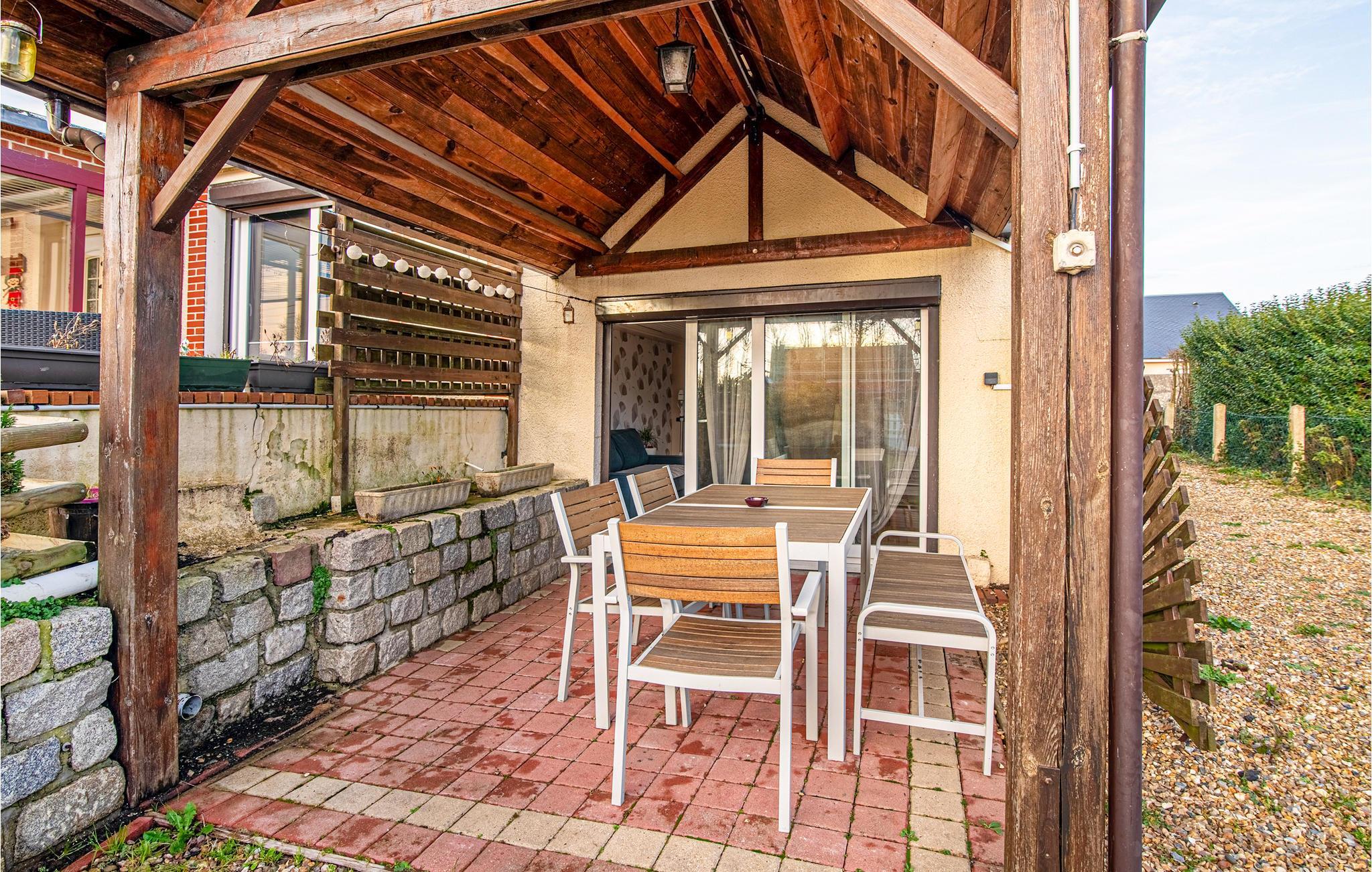 Dette normanniske feriehus har egen indgang og ligger for enden af ??en blind vej i en meget rolig bebyggelse. Glæd jer til husets lyse indretning og praktiske klinkegulve samt den overdækkede terrasse med grill og liggestol. I kan nyde dagens måltider udendørs. Når I vender tilbage efter en smuk dag, kan I samles om kortspil, kølige drinks og en fredfyldt stund i solen.