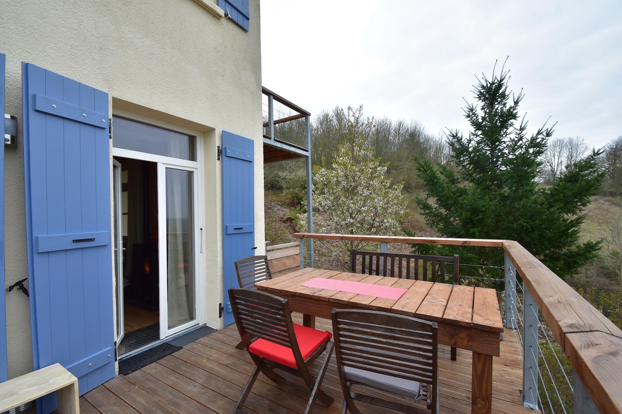 Dette store hus, der tidligere blev brugt til skoleferie, ligger på en delvis skovklædt plads mod en bakke. Bygningen er nu blevet fuldstændig renoveret og 3 luksuslejligheder er blevet oprettet, hver med en smuk udsigt. Din lejlighed har en indgang bagtil i stueetagen og kan rumme 4 personer. Det er meget smukt og moderne indrettet. Nyd udsigten fra den rummelige balkon med en bred udsigt over omgivelserne og swimmingpoolen. Lidt lavere på ejendommen er 2 gites (ikke synlige fra dit hjem). Lejere af gites kan bruge (opvarmet) swimmingpoolen som kan lejere af de to andre lejligheder. (4 x 9 og 1,5 m dyb) .Så mens du har fuldstændig privatliv i din lejlighed kan børnene lege sammen på grund og i swimmingpoolen. Du kan gå frit på hele ejendommen. Tag dine dage på tur i de smukke omgivelser eller besøg et af slotte eller hyggelige byer med interessante antikvitetsforretninger og markeder. I dit feriehus er der information til dig om lokale seværdigheder. I den hyggelige by Cuzy (7 km) finder du gode restauranter og terrasser. Du kan også gå her for alle dine dagligvarer, i de store supermarkeder eller på det ugentlige marked.