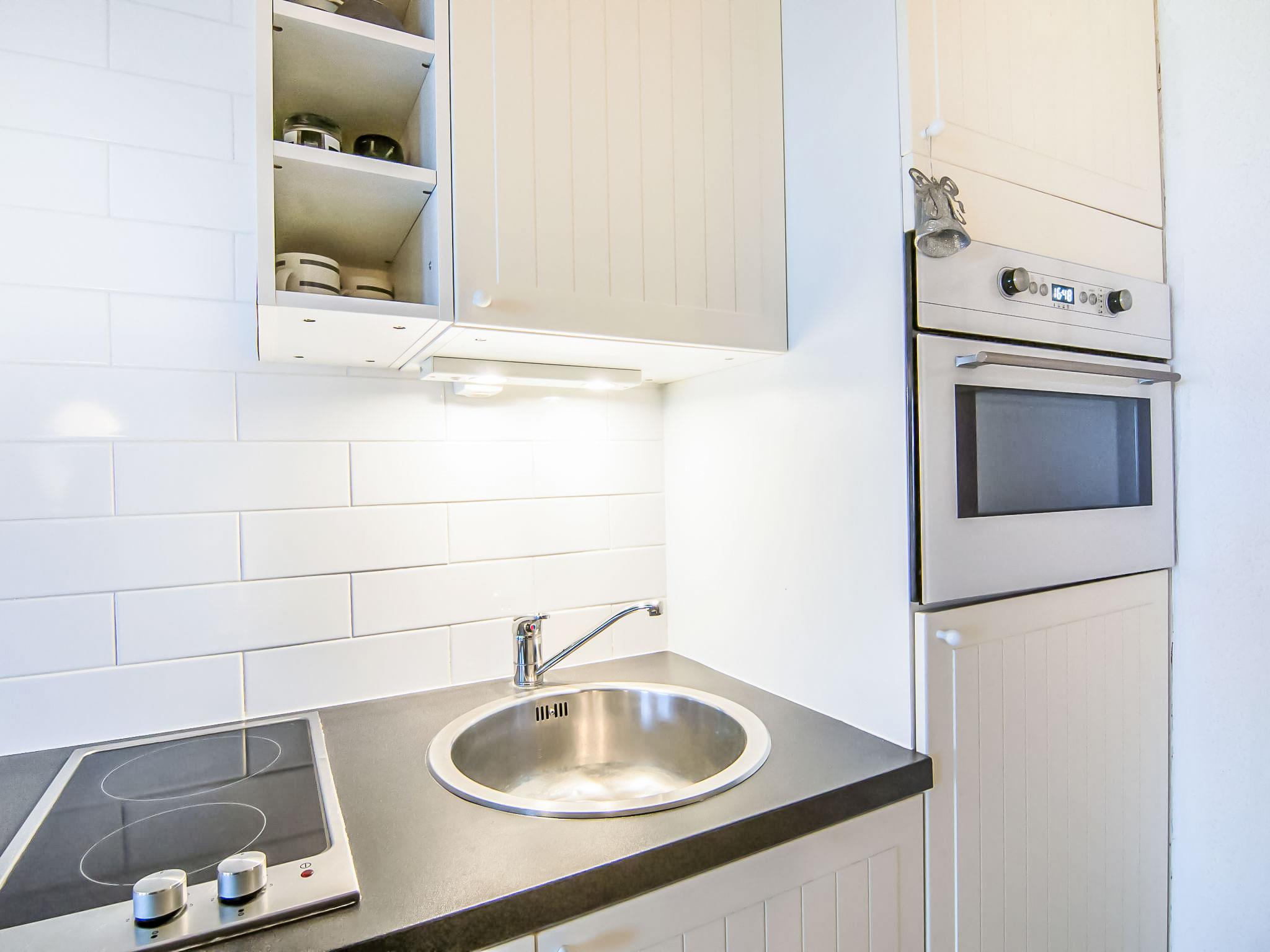 1-room studio 25 m2 on 5th floor, east facing position. Modern furnishings: entrance hall with 1 x 2 bunk beds (80 cm, length 180 cm). Living/dining room with 1 double sofabed (1 x 140 cm, length 190 cm), TV (flat screen), DVD. Exit to the balcony. Kitchenette (dishwasher, 2 ceramic glass hob hotplates, toaster, kettle, electric coffee machine, combination microwave). Bath/WC. Electric heating. Small balcony 2 m2. Balcony furniture. Beautiful view of the sea and the resort. Facilities: Internet (WiFi, free). Please note: smoke alarm. 14220 000121 J6