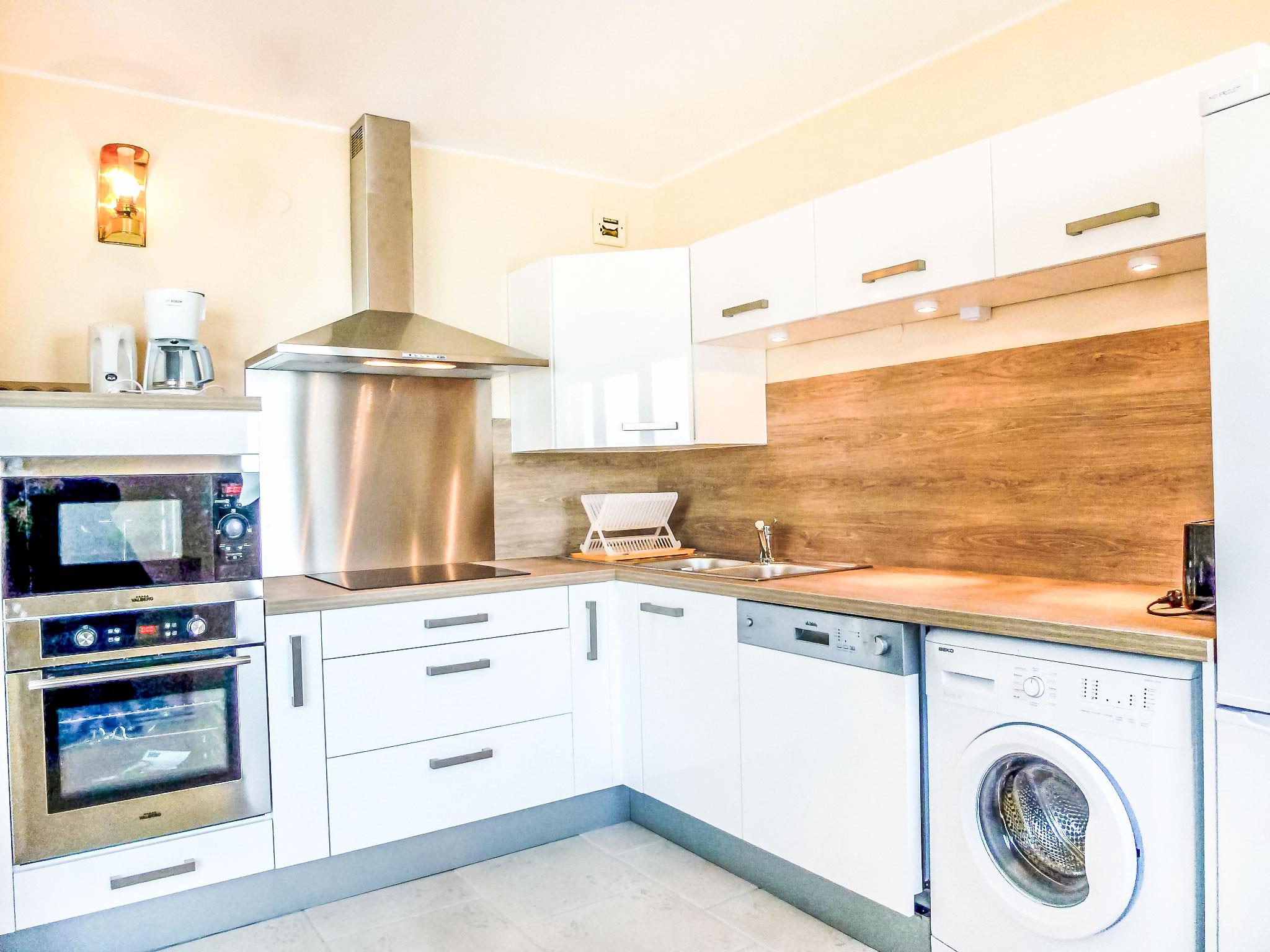 2-room apartment 70 m2 on 2 levels on 2nd floor. Entrance hall. Living/dining room with TV (flat screen). Exit to the balcony. Large, open kitchen (oven, dishwasher, 4 ceramic glass hob hotplates, toaster, kettle, microwave, freezer, electric coffee machine). Shower/WC. Upper floor: open walk-through room with 3 beds (90 cm). 1 room with 2 beds (90 cm). Exit to the terrace. Bath/WC. Electric heating. Balcony 2 m2, west facing position and north facing position, terrace 3 m2, south facing position and, east facing position. Very beautiful view of the sea. Facilities: washing machine, iron. Internet (WiFi, free). Garage (1 car), height 180 cm, width 245 cm. Please note: non-smokers only. Smoke alarm. 14715001144XH