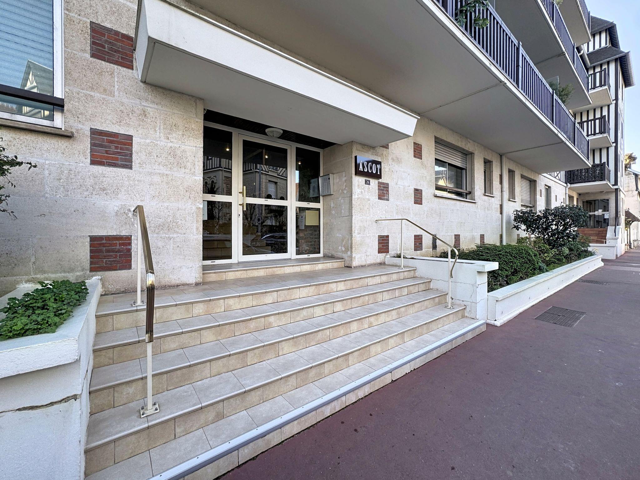 Deauville: Residence "Ascot", 4 storeys, terraced. In the resort, 350 m from the centre, in a quiet position, 1.4 km from the sea, 1.4 km from the beach, east facing position. In the complex: lift. (6 steps). Shop 350 m, supermarket 280 m, restaurant 100 m, bakery 60 m, 4 minute walk to the centre, bus stop "Gare routière" 500 m, railway station "Deauville-Trouville" 500 m, sandy beach "les planches de Deauville" 1.4 km, indoor swimming pool 1.1 km, thermal baths "thalasso de Deauville" 1.1 km. Golf course (18 hole) 3.7 km. Nearby attractions: casino de Deauville 1 km, hippodrome Deauville La Touques 1.2 km, Honfleur village normand 16 km, Mémorial de Caen 54 km, Arromanches plage du débarquement 80 km. The keys‘ handover takes place by the agency Interhome in Deauville.