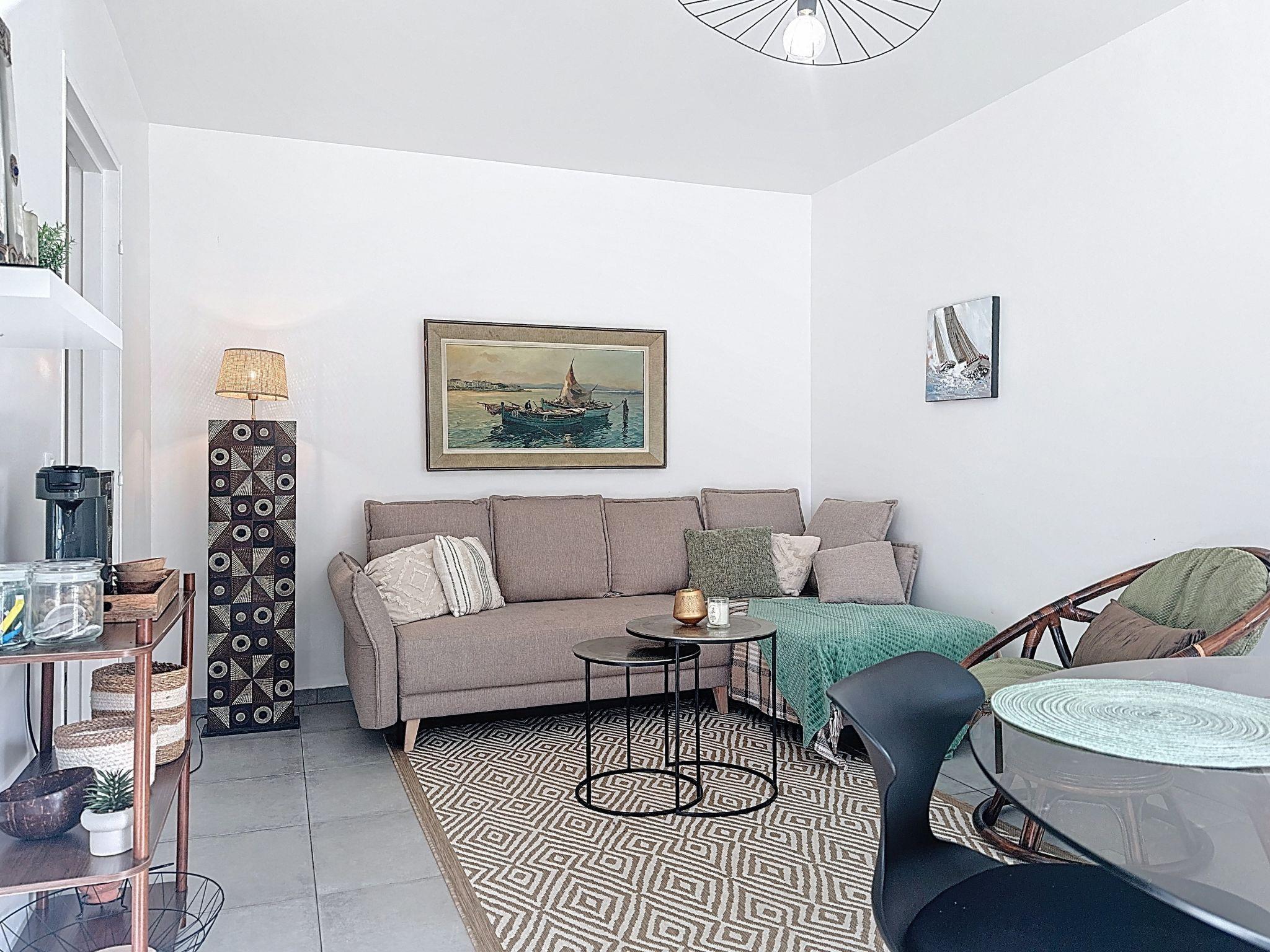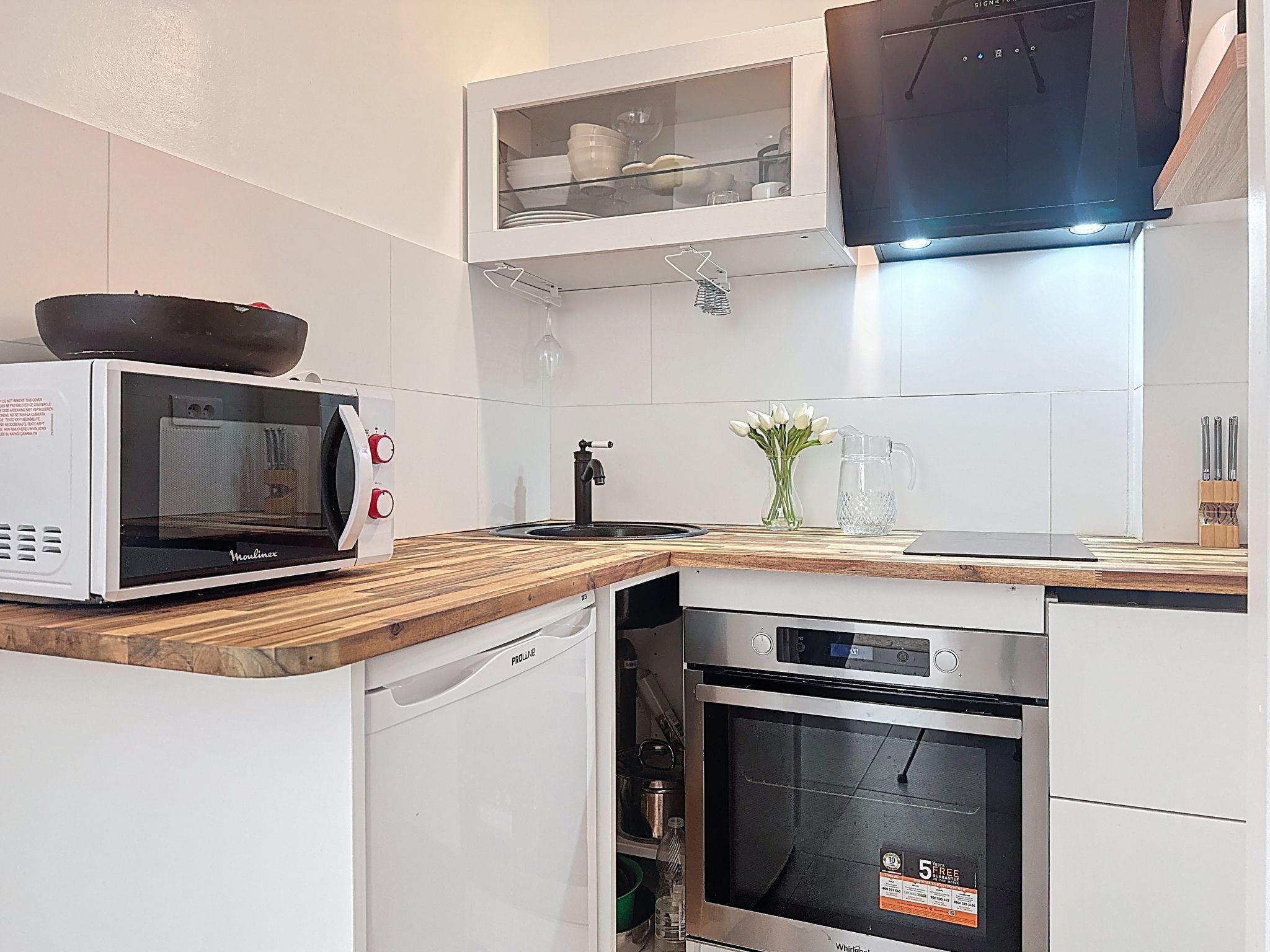 2-room apartment 35 m2, on the upper ground floor. Comfortable and modern furnishings: small entrance hall. Living/dining room with 1 double sofabed (1 x 140 cm, length 190 cm), TV. Exit to the patio, south facing position and west facing position. Kitchenette (2 ceramic glass hob hotplates, toaster, kettle, microwave, electric coffee machine). Shower/WC. Electric heating. Facilities: Internet (WiFi, free). Please note: non-smokers only, no parking. Smoke alarm. 142200014359W
