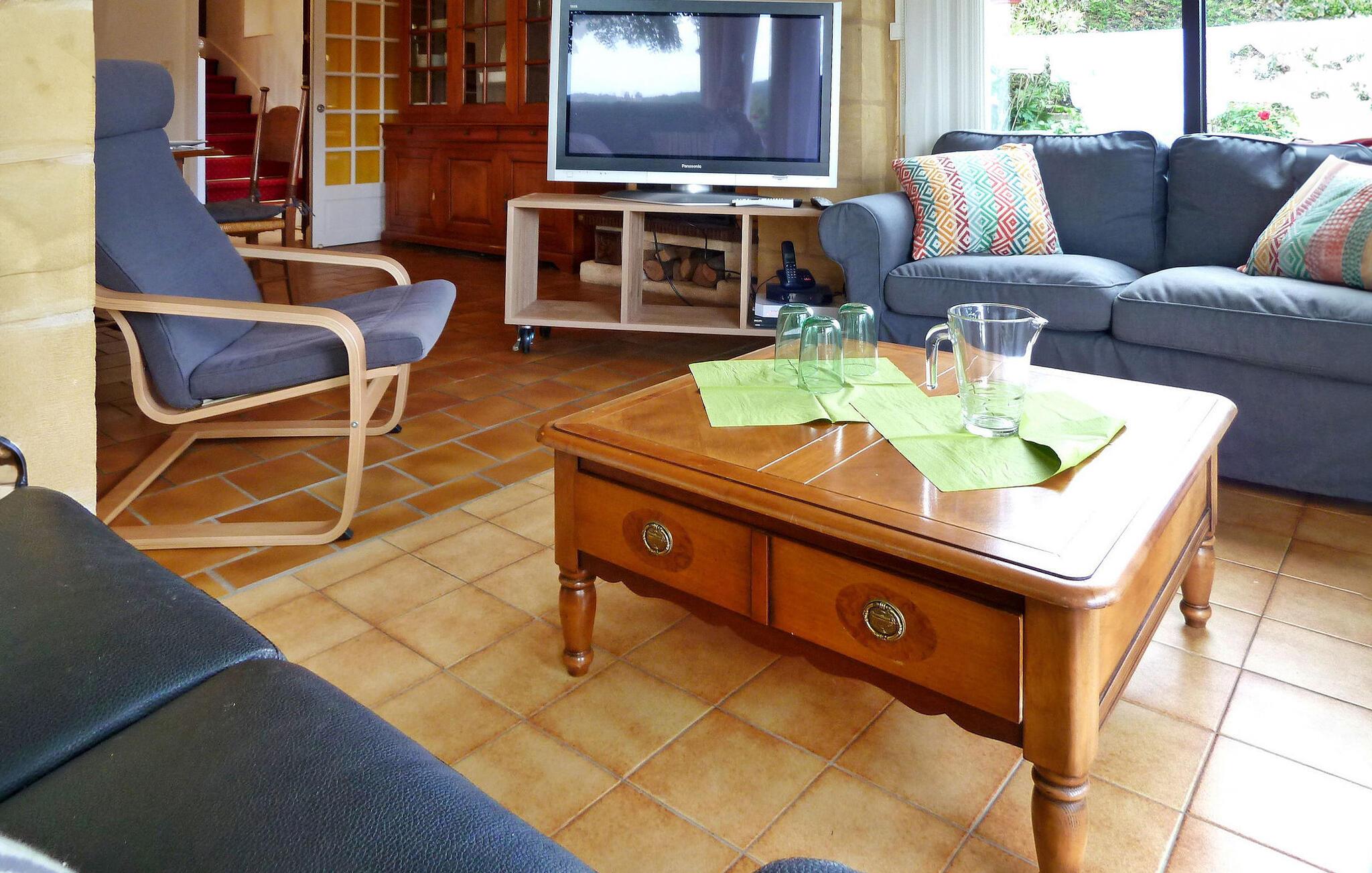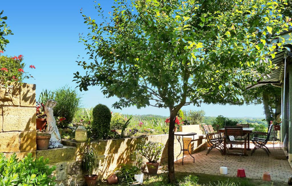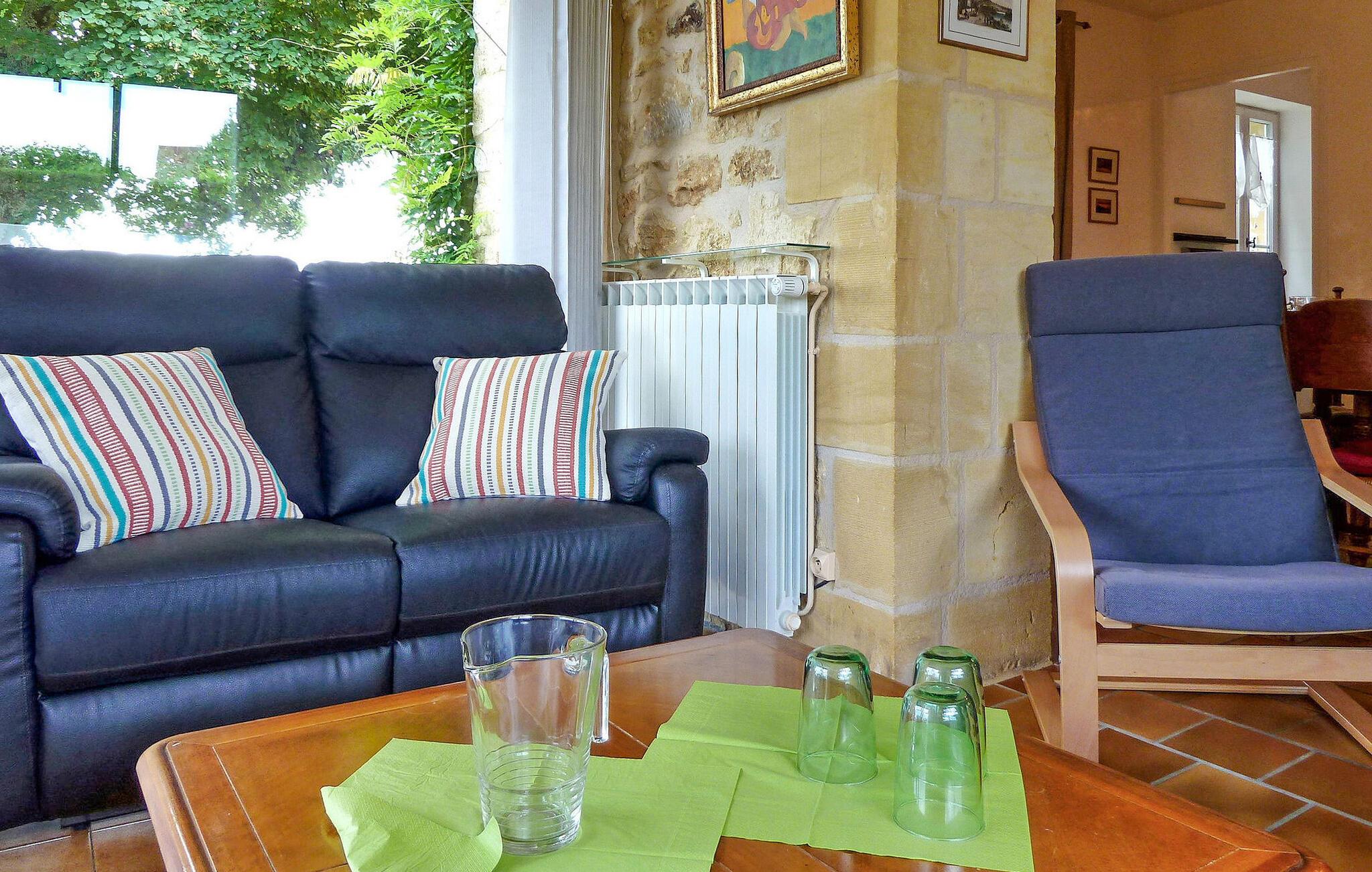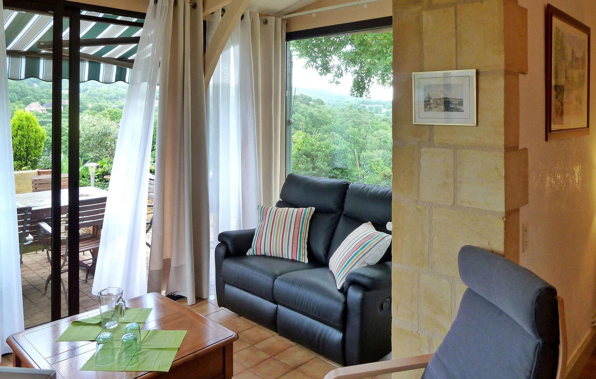 Dette stenhus ligger i Domme, en middelalderby lige uden for det livlige turistcentrum. Huset har aircondition og en terrasse med en fantastisk udsigt, og den nærliggende Dordogne-flod er perfekt til kanosejlads og svømning. Ejendommens stueetage omfatter et veludstyret køkken og indbydende stue/spisestue med hjørnepejs, et komfortabelt opholdsområde med fladskærms-tv og et soveværelse med eget badeværelse. Karnapper fører til den udendørs terrasse, der byder på fængslende udsigter. På første sal er de resterende soveværelser. Udenfor byder ejendommen på en charmerende have prydet med træer, blomster og en velplejet græsplæne sammen med liggestole til afslapning. Den brolagte terrasse har udendørs møbler og panoramaudsigt. Huset ligger i middelalderbyen Domme, ikke langt fra landsbyens centrum. Butikker, butikker og restauranter ligger i gåafstand. Domme: Royal Bastide fra det 13. århundrede med den mest berømte udsigt over Périgord, med udsigt over Dordogne-flodens dal. Dordogne-floden med dens kanoer ligger cirka 3/4 km væk. Bemærk venligst, parkering er tilgængelig på gaden, men ikke inde i ejendommen. Alle soveværelser og stuen har aircondition for ekstra komfort.