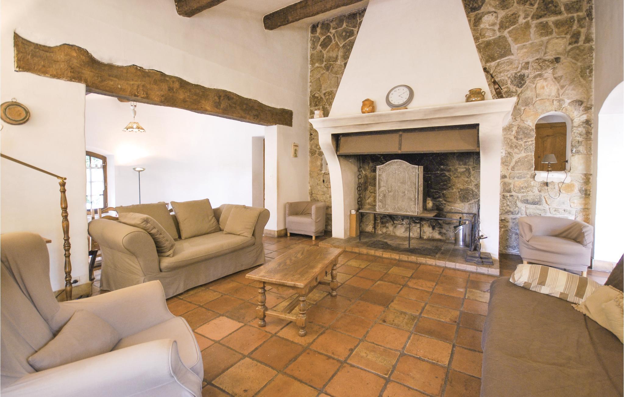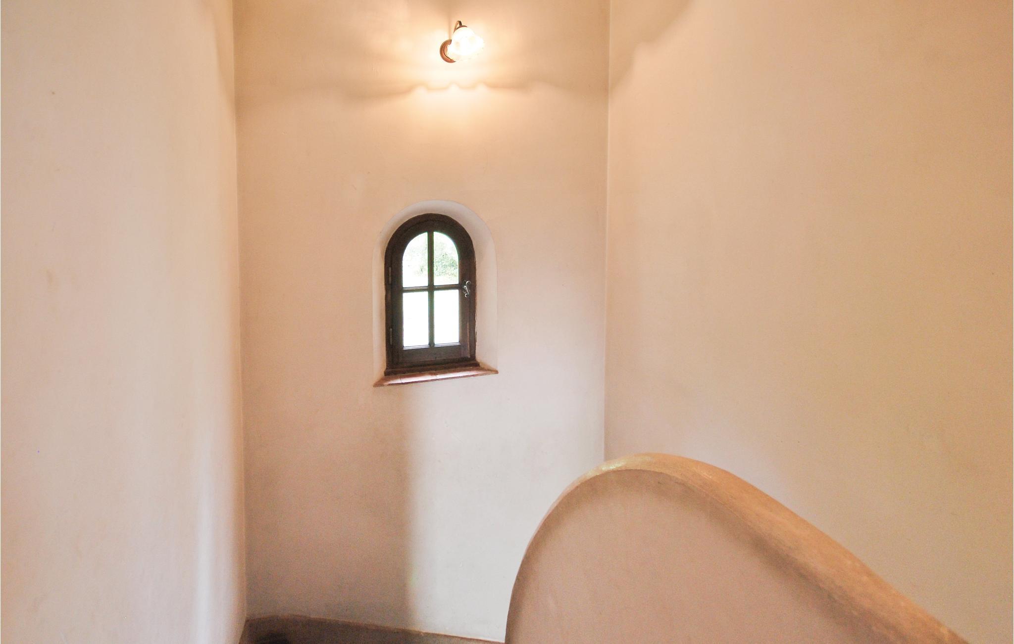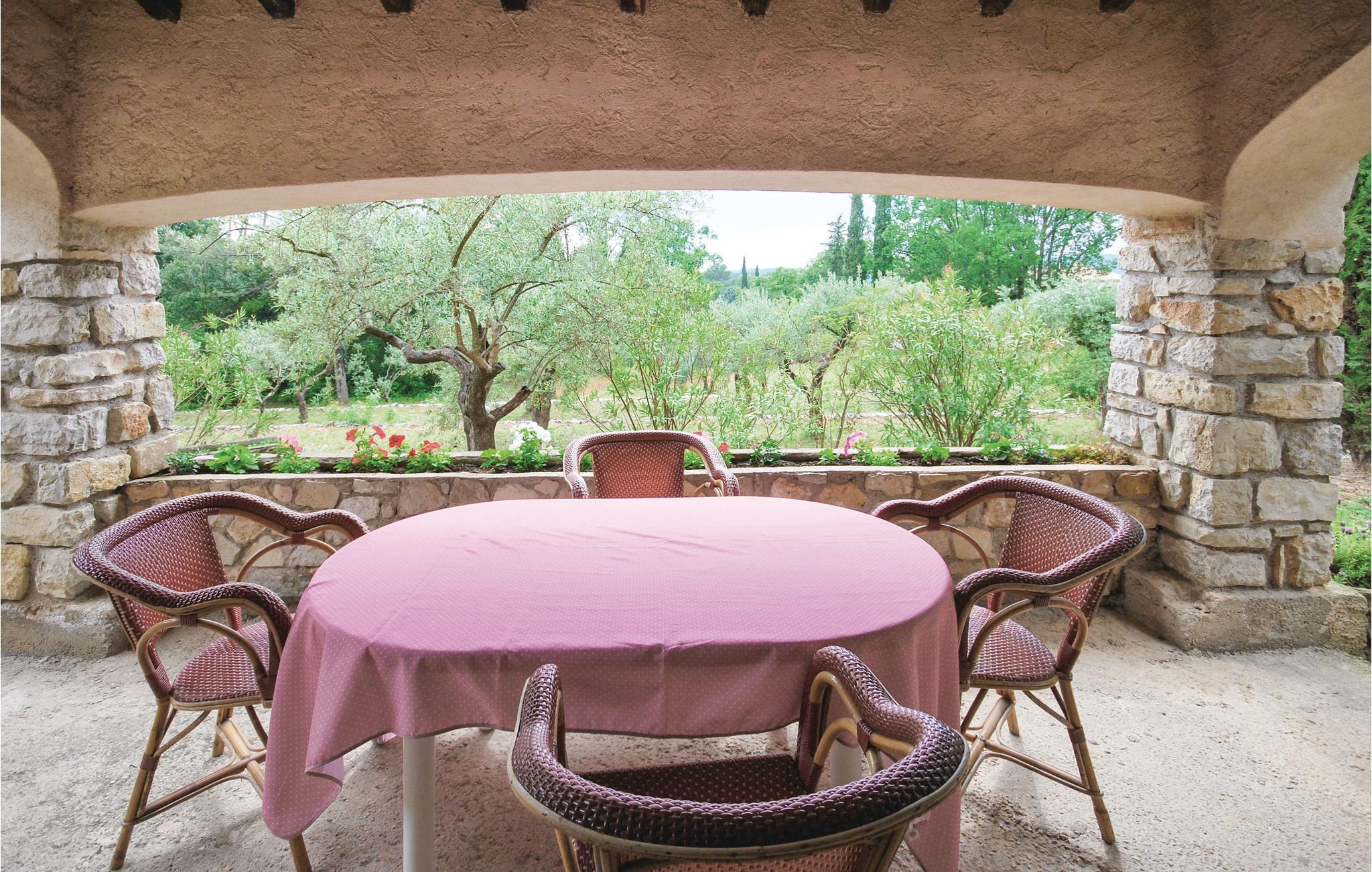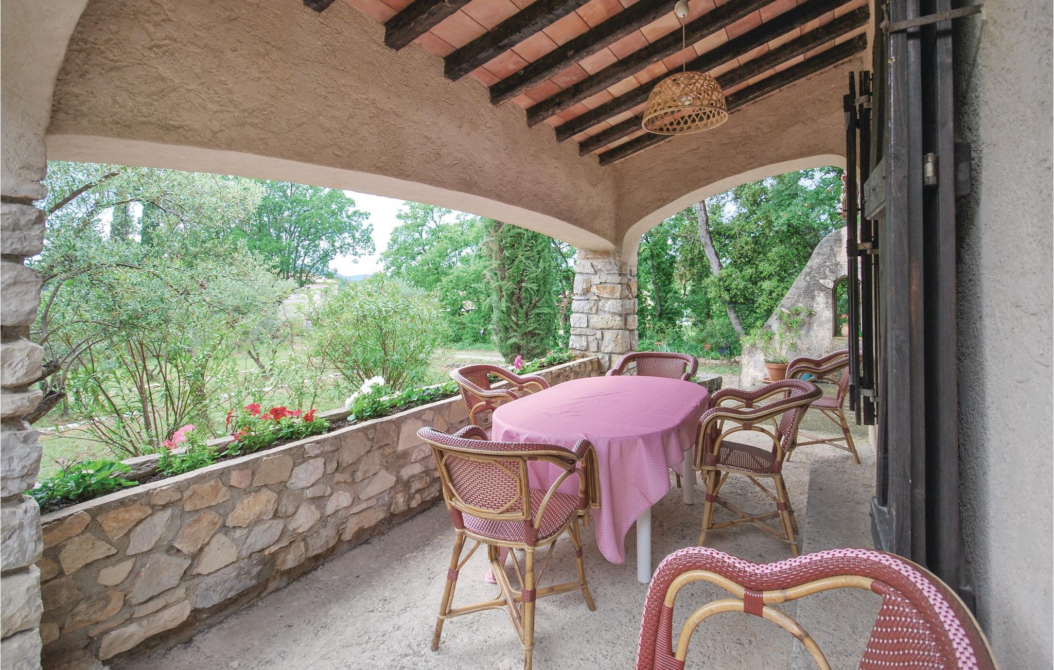 Dette stenhus ligger på en terrasseformet anlagt grund omgivet af træer. Stuen med sin store kamin byder på en enestående atmosfære, som man kun finder i denne bygning. Det 3. soverum i øverste etage råder over eget bad og en lille terrasse, hvor I kan sole jer. Stuen og spisestuen har direkte udgang til en overdækket terrasse, hvorfra I kan nyde den herlige udsigt til cikadernes sang. Her er I på landet i fred og ro og alligevel ikke langt fra byen og dens tilbud.