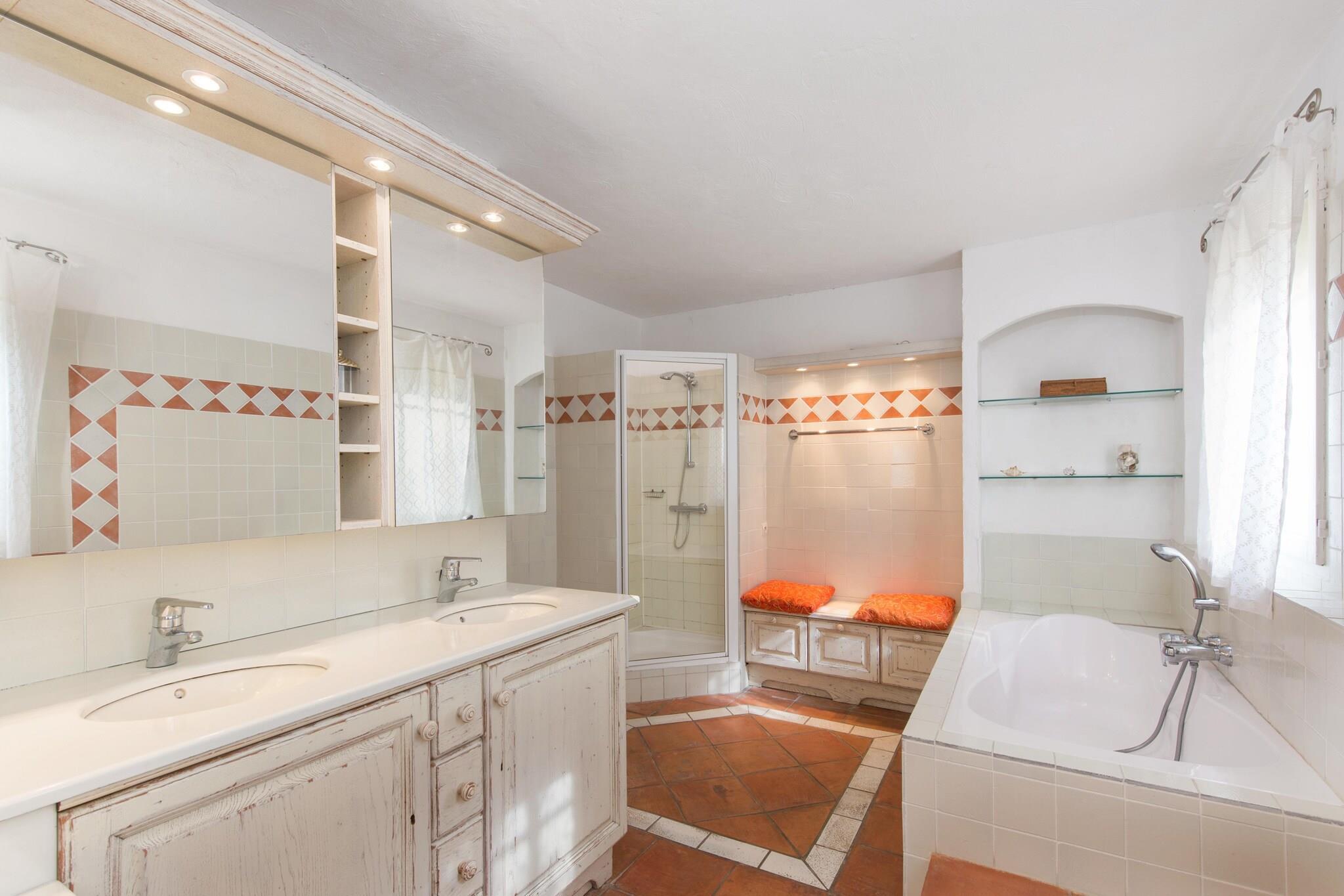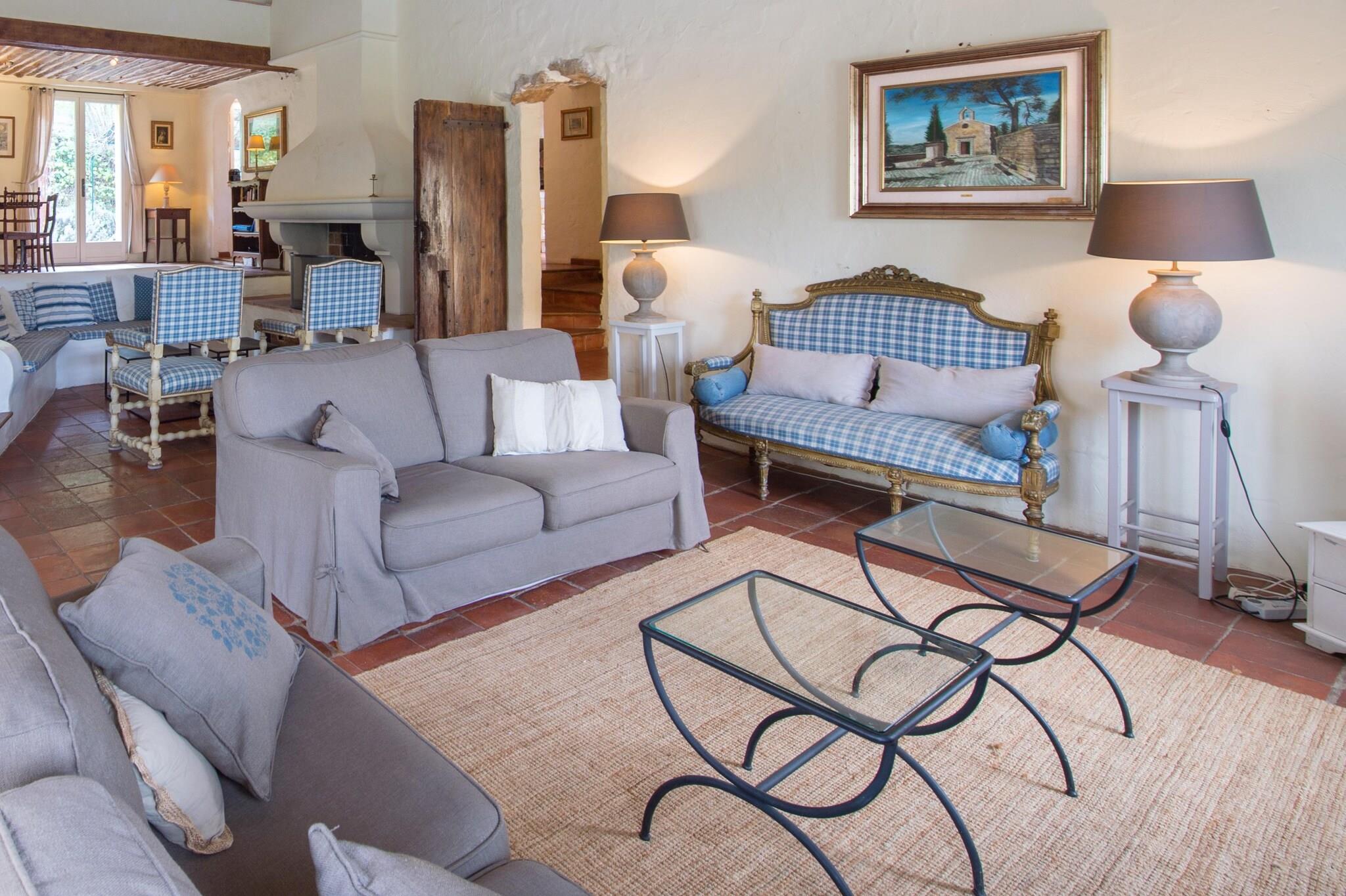 Denne rummelige villa på 350 m² udstråler autentisk provencalsk charme og er beliggende i en fantastisk ejendom på 6.000 m², kun 30 km fra Fréjus og Saint Raphaël og kun 7 minutters kørsel (12 km) fra Les Arcs-Draguignan station. Interiøret har terracotta-flisegulve og regional-stil flisebelagte køkkener og badeværelser, forstærket af antikke møbler og smukt malede garderobeskabe, der tilføjer karakter og varme. Med fem generøst store soveværelser - tre airconditionerede og to i et anneks med ventilatorer - kan villaen komfortabelt rumme familier eller grupper, der søger et roligt tilflugtssted. Flere terrasser omgiver huset, møbleret med store borde, lænestole og en smedejernslounge, der tilbyder skyggefulde steder hele dagen. Midtpunktet er en børnesikret, saltbehandlet swimmingpool (9 x 5 m) placeret på en blomsterfyldt terrasse lige under huset. Her indbyder liggestole, et sommerkøkken, spiseborde og en grill til at slappe af og underholde. Ejendommen er omgivet af frodigt middelhavsgrønt, herunder oliventræer, oleandere og plataner, og lover fred, privatliv og en ægte smag af det sydlige Frankrig.