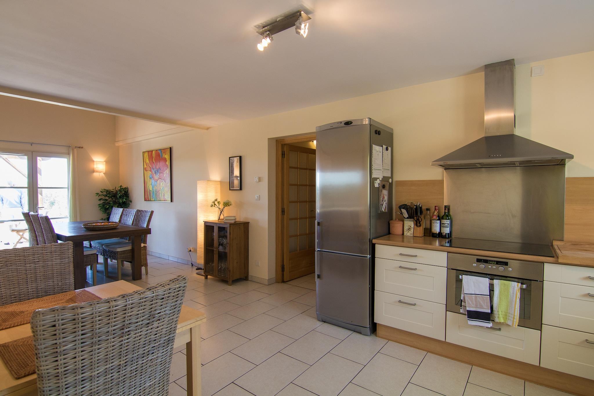 Stueetage: (Indgang , åbent køkken(komfur(Komfur med fire kogeplader, induktion), kaffemaskine, espressomaskine, combi-mikroovn, opvaskemaskine , køle-fryseskab), stue / spisestue(kakkelovn(træ)), soveværelse(2x enkeltseng(Dyne, syntetiske)), soveværelse(dobbeltseng(to enkeltdyner, syntetiske)), soveværelse(2x enkeltseng), badeværelse(badekar, bruser, 2x håndvask, toilet), toilet, bryggers(tørretumbler, vaskemaskine)) På 1. etage: (sofastue(Fjernsyn(parabol, Hollandske TV-kanaler, Internationale TV-kanaler), DVD-afspiller), badeværelse(bruser, håndvask, toilet)) carport, mikrobølgeovn, badekar eller bruser, varme(elektrisk), terrasse(privat, overdækket), have(privat), havemøbler, 6x havemøbler, grill, liggestole, Parasol, swimmingpool(privat, opvarmet, indhegnet, 8 x 4 m., opened from 1/2 May upto and including 1/2 Oct), petanquebane, barneseng(på anmodning), barnestol