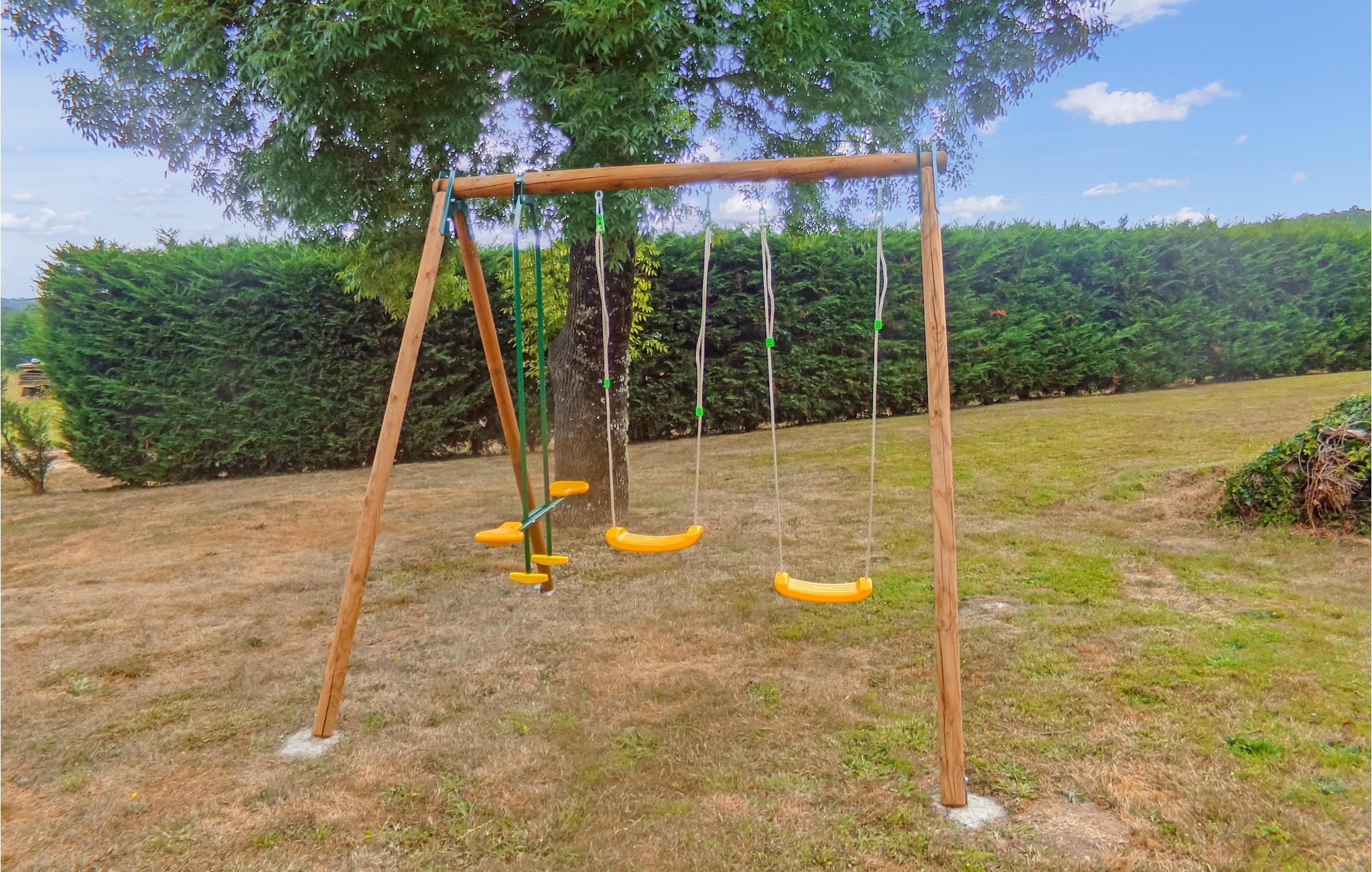 Udendørsområdet er vidtstrakt og byder på mange muligheder for både afslapning og aktiviteter. Den indhegnede pool sørger for en forfriskende dukkert på varme dage. Til børnene er der en gynge, mens I kan slappe af på terrassen under en parasol og nyde roen. De grønne enge og den nærliggende skov inviterer til afslappende gåture.